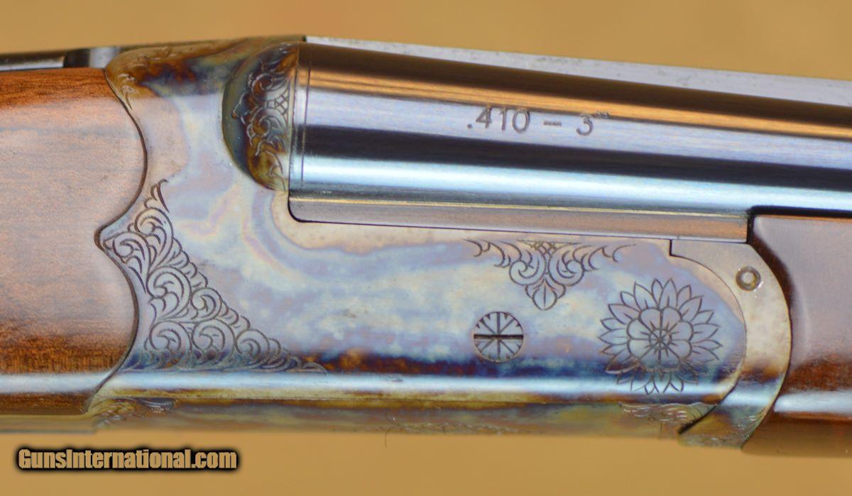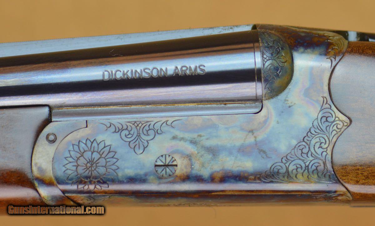 Description: New Dickinson Estate Game .410 Bore with 28" fixed (M/IM) chokes, solid checkered rib. Factory case-colored boxlock action featuring double triggers. Factory English straight-hand stock to checkered butt, Schnabel forearm. Includes factory case. SOLD |