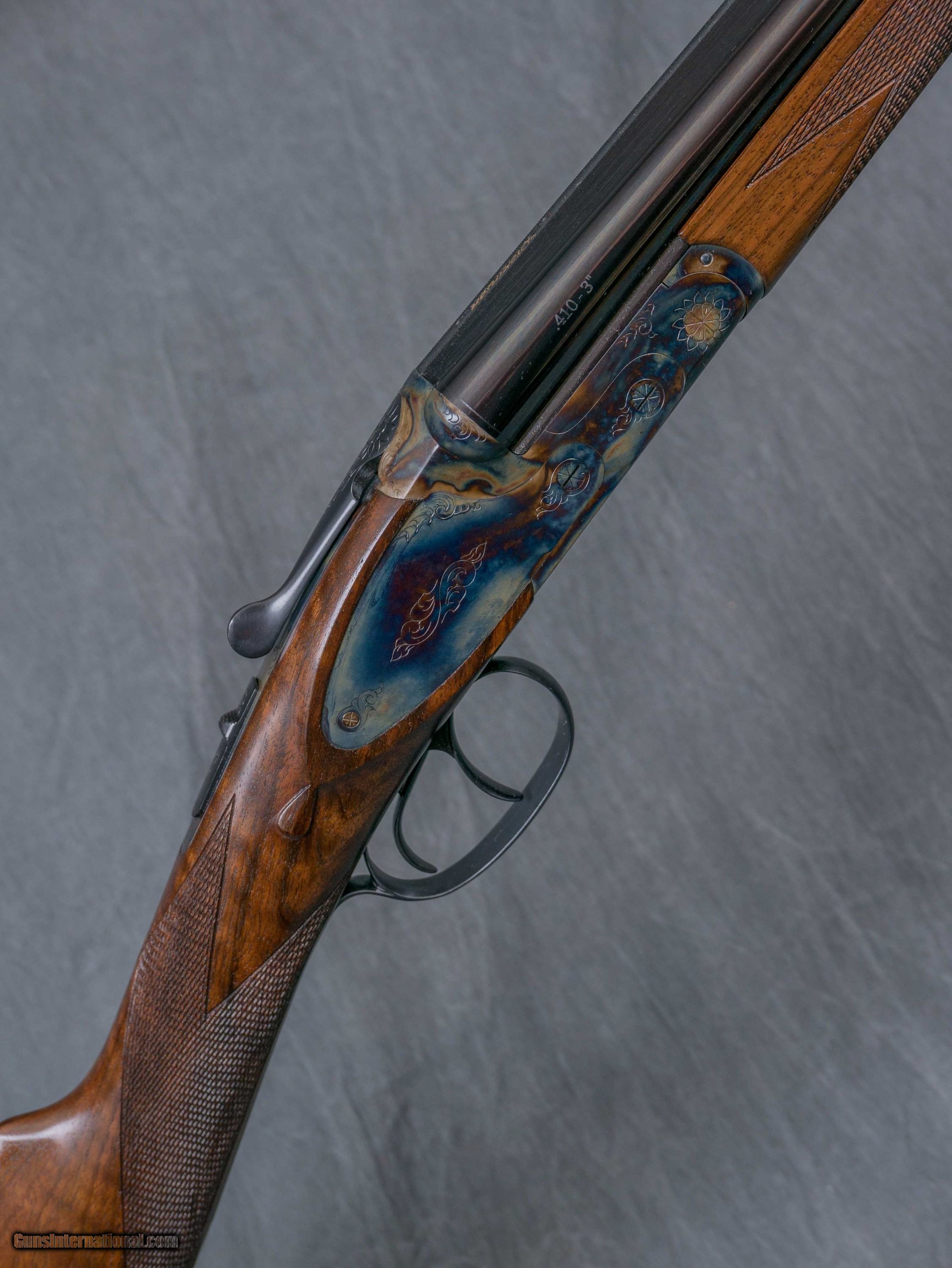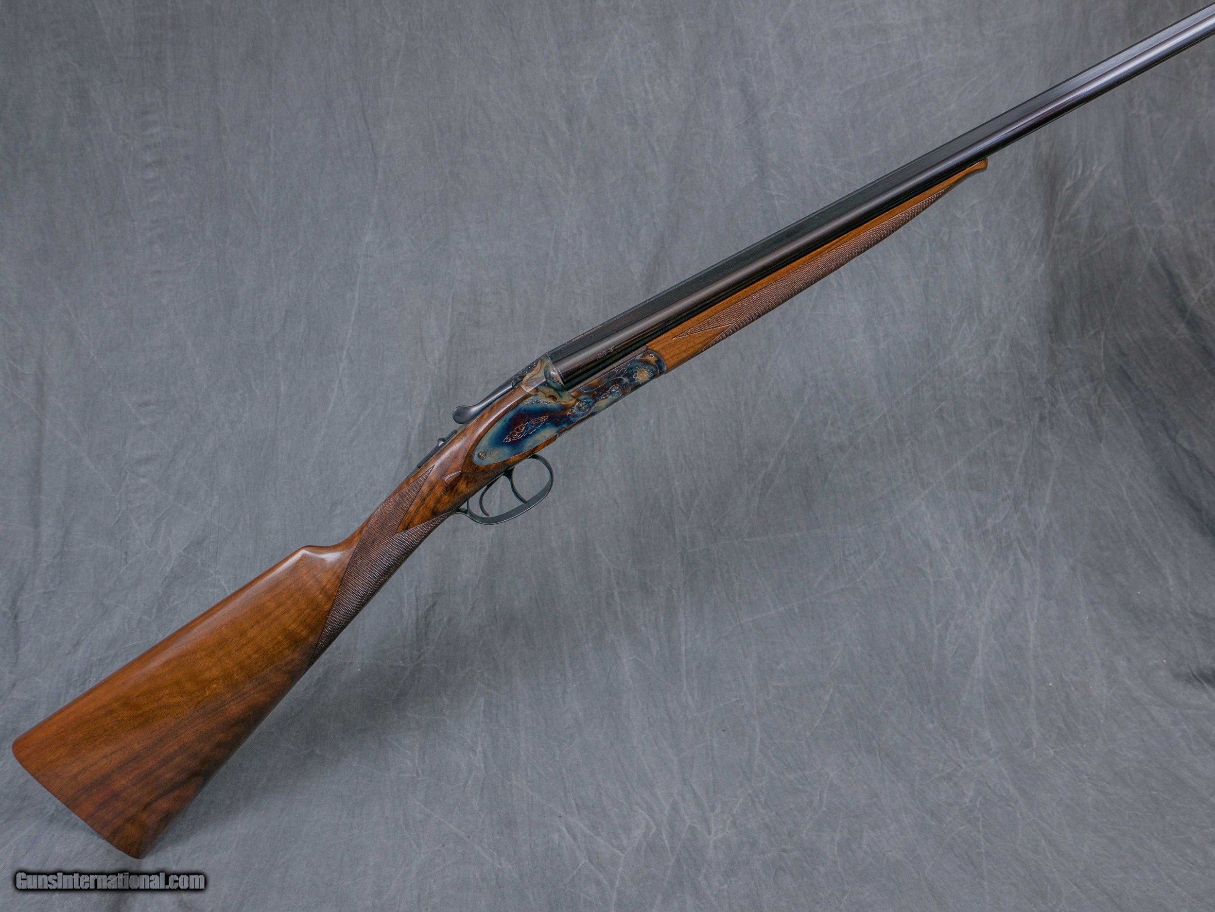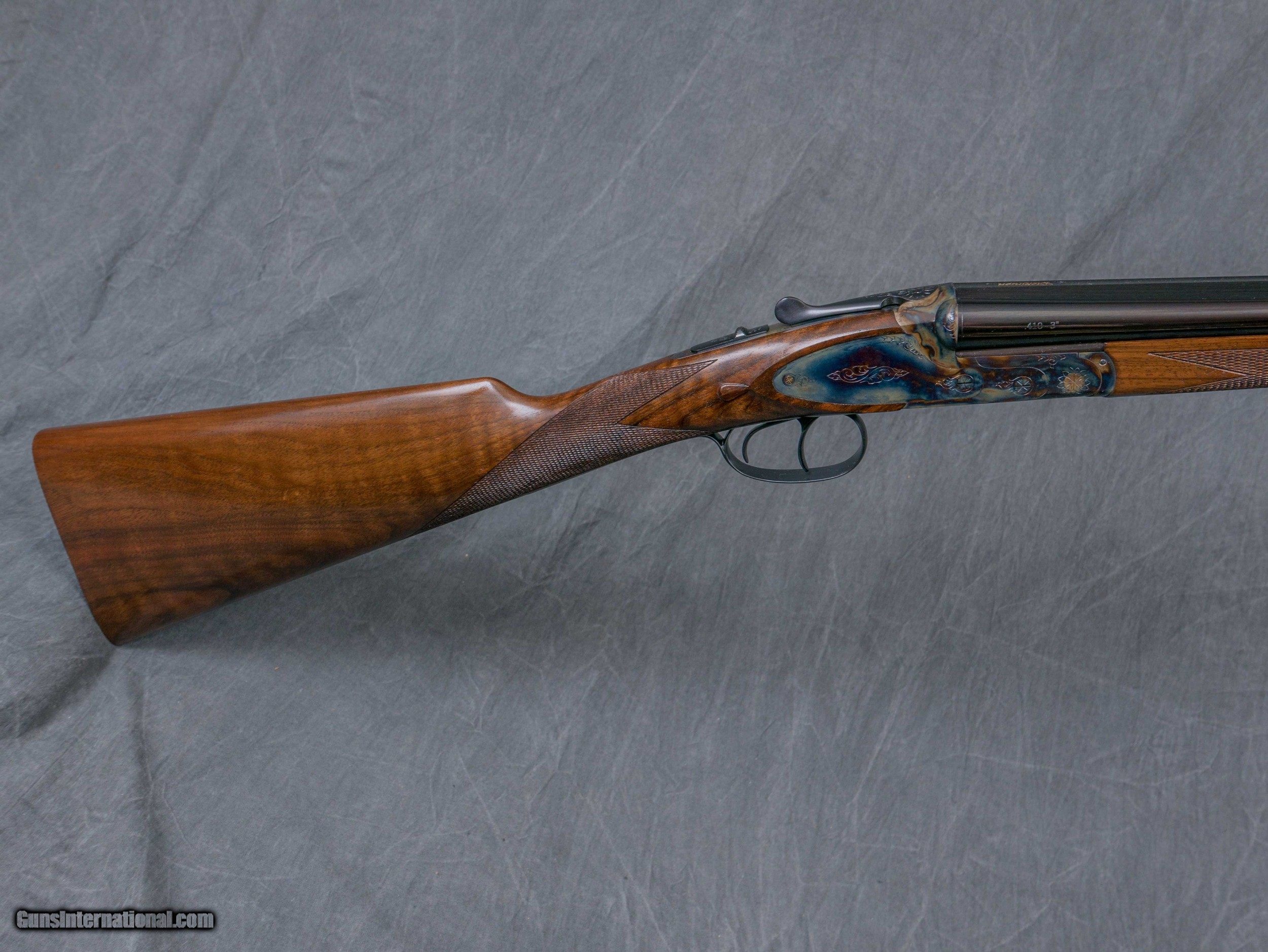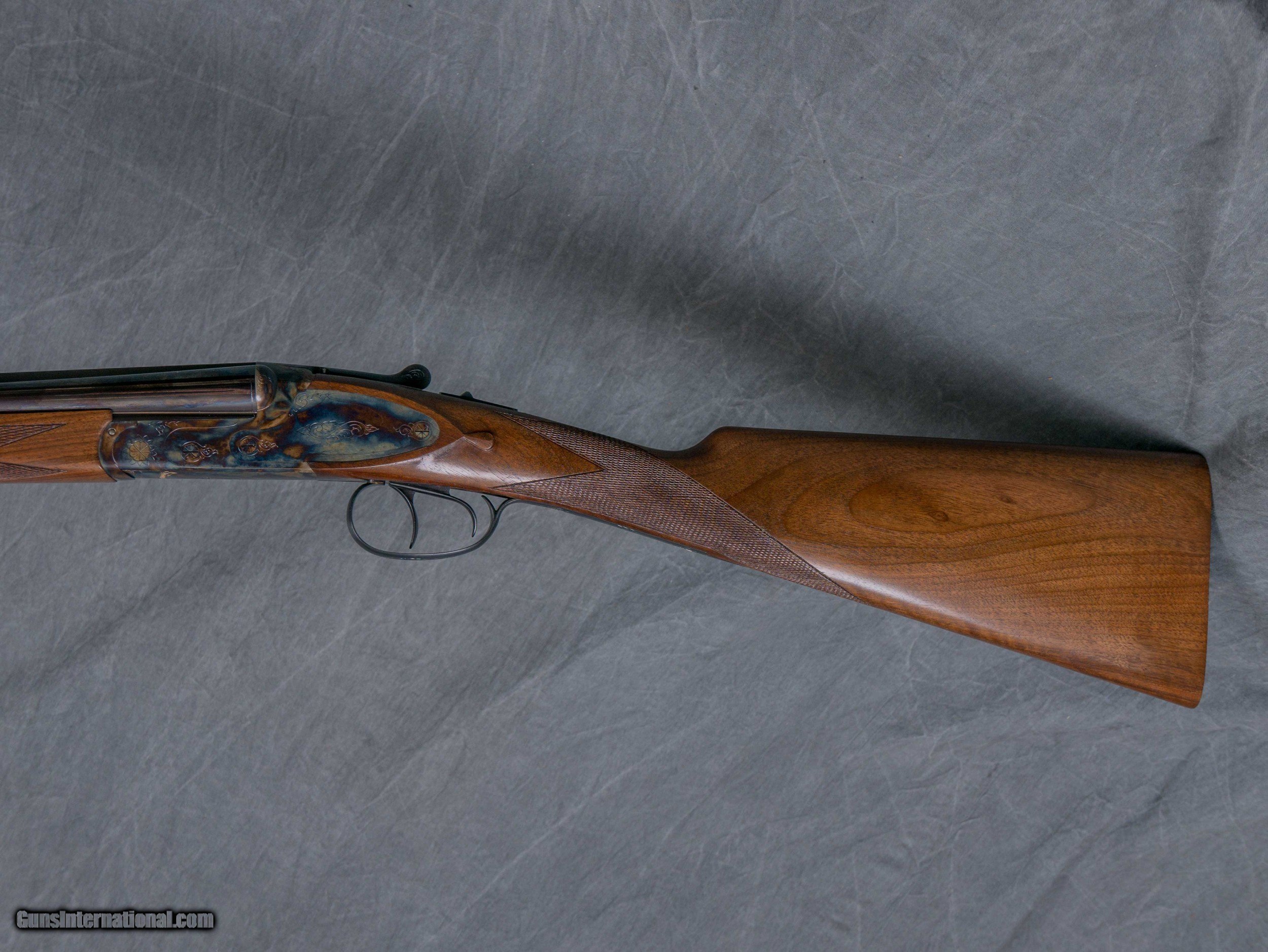 Description: Make:DICKINSON Model:PLANTATION Gauge/Caliber:.410 Chambers:2 1/2" & 3" Barrel Length:28" Rib Design:RAISED FLAT FILED Weight:5 lb. 6 oz. Bore/Chokes Right/Bottom:.010 / MOD Left/Top:.010 / MOD Stock Dimensions Drop At Comb:1 7/16" Drop At Heel:2 3/8" Length Of Pull:14 3/4" Pitch:3" / 6° Special Features: Bone & charcoal color case hardened scroll engraved sideplated action Chrome-lined bores Double triggers Automatic ejectors Manual safety Oil finished turkish walnut straight grip stock w/ checkered butt 10" extended schnabel forearm Made in turkey Condition: New w/ maker's case Serial #TRP1168 # N8134 Price: $ 2695 SOLD |