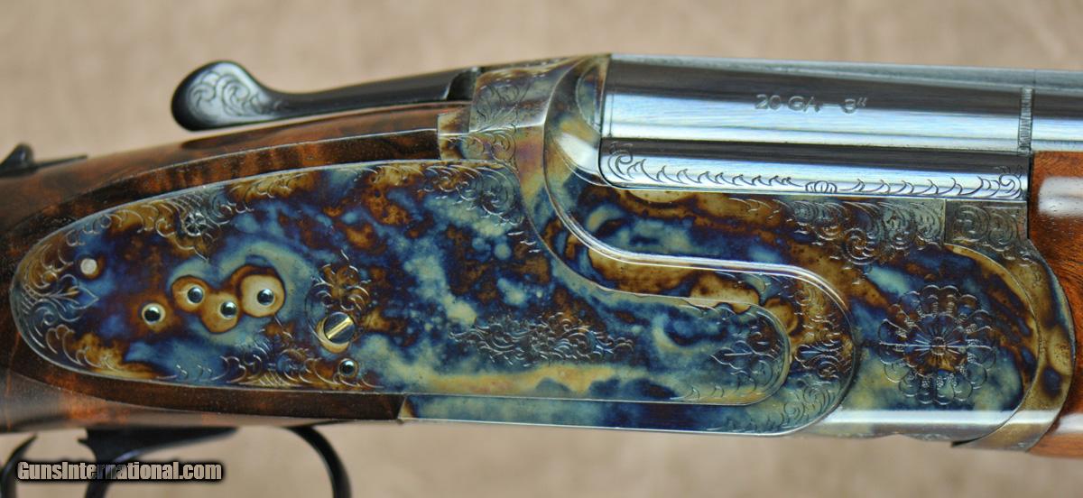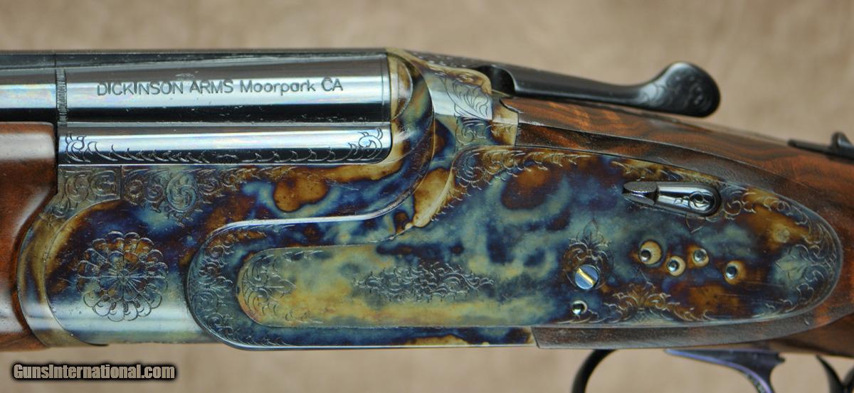 Description: New Dickinson Royal Side-Lock Ejector Game Gun 20GA with 30" factory choke tubed barrels (Teague Style Flush Chokes). Features Five-Pin Full Side-lock action with outstanding factory bone-charcoal case-color hardening. Prince of Wales pistol grip stock to checkered butt, schnabel forearm. Includes factory case, chokes. This is an outstanding side-lock game gun at an extremely affordable price. THIS GUN IS FEATURED AT OUR NEW MICHIGAN LOCATION. Toll free 888-474-0056, or 248-960-7262 SOLD |
