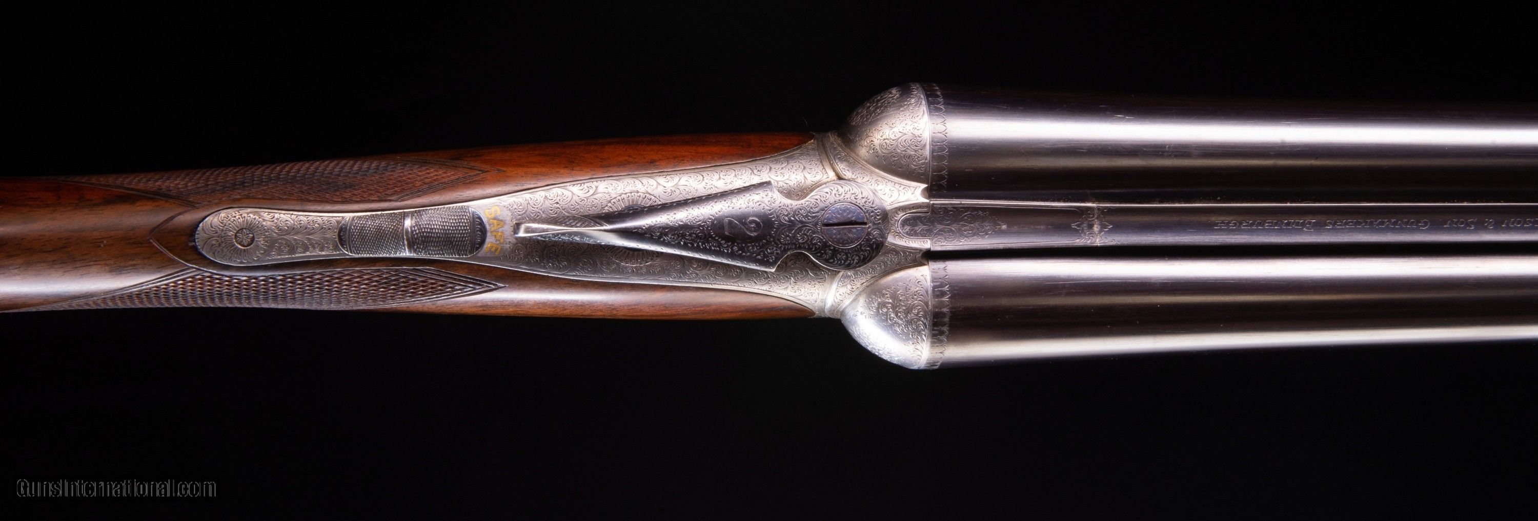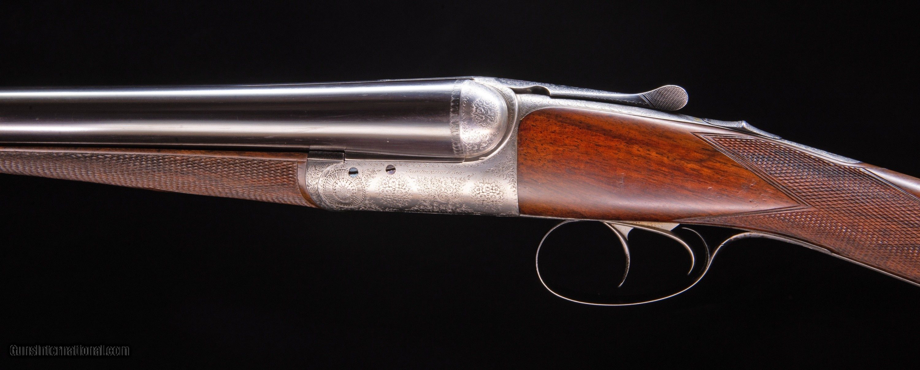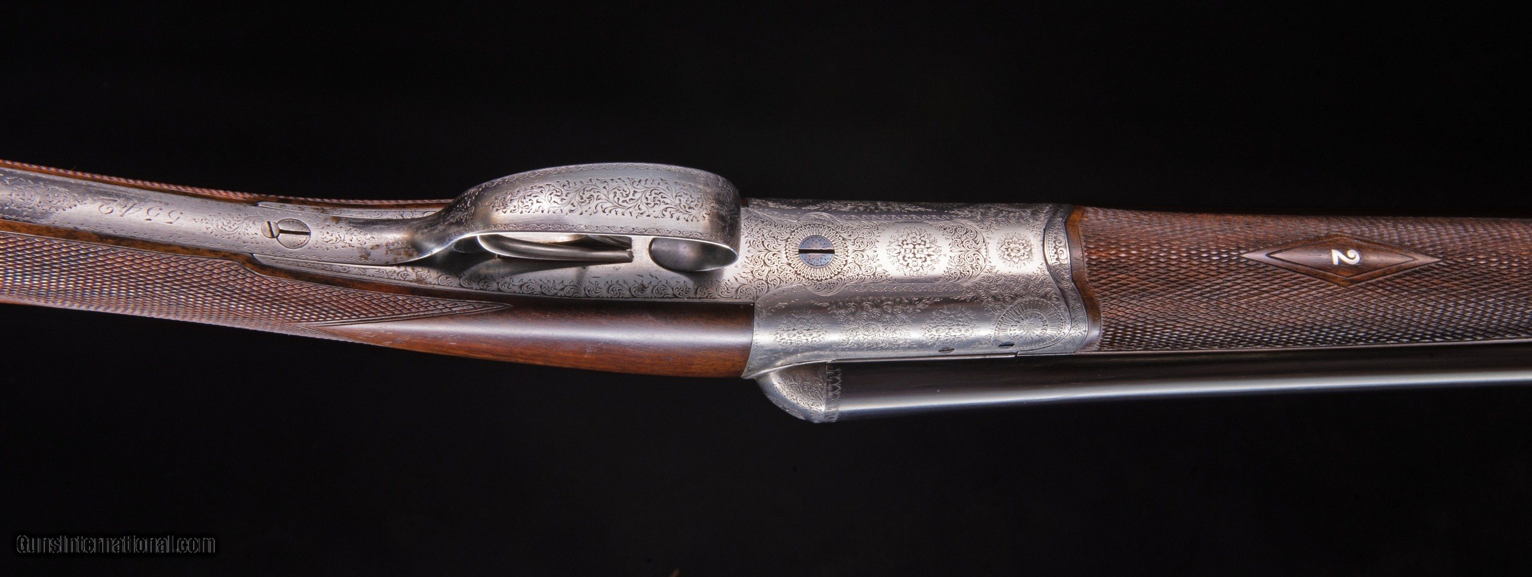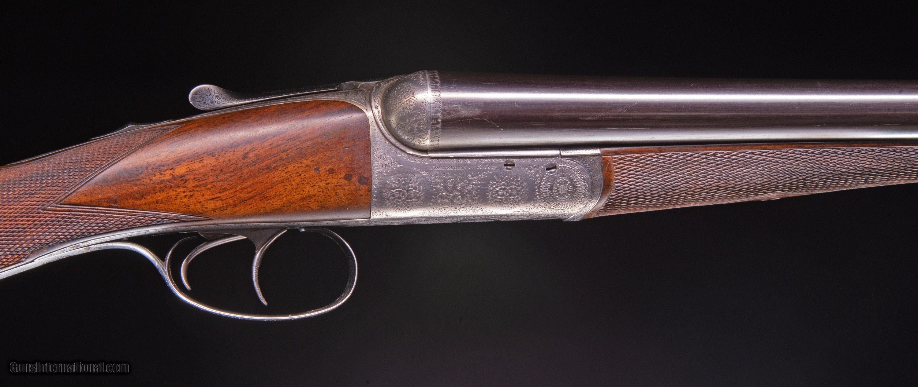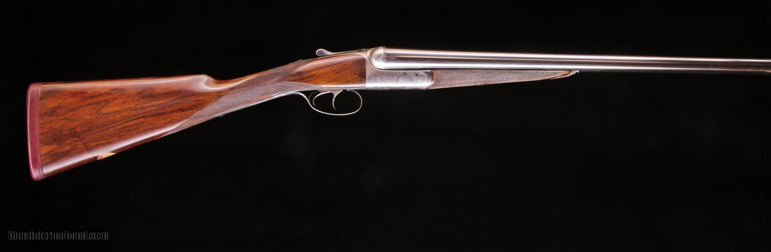 Description: 12 Gauge John Dickson & Sons Round Action Ejector Shotgun. Serial number 5542, originally built in 1903. One of 1937 made, according to historian Donald Dallas. Originally the second gun of a pair, with action and foreend marked as such. The 1036th gun built against Dickson patent 294, and so marked. Replacement 27 inch London proved barrels in excellent condition with bore measurements of .731 Right and .730 Left. Minimum wall thicknesses are .027 Right and .028 Left, with perfect upland chokes of .006 Right and .014 Left. Barrels bear London 1954-89 proof marks, and the 2 5/8 bores are proved at 2 1/2 inches (see photo 9). Stock measurements show DAC at 1 1/2 inches, DAH at 2 1/8 inches, and LOP of 14 1/2 inches. Measurement to end of wood is 13 5/8 inches. Stock is finished with leather pad. A thin pad spacer has been added to achieve the measured LOP (see photo 7). A very nice example of a rare and unique shotgun. Total weight is 6 pounds 7 ounces. Provided with "worry-free" barrels in prime shooting configuration. Tested with RST #5s on Prairie Grouse and Pheasant this past season with splendid results. Willing to discuss reasonable offers. Specific photos or a photo zip file available to seriously interested parties. Shipping USPS Priority to CONUS FFL locations only, for fixed rate of $100. Shotgun may also be retrieved from current location in Nashville, Tennessee. Thank you for your consideration. SOLD Shotgun Gauge: 12 Gauge Manufacturer: John Dickson & Son Model: Round Action Double Serial Number: 5542 Bore: 12 gauge Chambers: 2 5/8 Condition: excellent Barrel Type: SxS Triggers: Double Stock: Straight Stock Comb: 1 1/2 inches Stock Heel: 2 1/8 inches Butt Pad: Leather LOP: 14 1/2 inches Finish: Oil Weight: 6 lb 7 oz Manufacture Date: 1903 Choke Left: LM (.014) Choke Right: IC (.006) Proof:Nitro: 2 1/2 - 3 Tons Minimum Wall Thickness Left: .028 Minimum Wall Thickness Right: .027 |