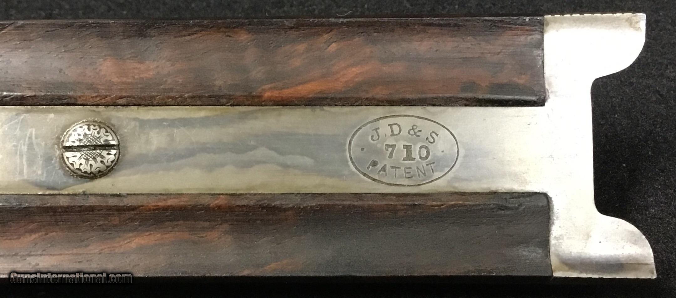 Description: John Dickson & Son Self-Opener Round Body Game Gun. Sn# 50xx. Circa 1900. 12ga. 29" 1 1/8 oz. Nitro proofed tight pattern damascus barrels. Top game rib marked "John Dickson & Son 63 Princes Street Edinburgh" and "1". Double underlug & third fastener locking system. Choked IC/M. Wall thickness: .028"/.022". 2 3/4" chambers. 100% fine and full coverage scroll engraved patented round body boxlock receiver. Rare variation with large name marked panels "JOHN DICKSON & SON PATENT" on both frame sides. Automatic safety with "SAFE" in gold. Double triggers. Nicely figured hand rubbed oil finish english walnut straight grip and splinter forend stock. Checkered butt. LOP: 14 1/2" x 1 3/8"DAC x 2 1/8" DAH x 1/4" Cast off. Weight: 6lbs 4oz Condition: Gun is in very nice overall original condition. Barrels retain most all original brown with miscellaneous light handling marks throughout. Bores are clean and bright. Barrels ring true. Engraving remains crisp throughout with softening on trigger guard tang. Traces of case color remain in protected areas. Stock finish is very good with scant handling marks. Checkering is very good and remains shaped. Gun tight and on-face. Ejectors in time. Gentlemen, this is a very desirable maker and worthy of your collection. Great dimensions and a pleasure to shoulder. The large side panel markings are not common and often sought after by Dickson collectors. Please call now on this fine gun! FFL required (C&R okay). Buyer to pay S/H/I fee SOLD Curio/Relic: Yes Manufacturer: JOHN DICKSON & SON Model: ROUND BODY SELF OPENER Chambers: 2 3/4 Ejectors: YES Condition: USED Barrels: 29 Barrel Type: DAMASCUS Action: BOXLOCK Triggers: DOUBLE Gauge Info: 12 Proof:Nitro: YES |