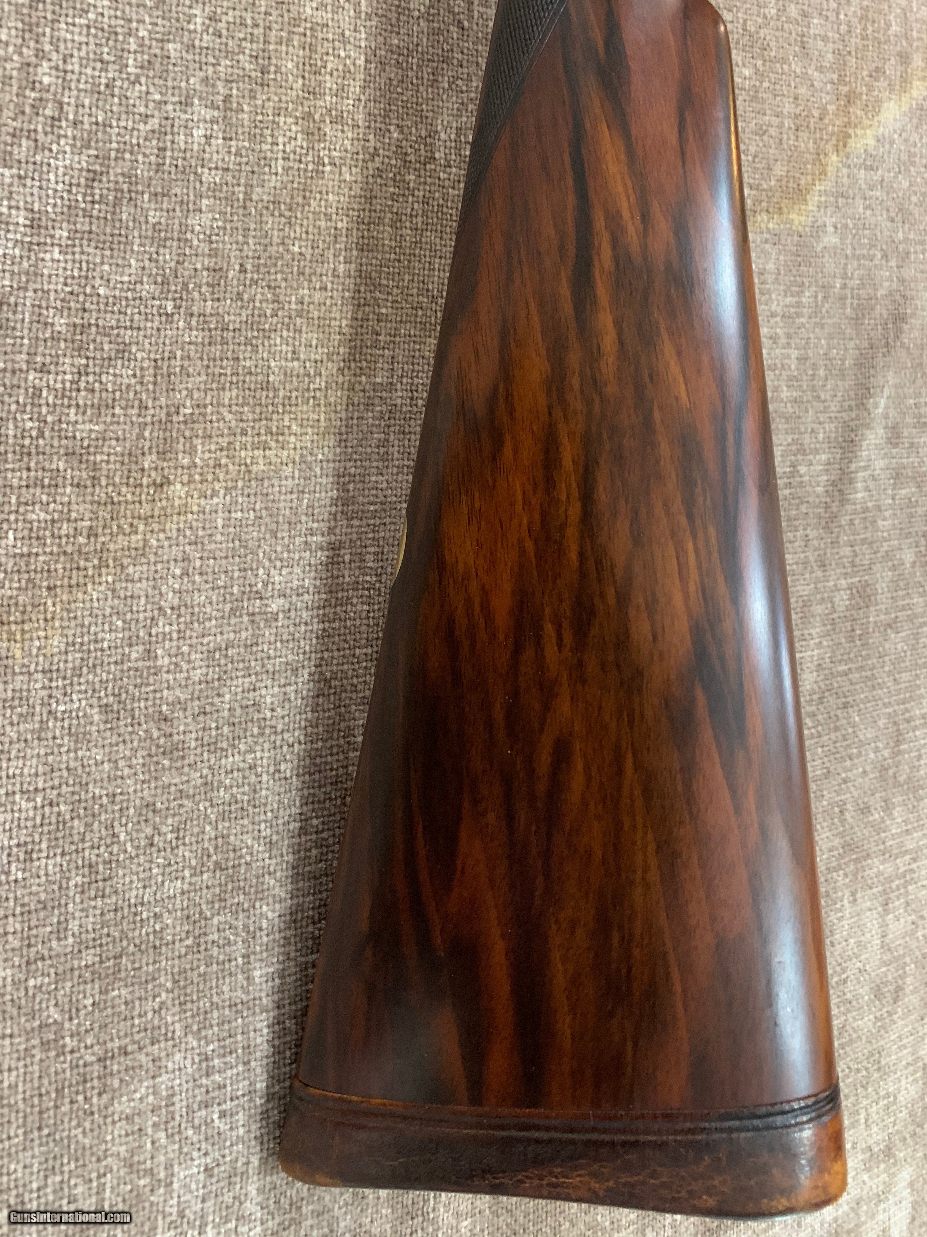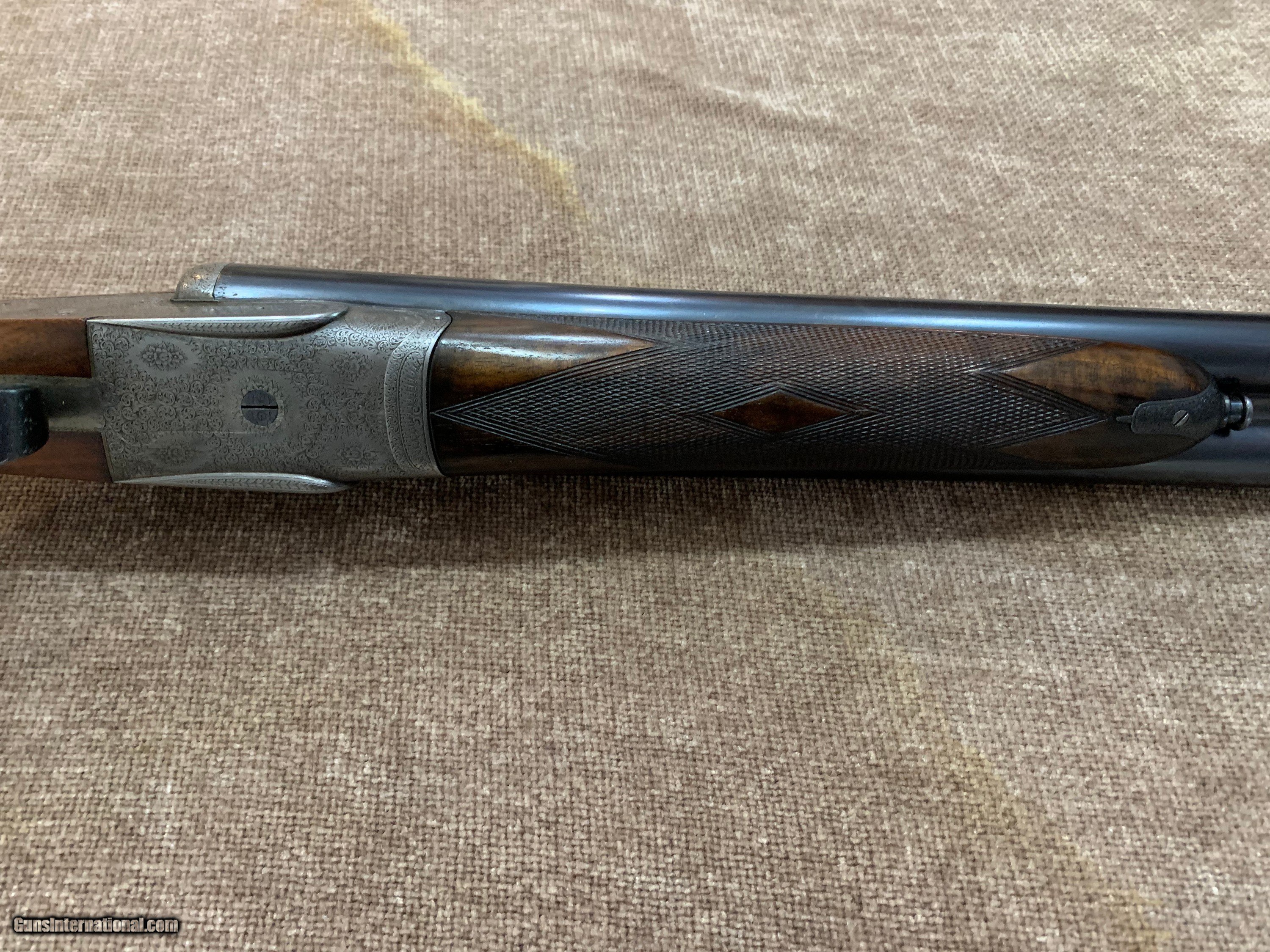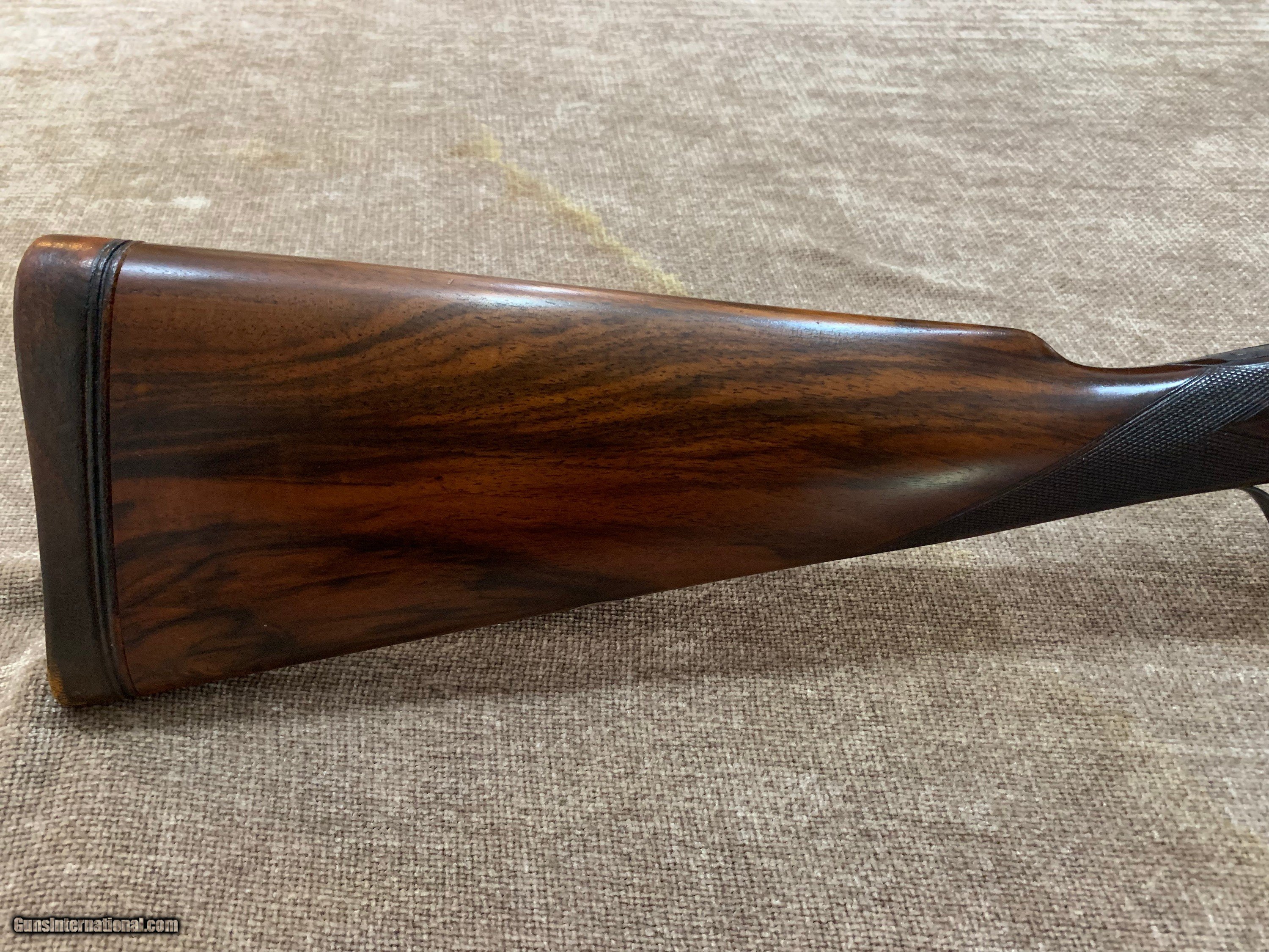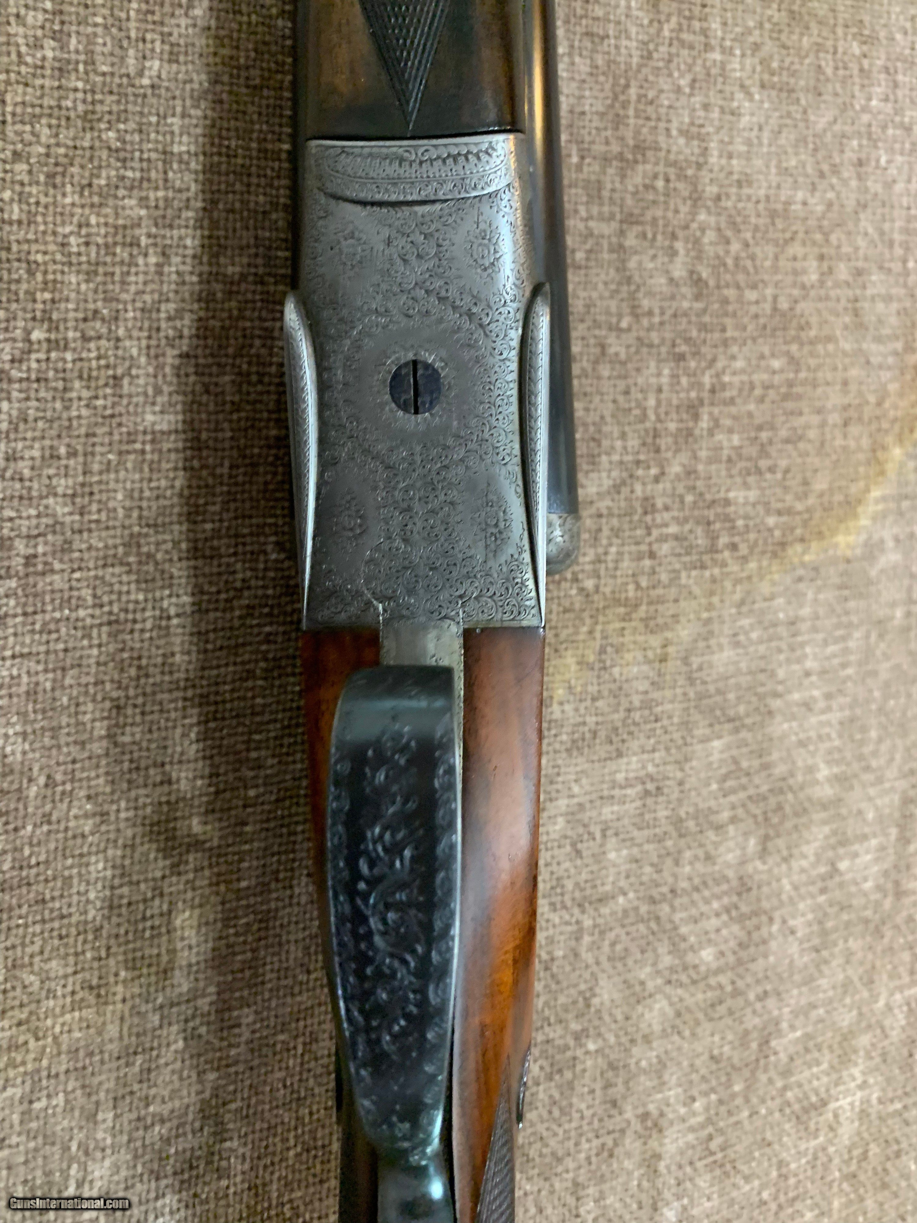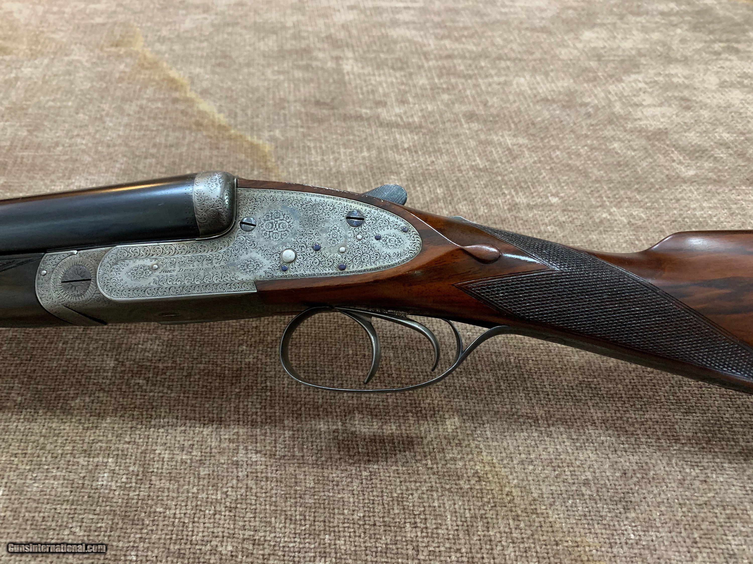 Description: JOHN DICKSON & SON BEST 12 BORE SLE WITH 29" .005/.013 CHOPPER LUMP BARRELS, D/T, STRAIGHT HAND STOCK TO LEATHER COVERED PAD. GUN HAS GOLD OVAL, 100% ROSE & SCROLL ENGRAVING, PERFECT BORES AND IS CASED IN FACTORY CANVAS AND LEATHER CASE. #6458 AT 1 1/2" X 2 1/2" X 14 7/8". $12,500.00. JOHN 443-952-7165. PHONE ONLY PLEASE. FREE SHIPPING. SOLD |