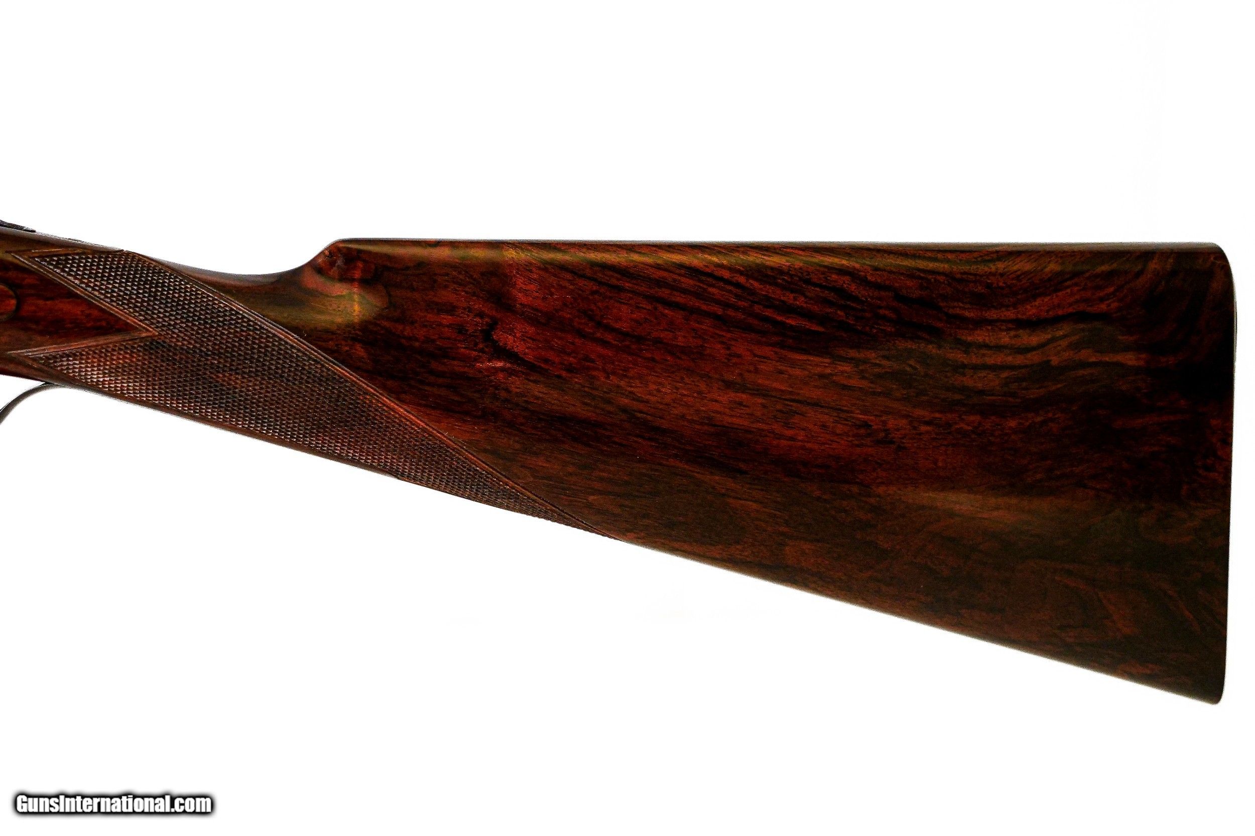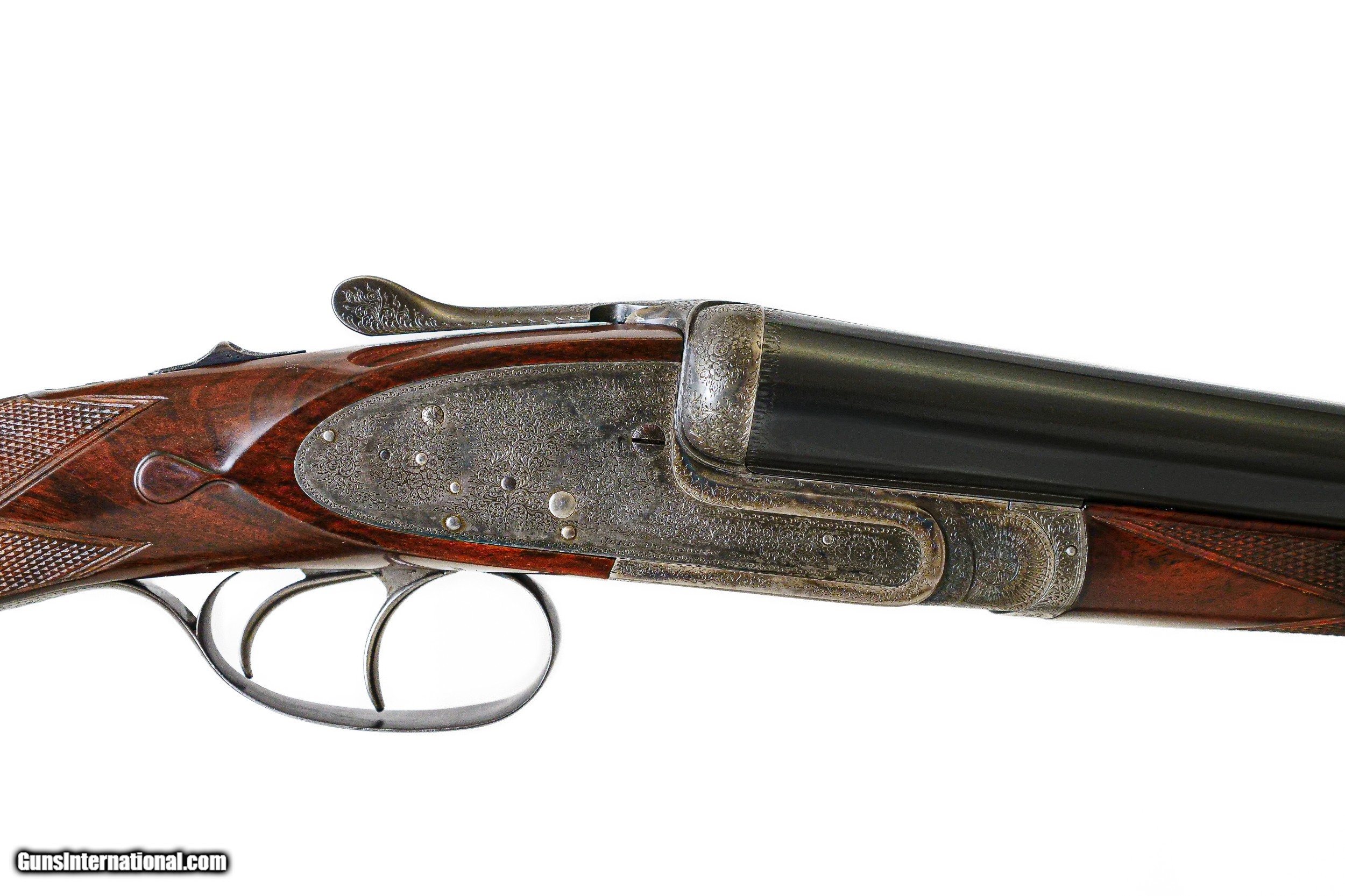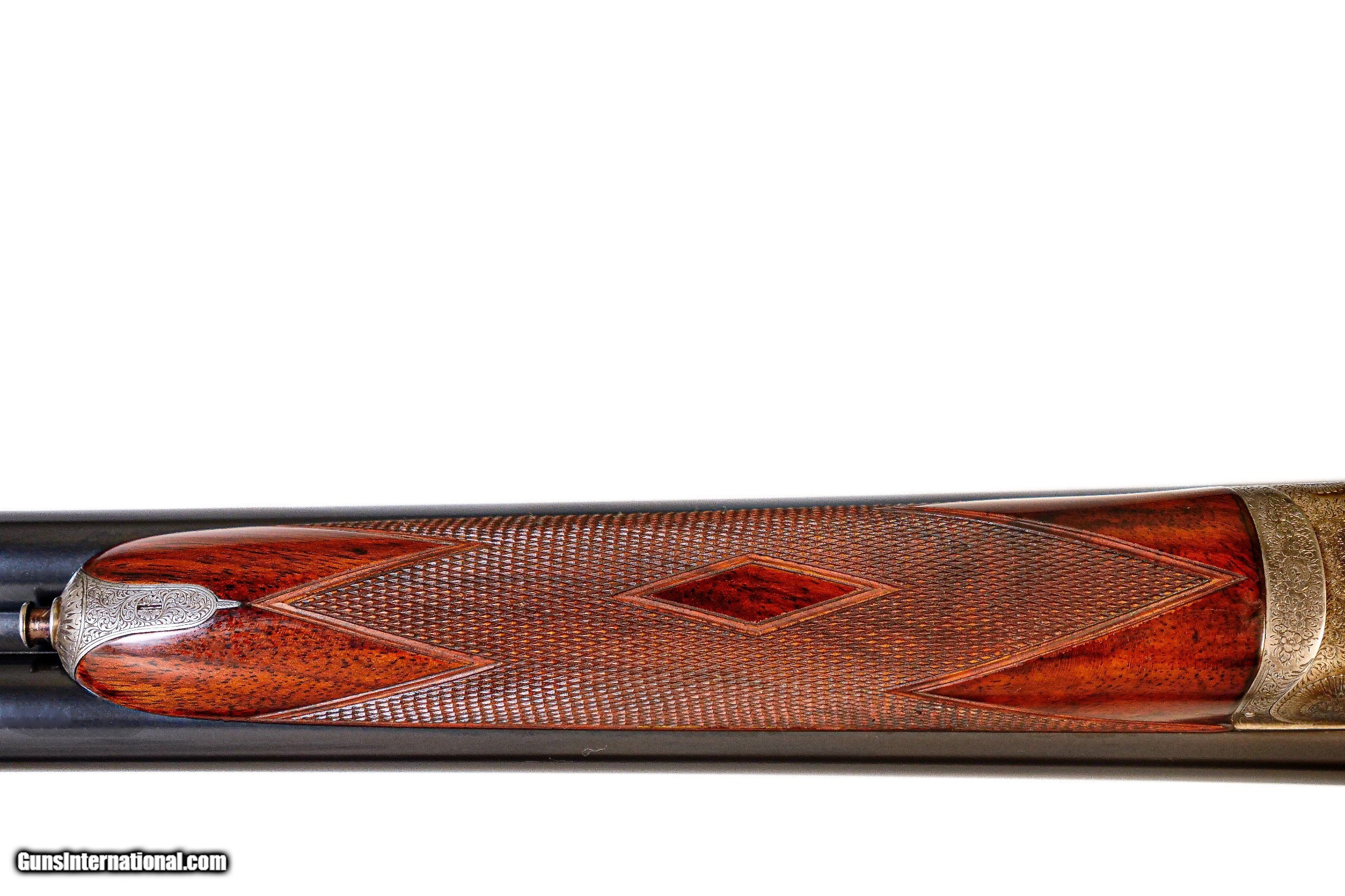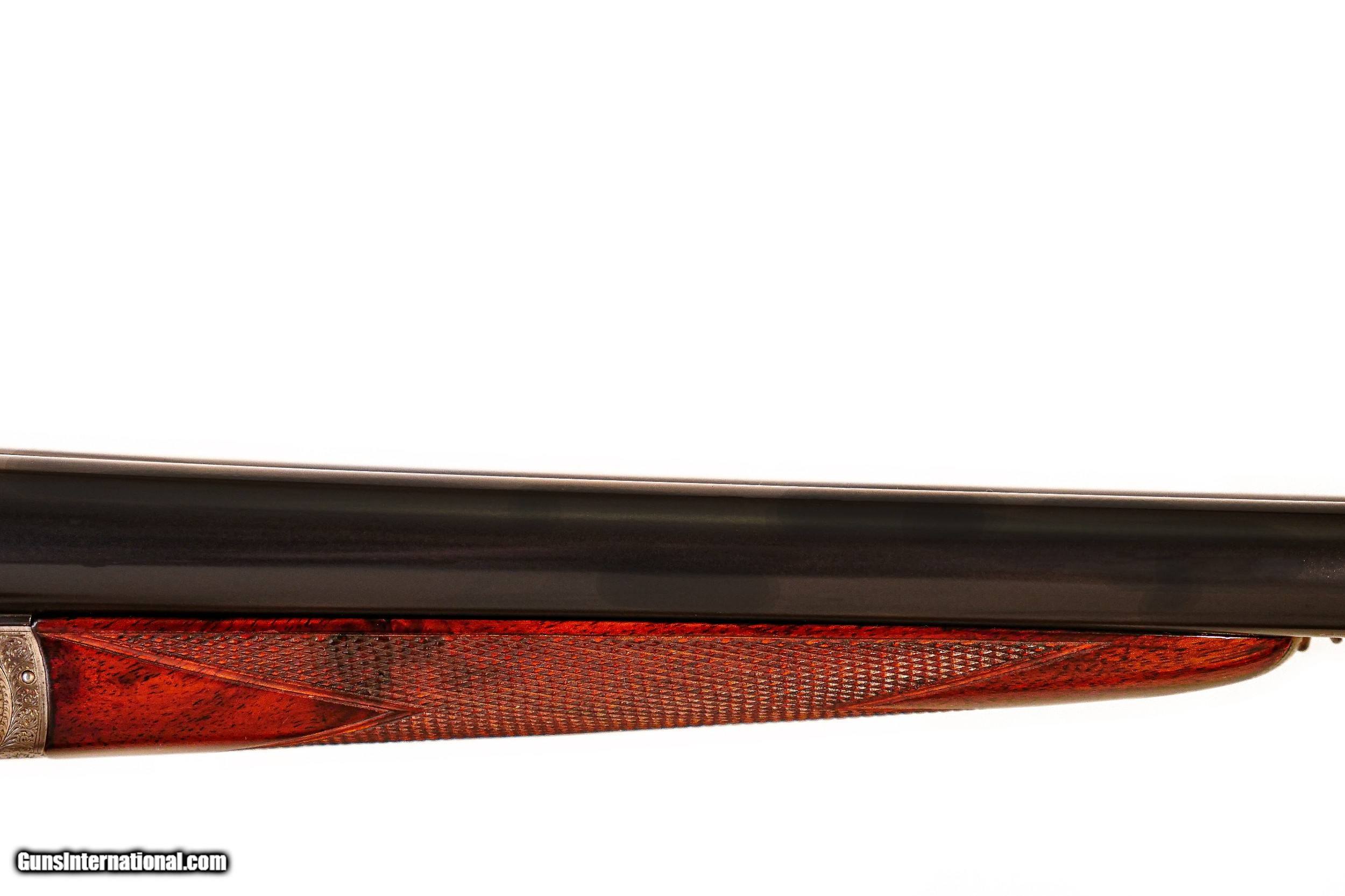 Description: John Dickson & Son - 12ga. 27" Barrels. . 005”/.005” choke constriction, straight grip French walnut stock, checkered butt, splinter forend, 1924 manufacture, Sir Joseph Whitworth chopper lump barrel, double triggers with the front trigger being articulated, gun retains nearly all of its case coloring, untouched screws, full sidelock gun with crisp and sharp in miniature rose bouquet and scroll engraving by Sumner, 1 1/8 oz. London proofed, includes period Abercrombie and Fitch case, a best full sidelock Boss style gun, a remarkable gun. Inv: 51498 6 lbs. 5 oz. 14 ½” x 1 ½” x 2 ½” $18,995.00 SOLD |