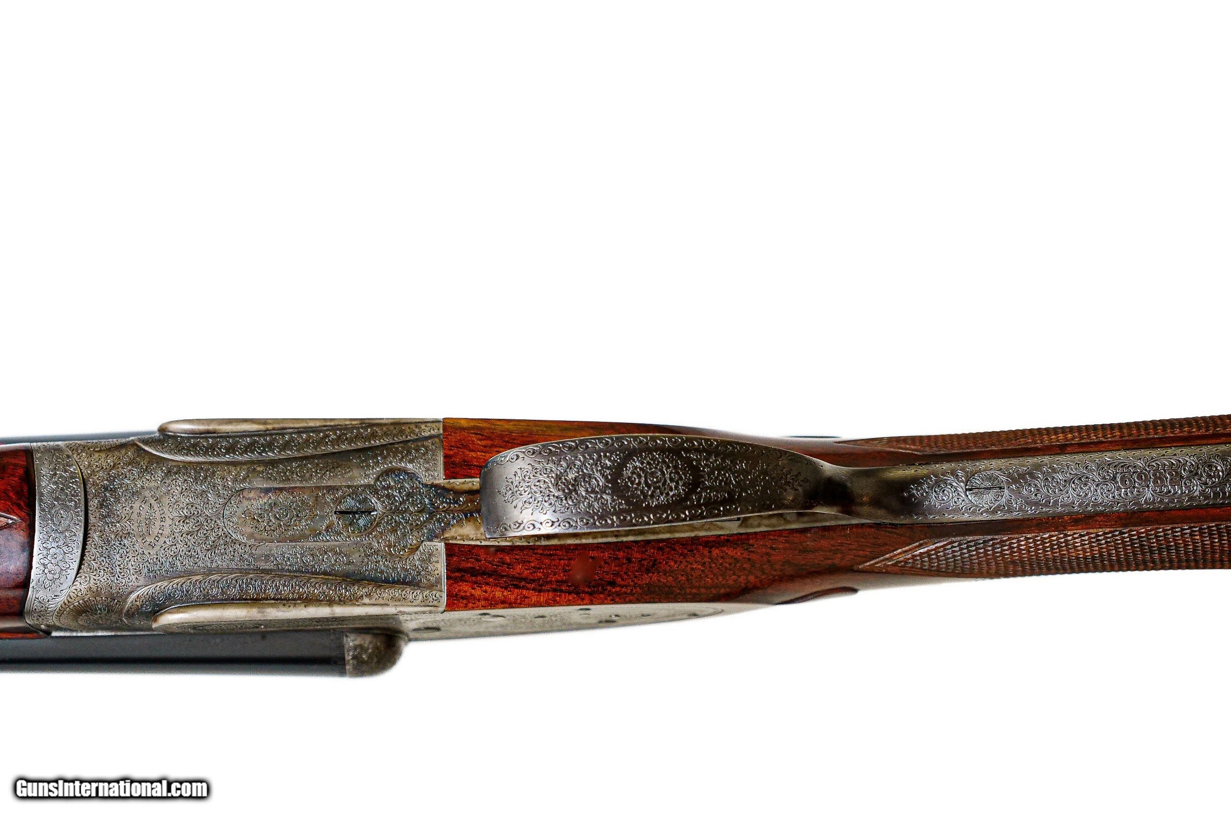 Description: John Dickson & Son - 12ga. 27" Barrels. .005”/.005” choke constriction, straight grip French walnut stock, checkered butt, splinter forend, 1924 manufacture, Sir Joseph Whitworth chopper lump barrel, double triggers with the front trigger being articulated, gun retains nearly all of its case coloring, untouched screws, full sidelock gun with crisp and sharp in miniature rose bouquet and scroll engraving by Sumner, 1 1/8 oz. London proofed, includes period Abercrombie and Fitch case, a best full sidelock Boss style gun, a remarkable gun. Inv: 51498 6 lbs. 5 oz. 14 ½” x 1 ½” x 2 ½” $18,995.00 SOLD |