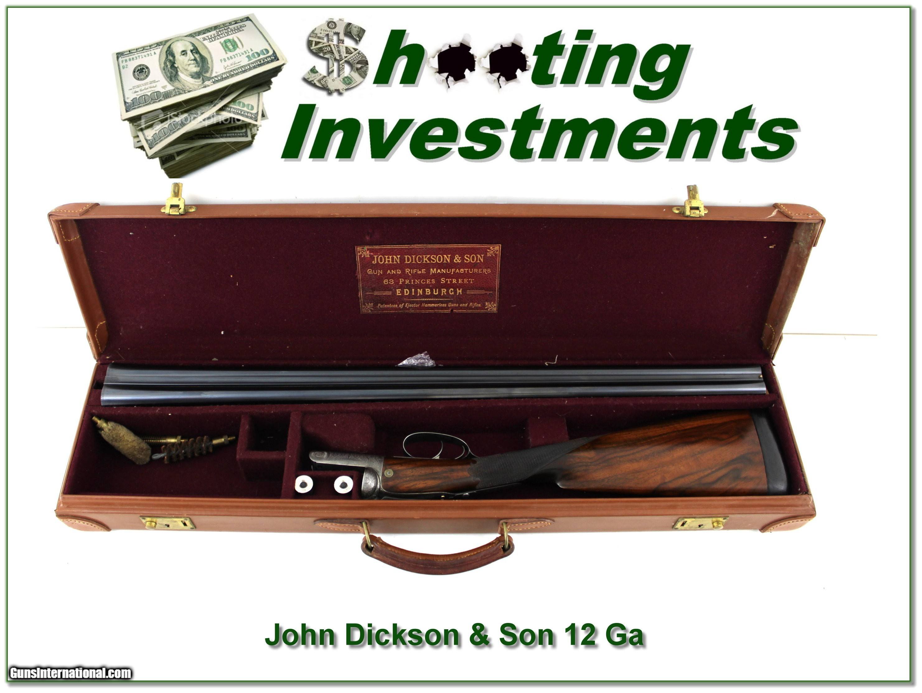 Description: Shooters and collectors, this is a beautiful John Dickson & Son Round Action 12 Gauge. I believe it was made in 1885 so it can ship direct. This one has a beautiful hand engraved receiver. It has gold plated cock indicators and 28in barrels choked IC and Mod with 1 3/4in bores. It has a 14in LOP over recoil pad. It comes in the makers case as show (it’s a tight fit). It will make a classic early hammerless SxS. I am selling this one on consignment and as such lay-a-way can’t be used. It does of course have the standard 3-day inspection. Shipping and insurance is $119 Please email me with any questions or larger pictures. (Consign your quality firearms with Shooting Investments for only 12%! Let me know if you have any you would like to sell!) 25-0167