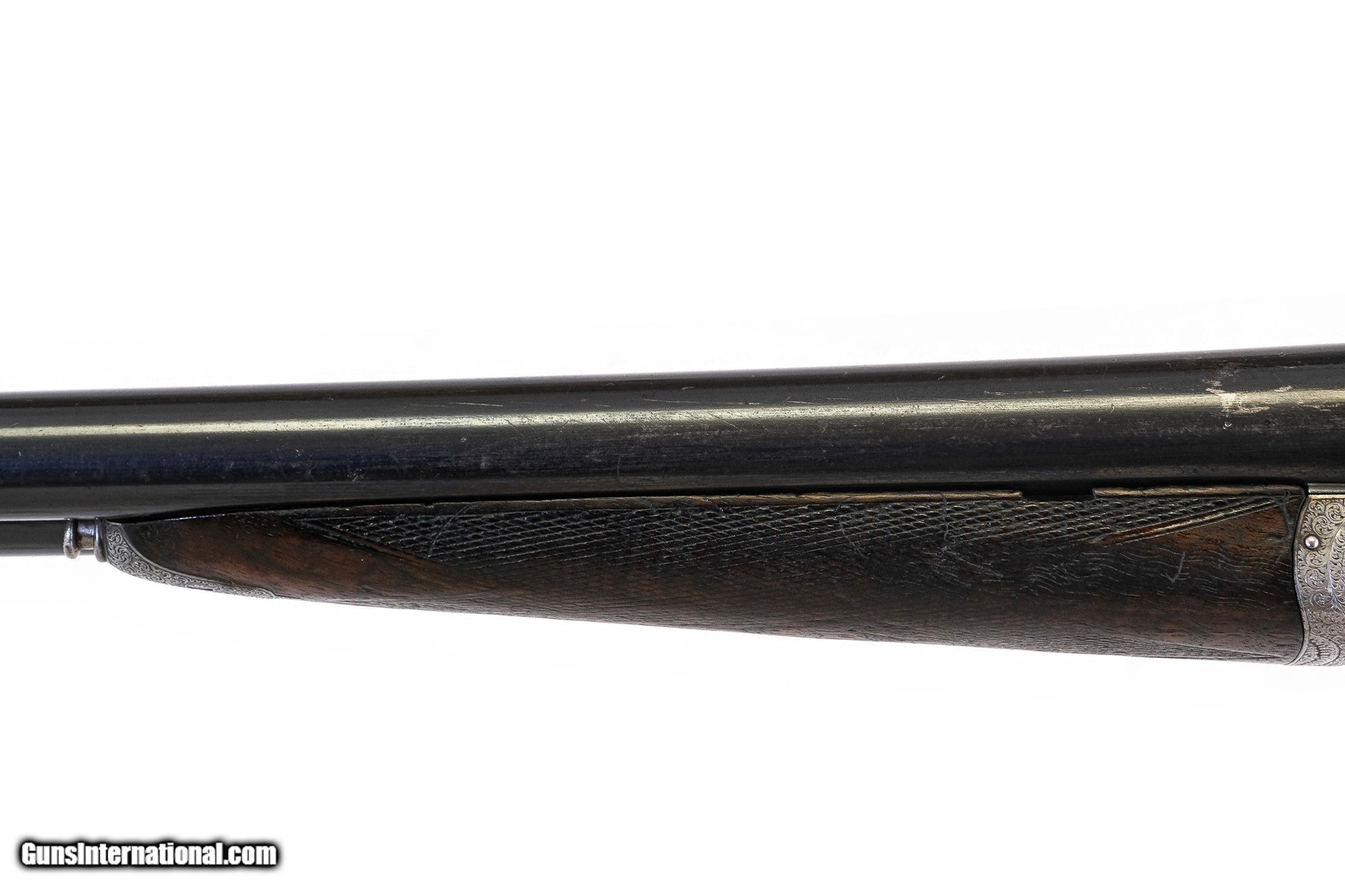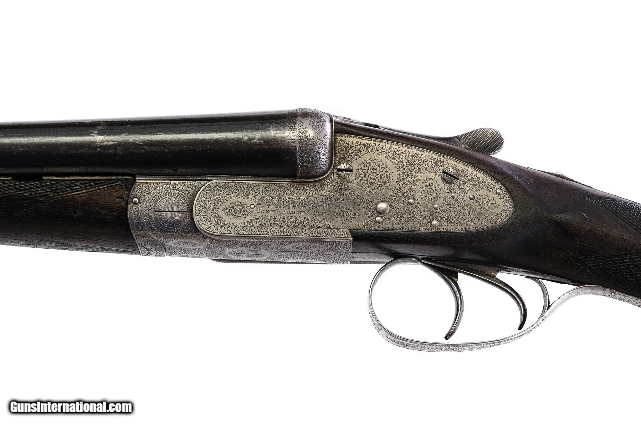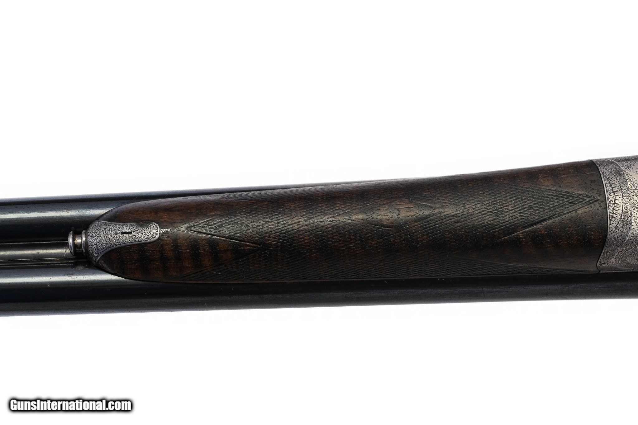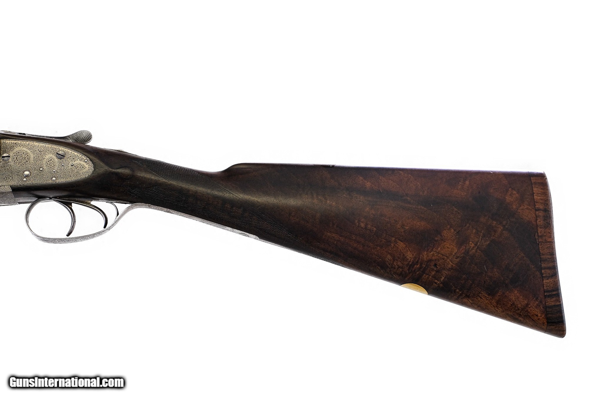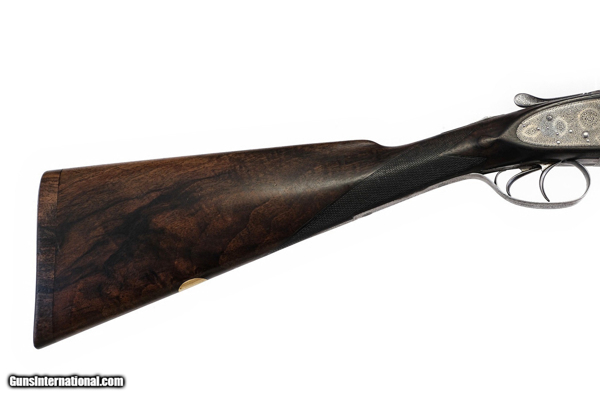 Description: John Dickson & Son - SxS, 12ga. 29" Barrels Choked SK/M. Straight grip, double triggers, 63 Princes Street address, automatic ejectors, wooden butt plate, drop points, splinter forend, gold oval, checkering worn, traces of case coloring remaining, small chip of wood missing from forend, sharp engraving on lock plates, excellent old unrestored gun, available for immediate delivery. Inv: 76253 6 lbs. 10 oz. 14 ¾” x 1 ½” x 2 7/8” $6,499.00 SOLD |