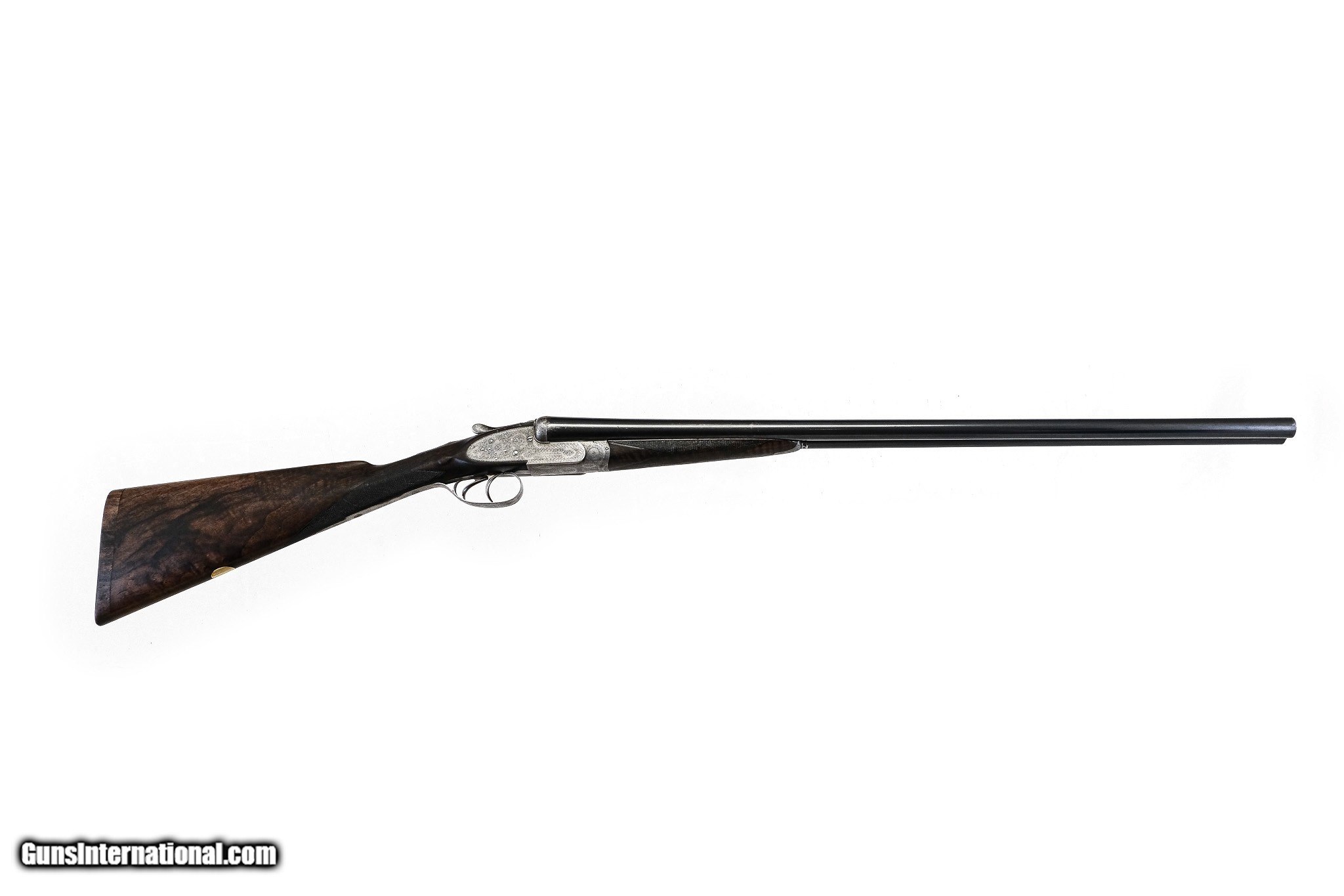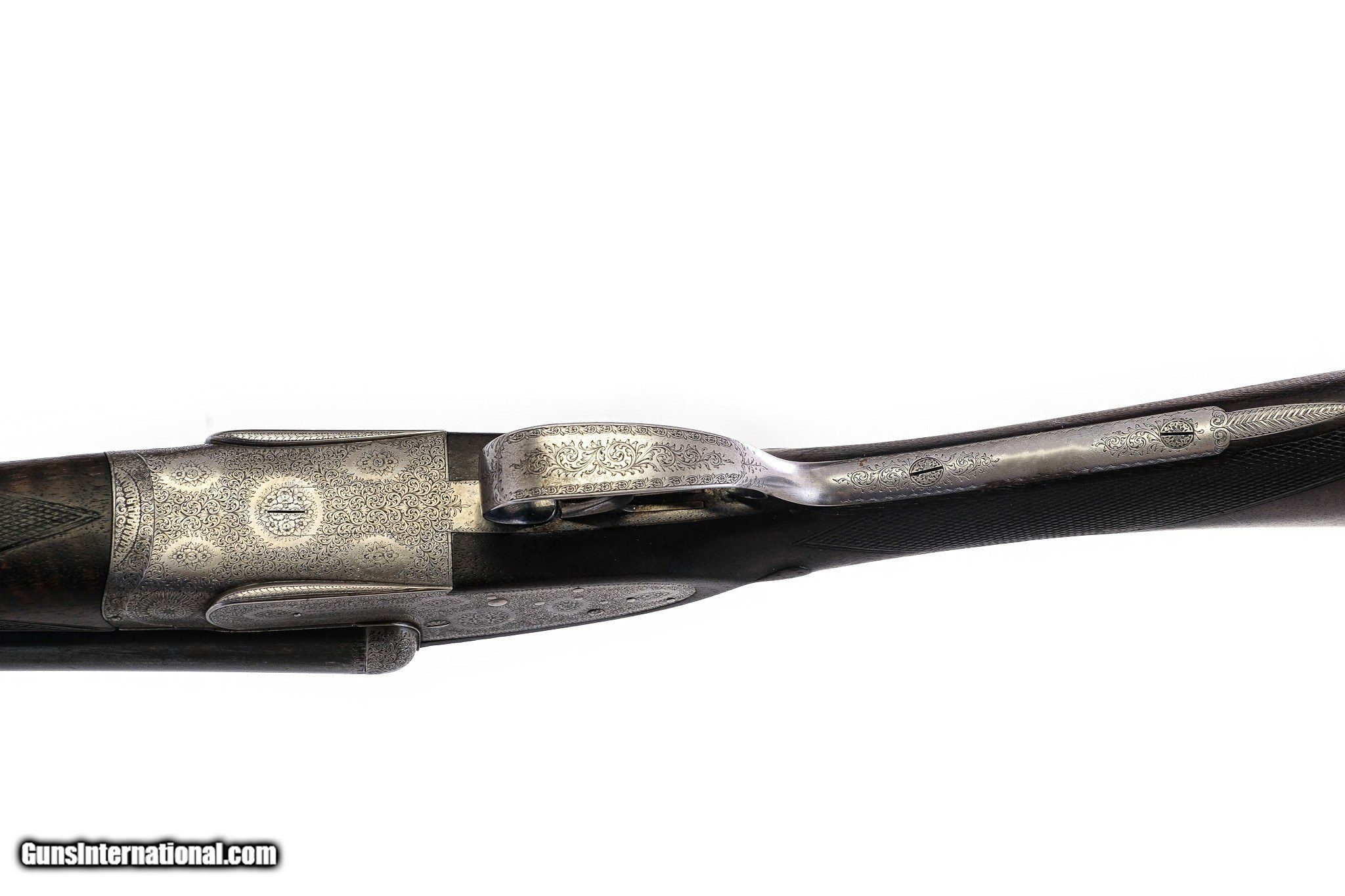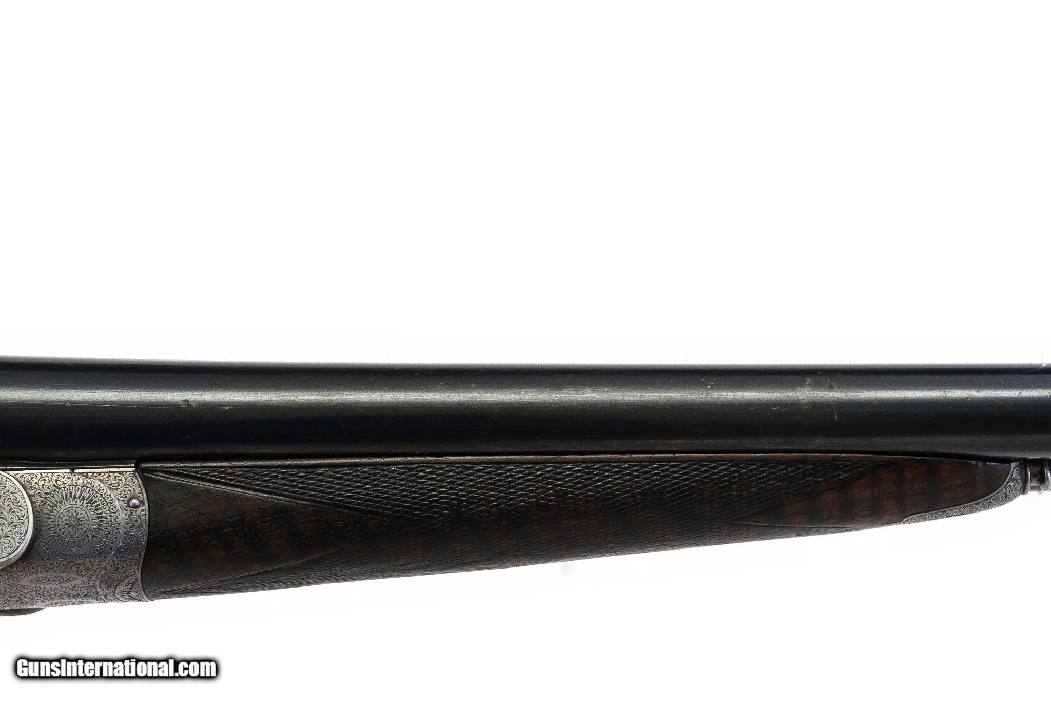 Description: John Dickson & Son - SxS, 12ga. 29" Barrels Choked SK/M. Straight grip, double triggers, 63 Princes Street address, automatic ejectors, wooden butt plate, drop points, splinter forend, gold oval, checkering worn, traces of case coloring remaining, small chip of wood missing from forend, sharp engraving on lock plates, excellent old unrestored gun, available for immediate delivery. Inv: 76253 6 lbs. 10 oz. 14 ¾” x 1 ½” x 2 7/8” $6,499.00 SOLD |