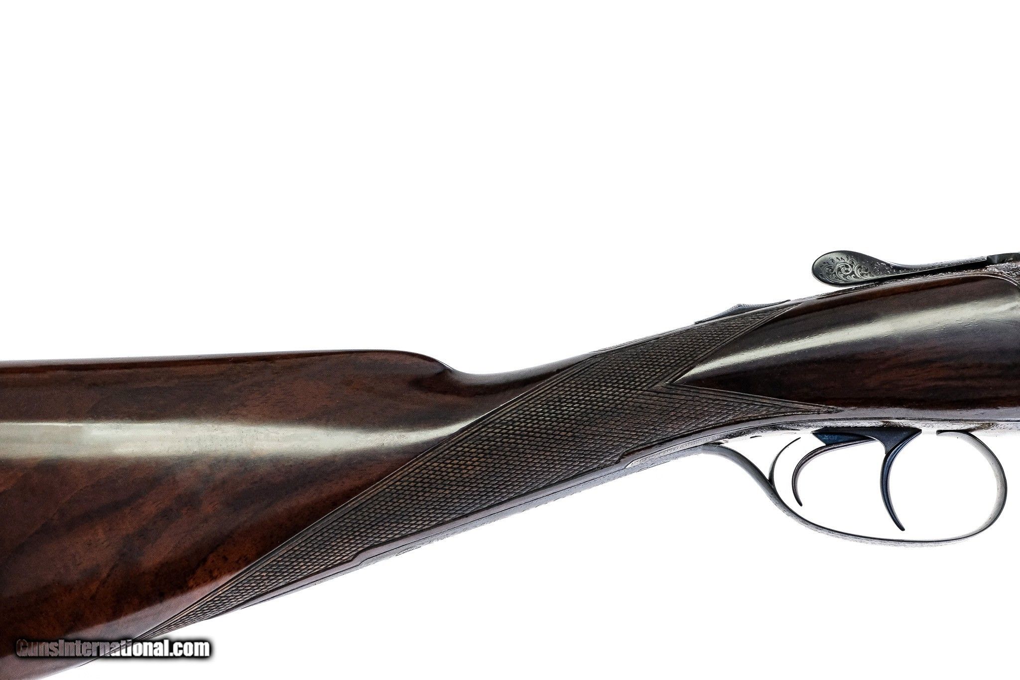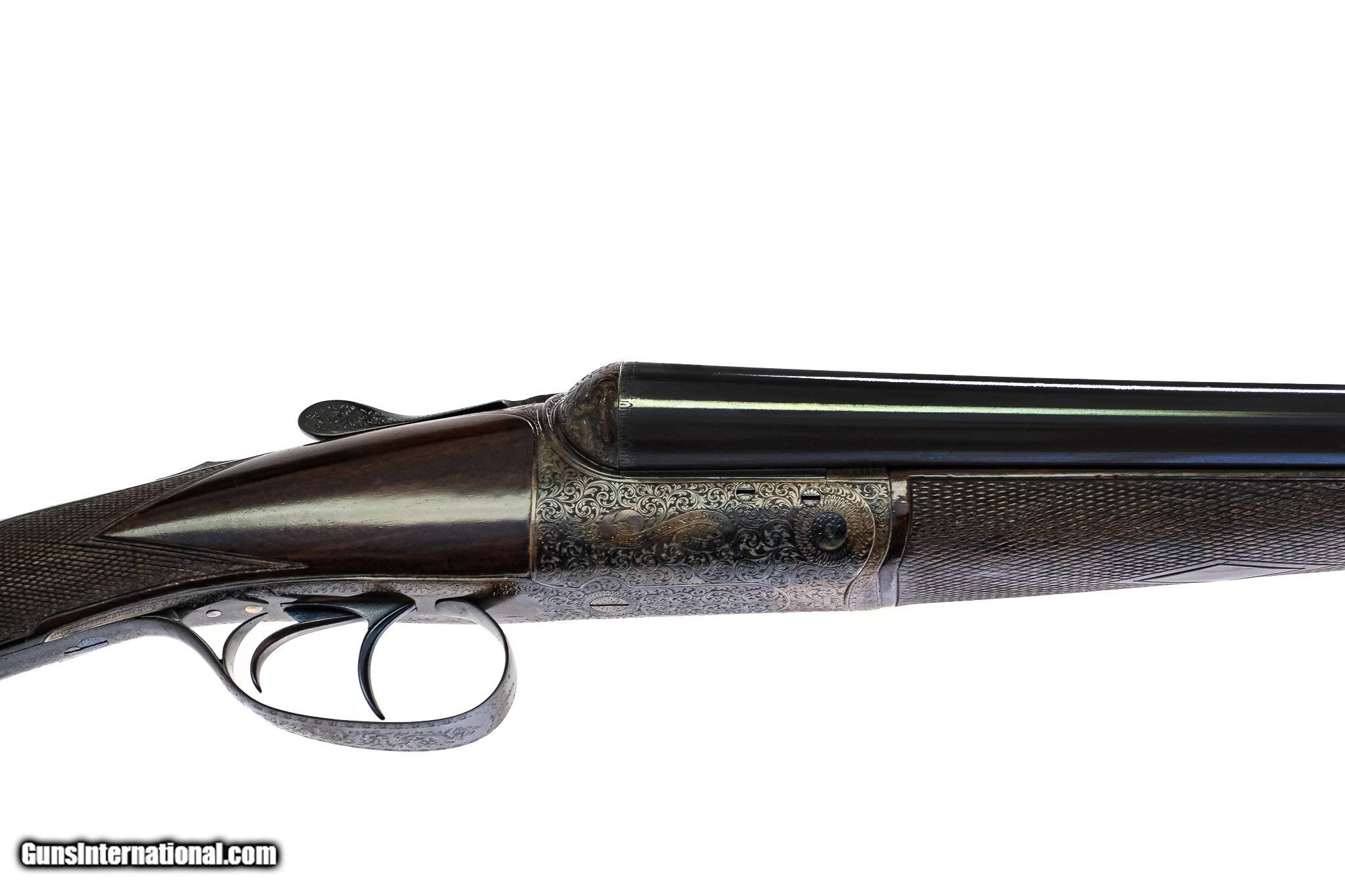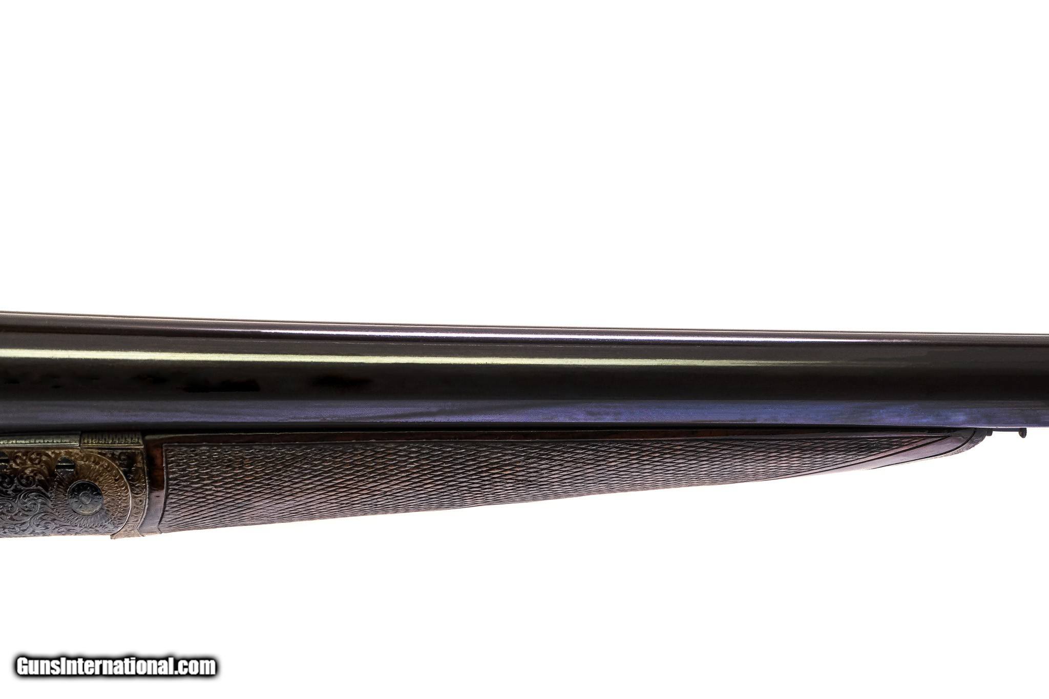 Description: John Dickson & Son - SxS, 12ga. 29" Nitro Barrels Choked CYL/Q2. Patent round action trigger plate, manufactured in 1911, 29" nitro barrels, gold inlayed "2" at the breach, 2 1/2" chambered, Cylinder & Quarter choked, carved fences, automatic safety, this gun is profusely engraved with fine scroll work, with the makers name in banner, straight grip, double trigger, automatic ejector, checkered butt, this gun has been completely London style refinished, sparing no cost. Its indistinguishable from a brand new gun, with perfect screws, tight clean, only detriment is the gun has barrel blue wear from sitting in the case. In its period oak and leather case that shows considerable wear. Just a wonderful gun that really looks in every way brand new. Inv: 71885 6 lbs. 2 oz. 14 1/4" x 1 1/2" x 2 1/4" $16,500.00 SOLD |