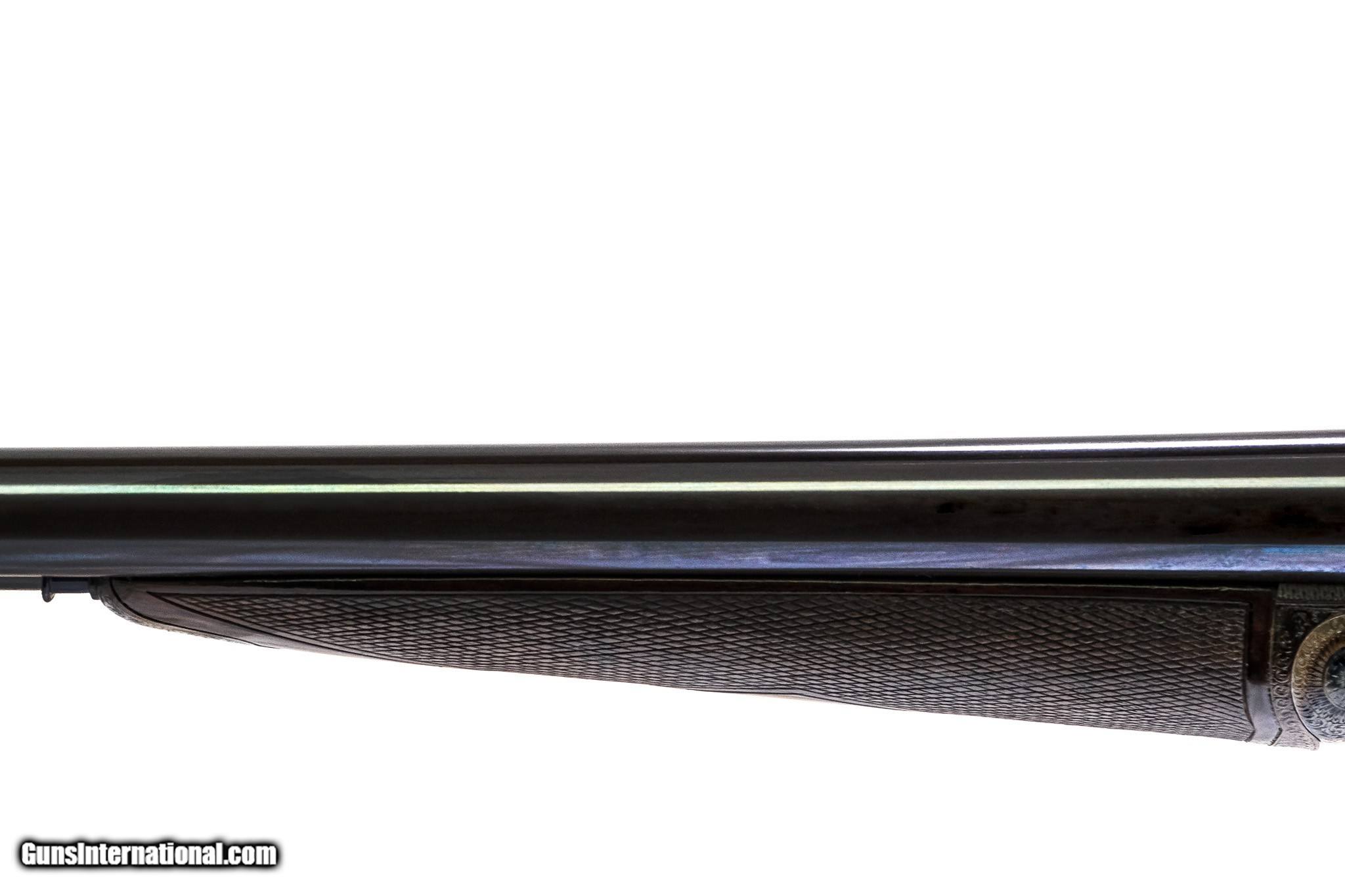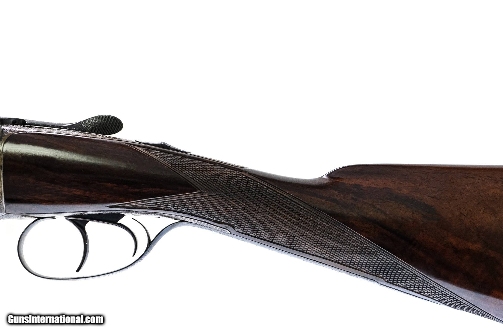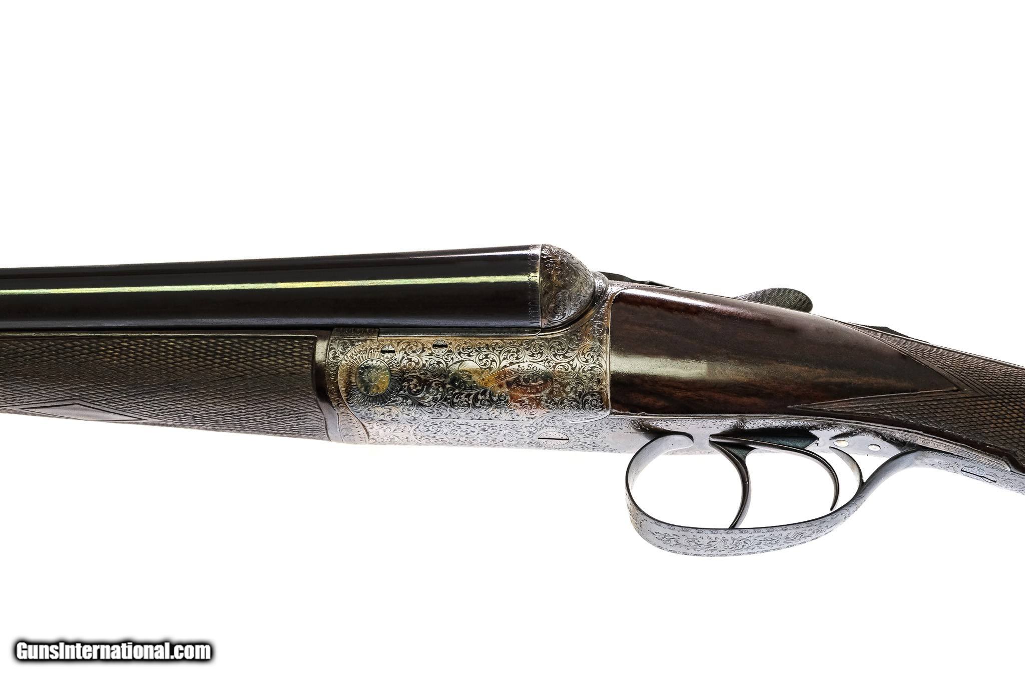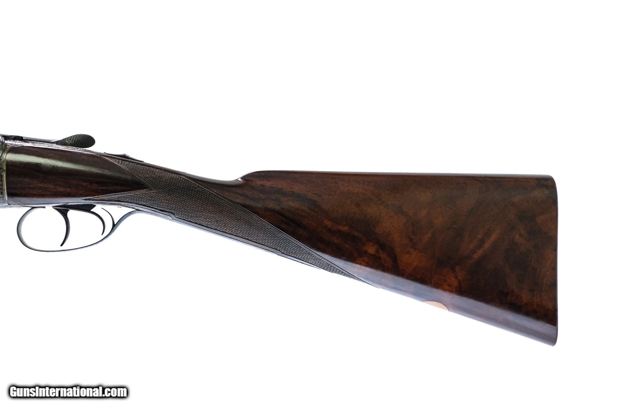 Description: John Dickson & Son - SxS, 12ga. 29" Nitro Barrels Choked CYL/Q2. Patent round action trigger plate, manufactured in 1911, 29" nitro barrels, gold inlayed "2" at the breach, 2 1/2" chambered, Cylinder & Quarter choked, carved fences, automatic safety, this gun is profusely engraved with fine scroll work, with the makers name in banner, straight grip, double trigger, automatic ejector, checkered butt, this gun has been completely London style refinished, sparing no cost. Its indistinguishable from a brand new gun, with perfect screws, tight clean, only detriment is the gun has barrel blue wear from sitting in the case. In its period oak and leather case that shows considerable wear. Just a wonderful gun that really looks in every way brand new. Inv: 71885 6 lbs. 2 oz. 14 1/4" x 1 1/2" x 2 1/4" $16,500.00 SOLD |