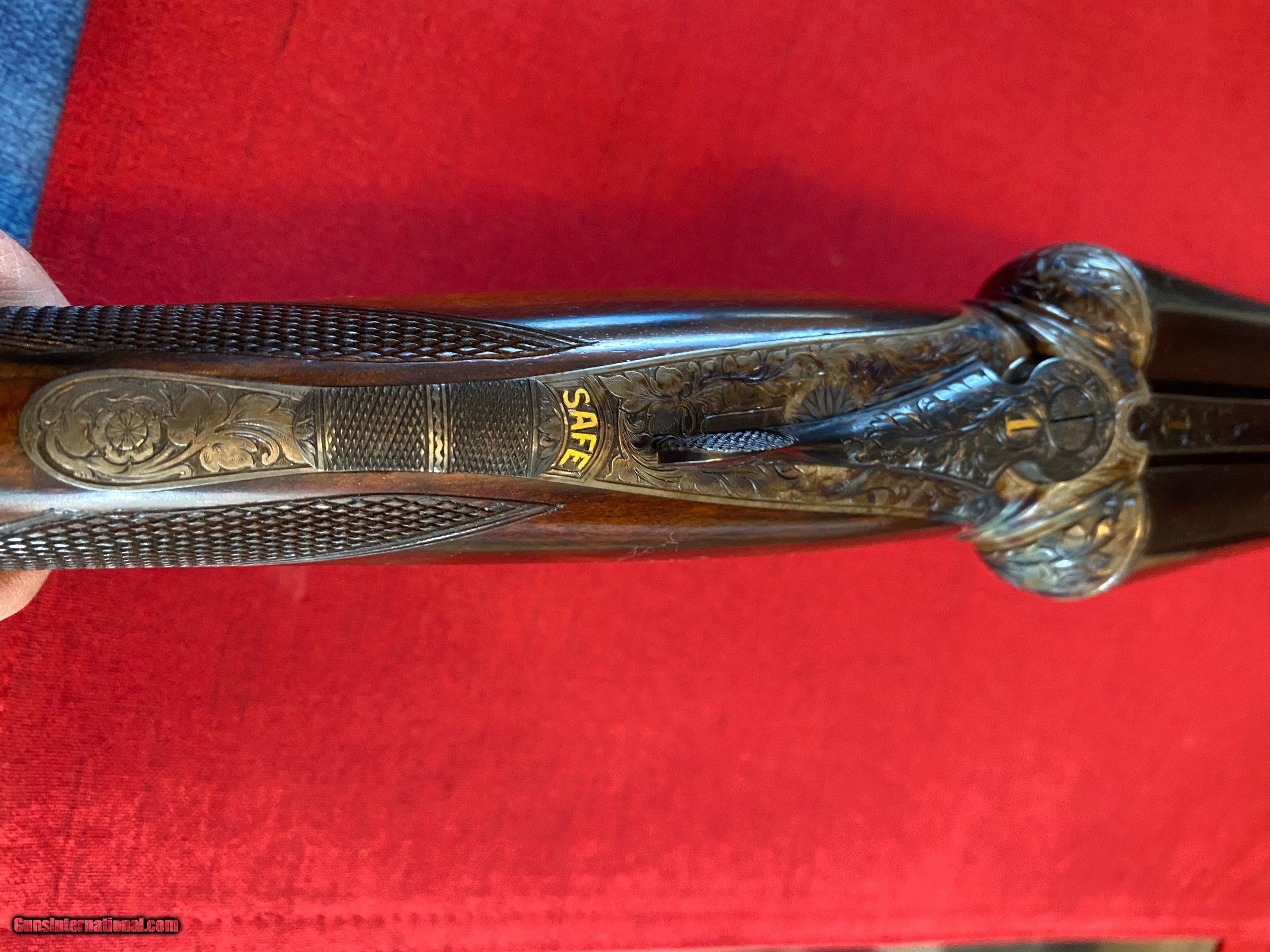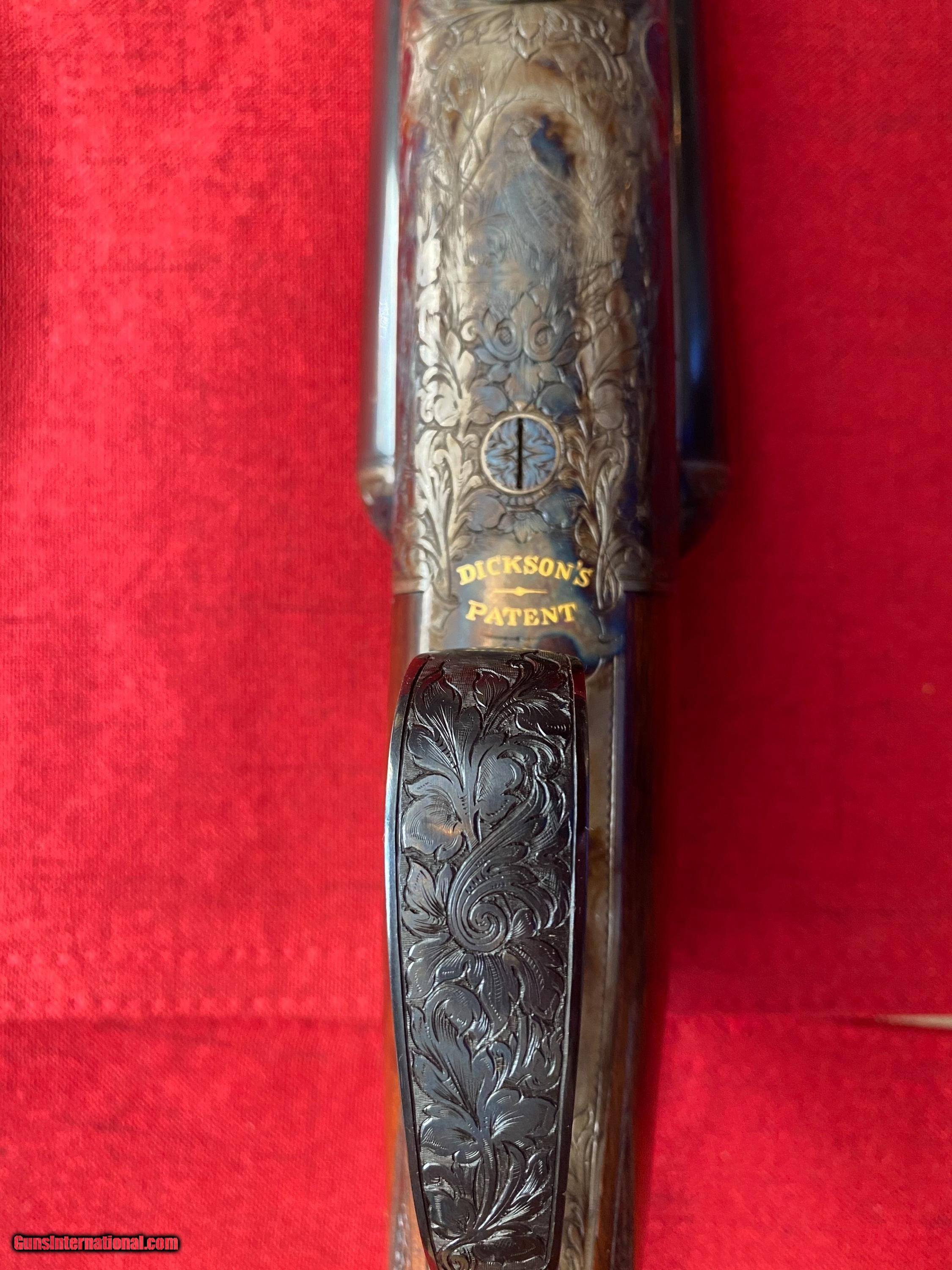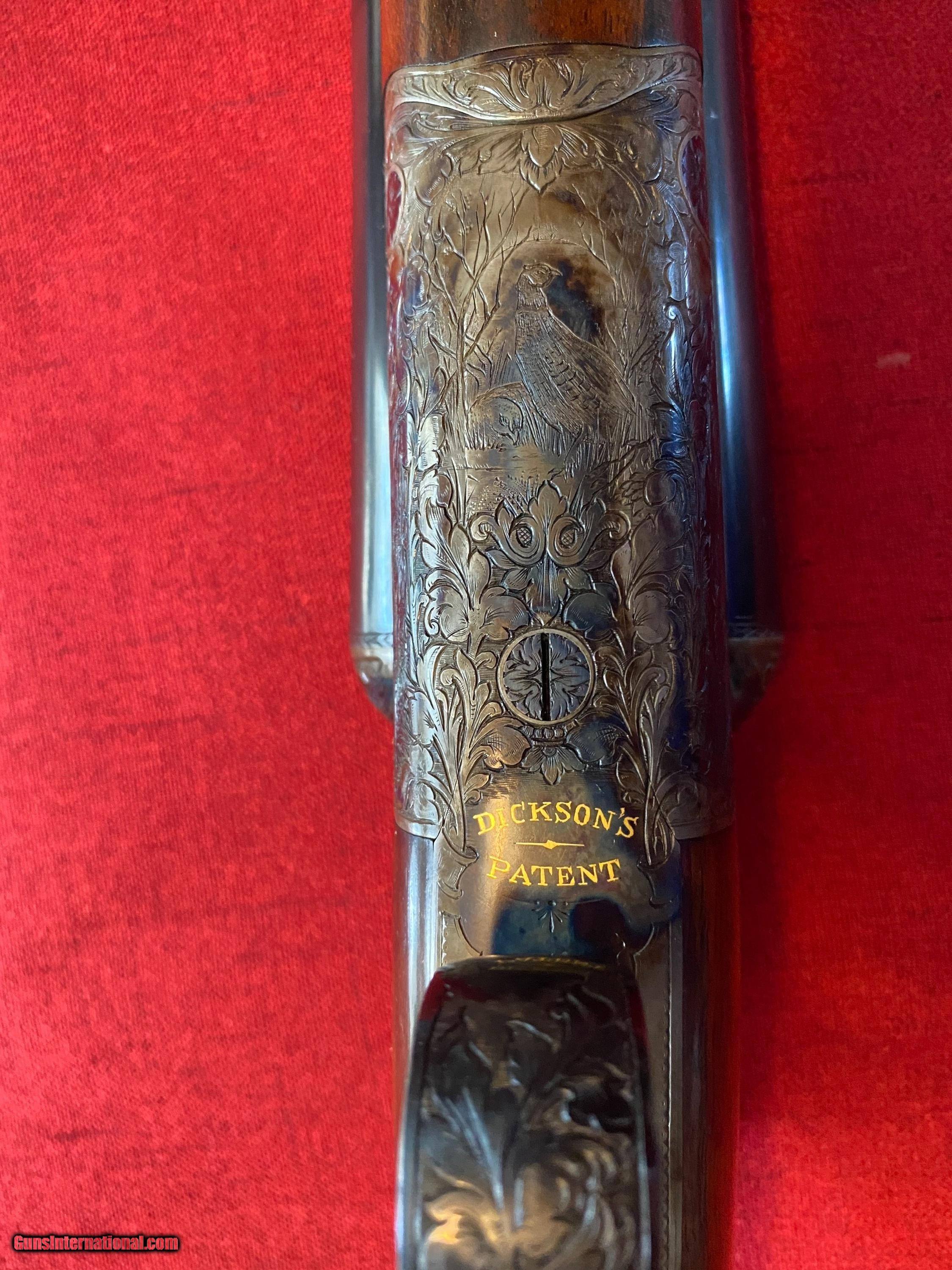 Description: A very fine and rare Ken Preater engraved 12 bore ejector, serial no. 7696, 27 in nitro chopperlump barrels, rib engraved "John Dickson & Son, 21 Frederick Street, Edinburgh" gold inlaid "1" in an oval, 2 3/4inch chambers, bored approx 1/4 and 3/4 choke, bores measure .729 L .730 R, Min wall thickness R .23 L .21, Toplever gold inlaid "1", automatic safety with gold inlaid "SAFE", gold washed cocking levers, ornate fences carved in high relief with fliliciform motifs on a matted background, the action bar finely engraved with game scenes of pheasant, partridge and grouse in their natural habitats, surrounded by further flowing leaf and and scroll designs carved in relief and on a matted background, the makers name in a scrolling banner, the underside gold inlaid "Dickson's Patent", the triggerplatte signed "Engr. K. Preater", retaining full original color case hardening and finish, 15in figured stock, weight 6lb. 4oz. Ken was the head engraver at Holland and Holland for many yearspleted in 1978, this was one of the last guns made in the Edinburgh shop. A unique opportunity to own a rare 1 of 2 dickson rounactions engraved by K. Preater in virtually new condition at less than half the price of a new compareably engraved Dickson Roundaction. SOLD Shotgun Gauge: 12 Gauge |