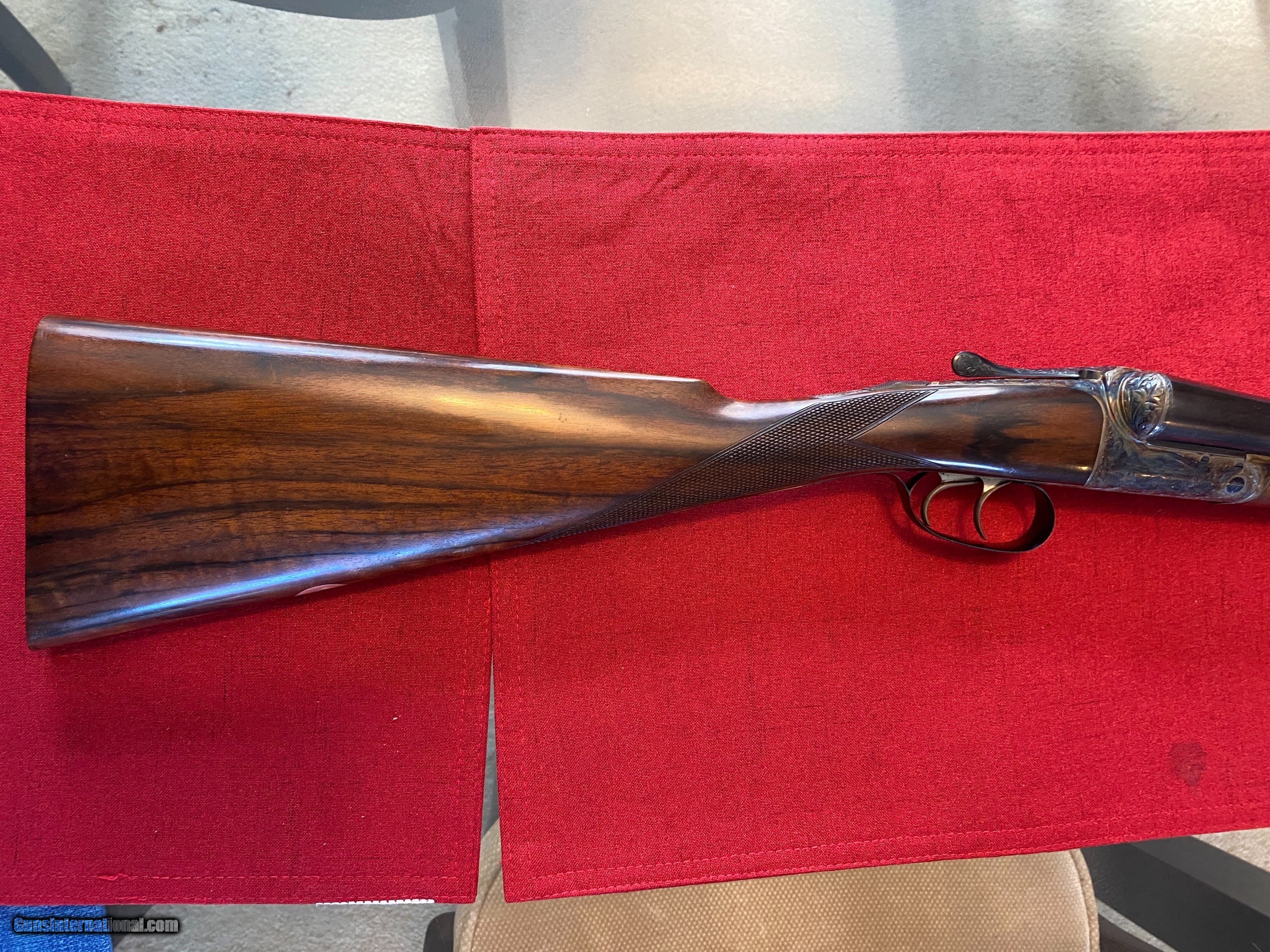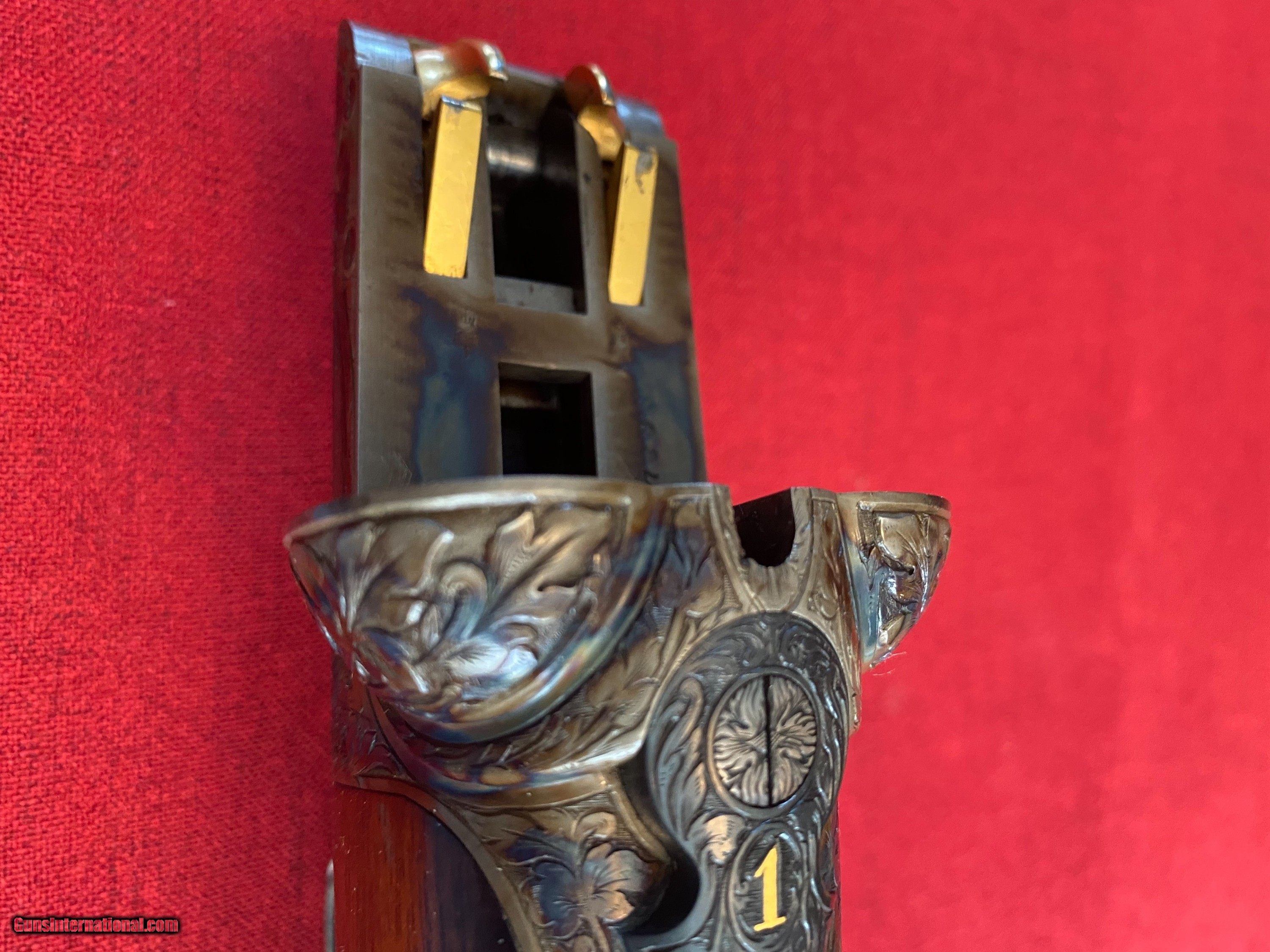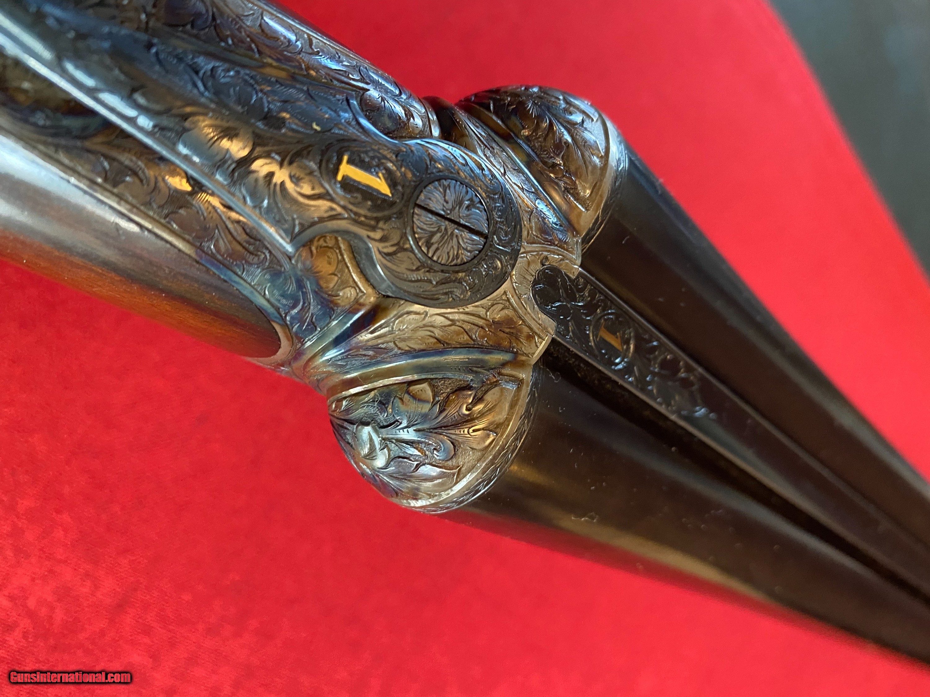 Description: A very fine and rare Ken Preater engraved 12 bore ejector, serial no. 7696, 27 in nitro chopperlump barrels, rib engraved "John Dickson & Son, 21 Frederick Street, Edinburgh" gold inlaid "1" in an oval, 2 3/4inch chambers, bored approx 1/4 and 3/4 choke, bores measure .729 L .730 R, Min wall thickness R .23 L .21, Toplever gold inlaid "1", automatic safety with gold inlaid "SAFE", gold washed cocking levers, ornate fences carved in high relief with fliliciform motifs on a matted background, the action bar finely engraved with game scenes of pheasant, partridge and grouse in their natural habitats, surrounded by further flowing leaf and and scroll designs carved in relief and on a matted background, the makers name in a scrolling banner, the underside gold inlaid "Dickson's Patent", the triggerplatte signed "Engr. K. Preater", retaining full original color case hardening and finish, 15in figured stock, weight 6lb. 4oz. Ken was the head engraver at Holland and Holland for many yearspleted in 1978, this was one of the last guns made in the Edinburgh shop. A unique opportunity to own a rare 1 of 2 dickson rounactions engraved by K. Preater in virtually new condition at less than half the price of a new compareably engraved Dickson Roundaction. SOLD Shotgun Gauge: 12 Gauge |