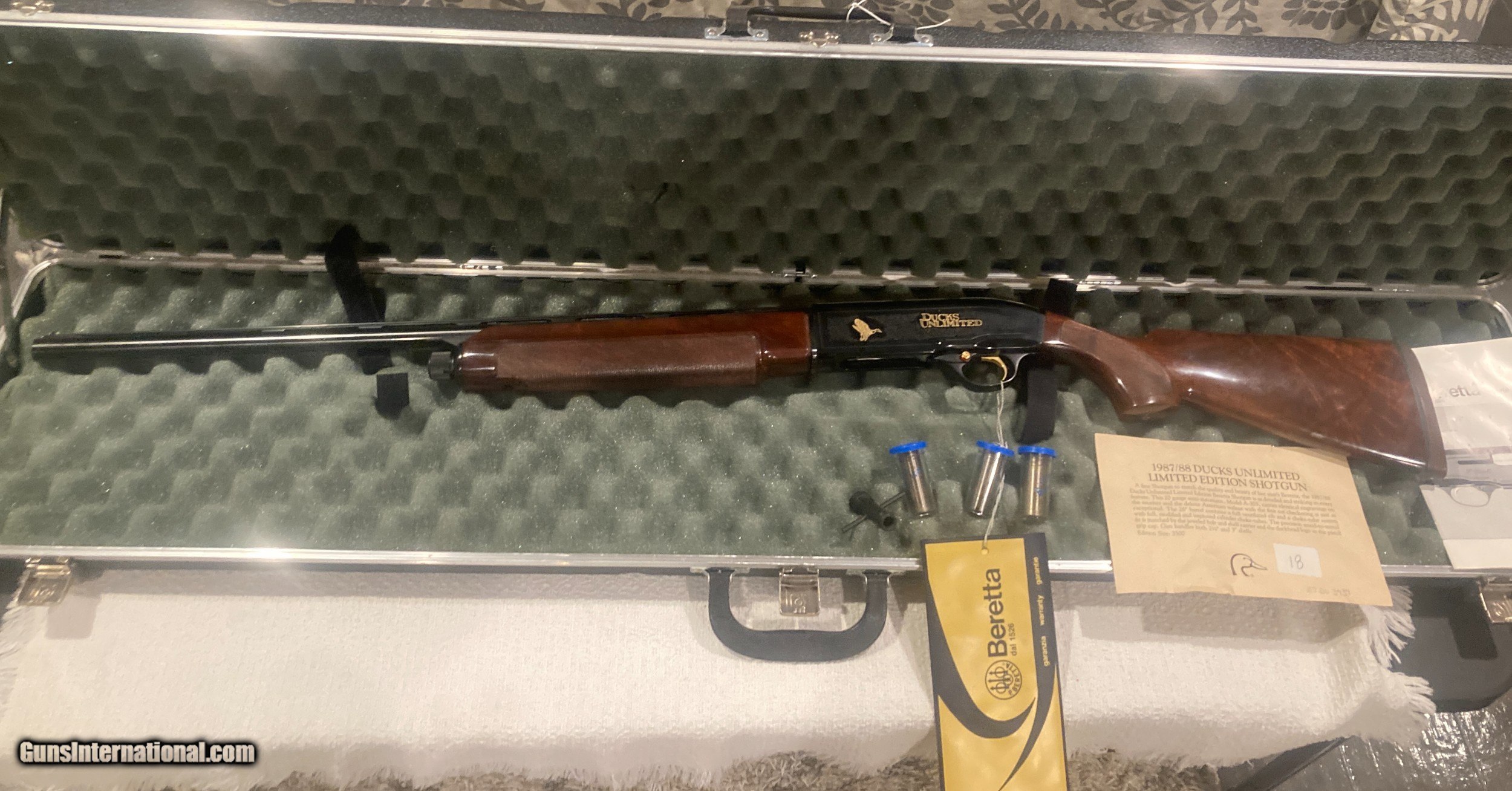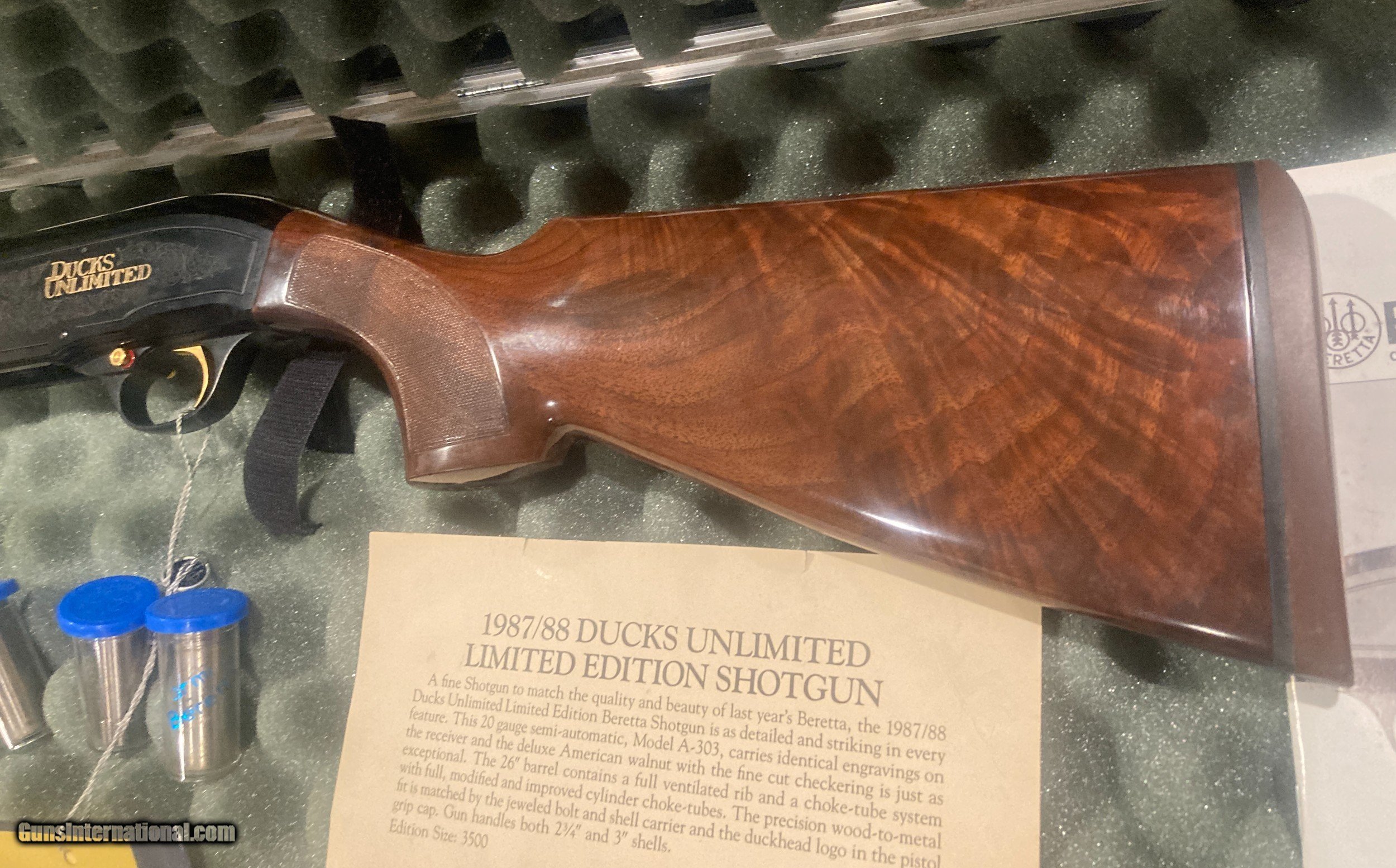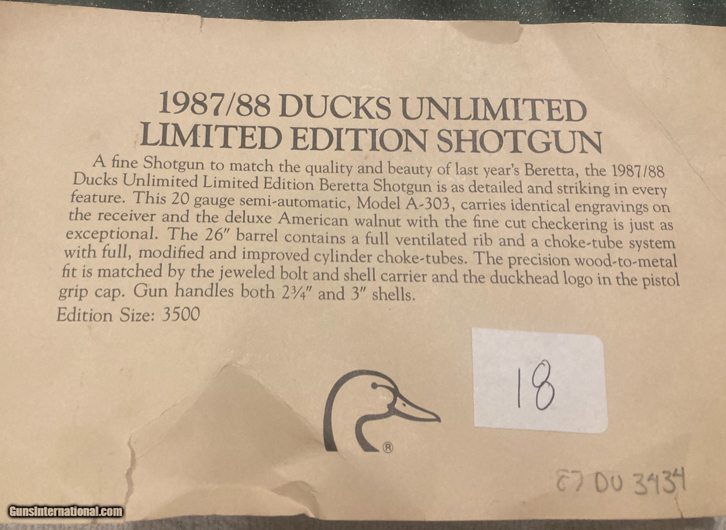 Description: up for sale 1987 ducks unlimited shotgun of the year Beretta A 303 20 ga 26 " barrel unfired comes in original case, three choke tubes and all paper work great wood serial number 87 DU 3434 $1,650 shipped and insured thanks for looking Mike 816-616-5942 SOLD Shotgun Gauge: 20 Gauge Manufacturer: Beretta Model: A 303 Serial Number: 87 DU 3434 Barrel Length: 26 Condition: 100% Metal Condition: 100% |