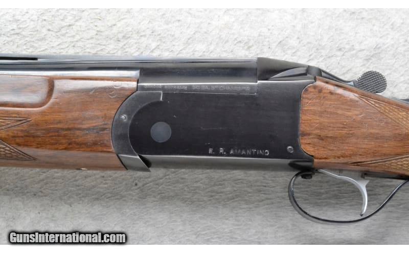 Description: This E.R. Amantino Model Condor Supreme is an over and under shotgun in 20 Ga. It has 28 inch separated barrels with a top barrel ventilated rib. A brass bead front sight. With 3 inch chambers it comes with two choke tubes. The butt stock is a checkered grip hardwood pistol grip. The forearm is a checkered grip hardwood with finger grooves. It has a single trigger. 20 Gauge SOLD Chambers: 3 inch. Metal Condition: Good. Has some minor use marks. Wood Condition: Good. Many use marks. Bore Condition: Bright and shiny. Barrels: 28 inch separated barrels with a top barrel ventilated rib. Triggers: Single. Stock Dimensions: LOP 14 1/2 inches. Fore End: Checkered grip hardwood with finger grooves. Butt Pad: Black rubber recoil pad. Weight: 7 Lb. 14 Oz. Sights: Brass bead front. Chokes: Comes with two choke tubes Item Location: Richfield, WI |