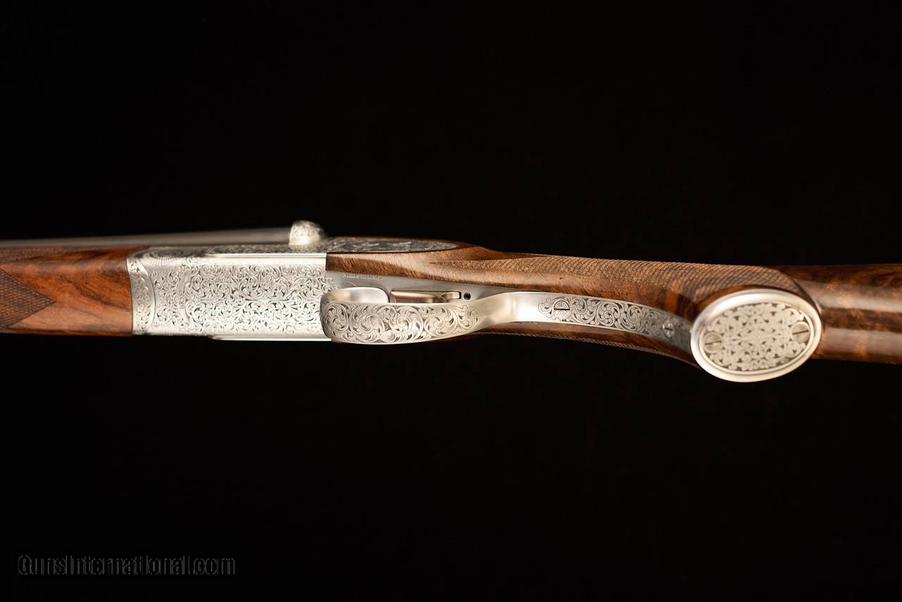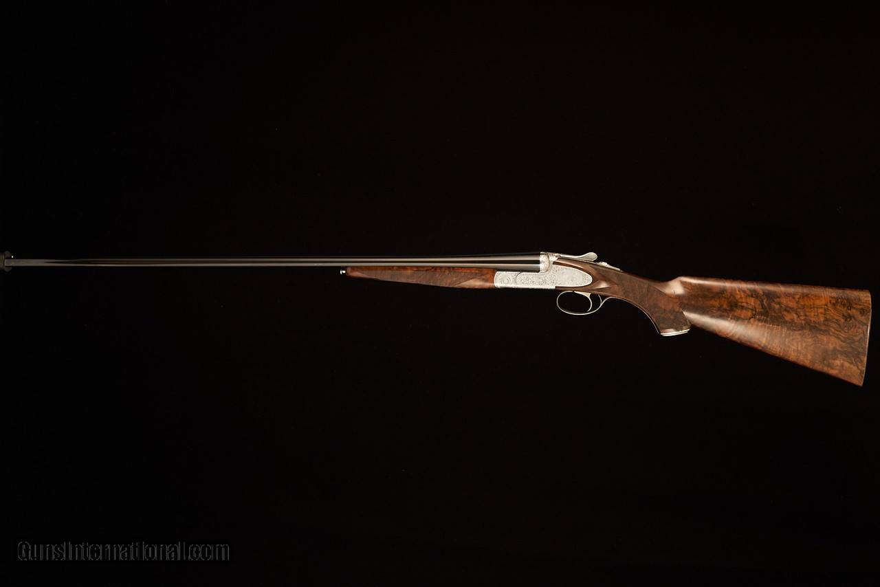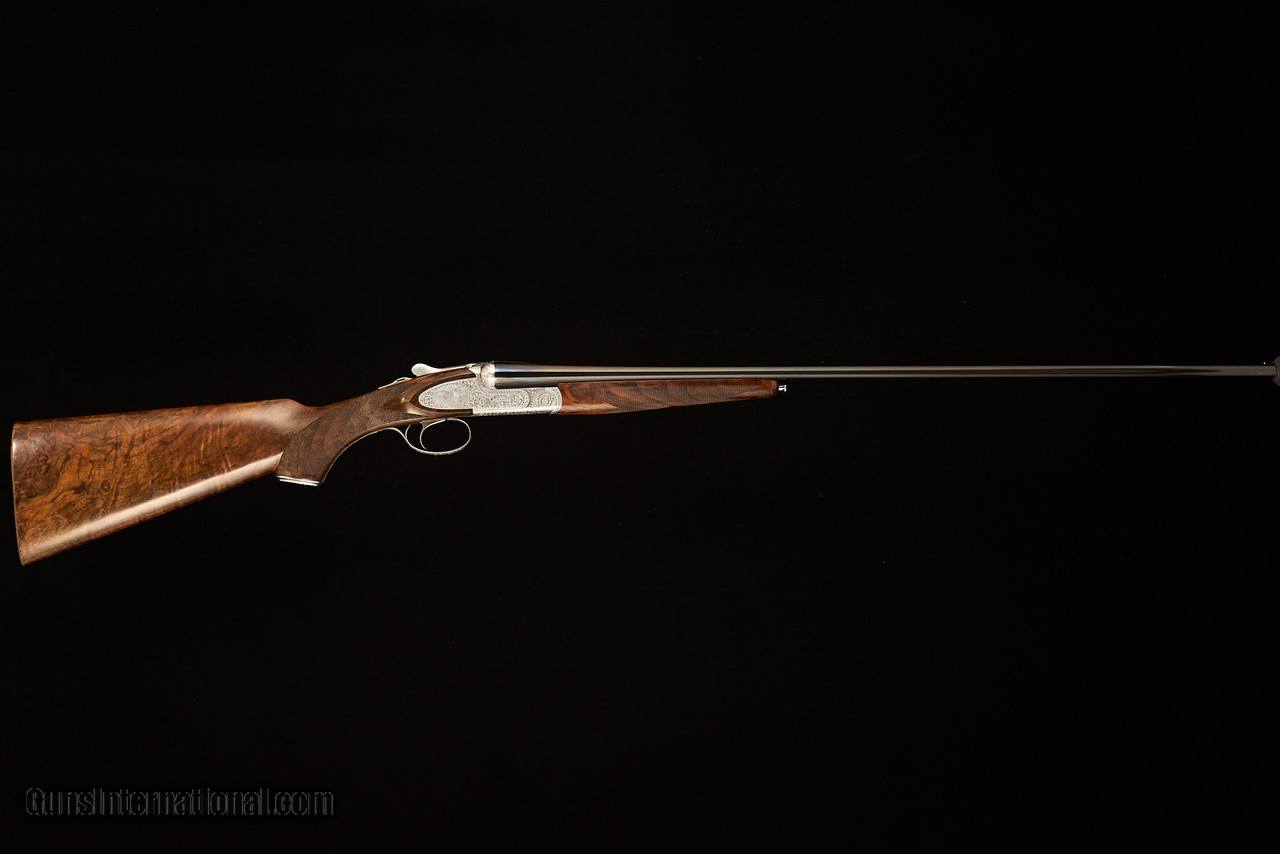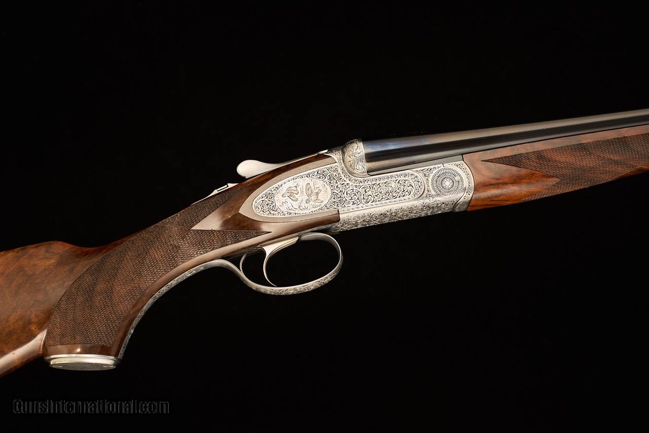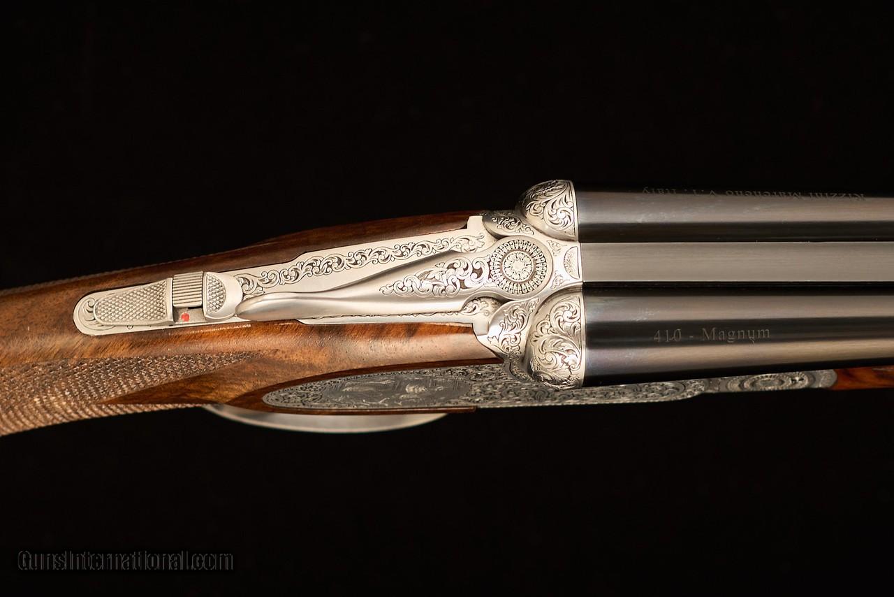 Description: Used/excellent Rizzini BR552 Special in .410 with 29" barrels, automatic ejectors, factory screw-in choke tubes, steel grip cap over long-tang trigger guard, and stock and forearm of highly-figured Turkish walnut with satin oil finish over a checkered butt. Single trigger features a barrel selector on the safety. Coin-finished action features rosettes over the pivot pin, a quail motif on each sideplate, and full coverage scroll over the remainder of the action. The swamped rib is smooth with front steel bead. Metal finish is in excellent condition, with only one small abrasion on the side of the left barrel just above and forward of the Anson rod forearm release. Stock finish is thin some areas, as expected on factory oil finishes, and shows scattered shallow handling marks mostly on the left side of the stock consistent with a right-handed hunter/shooter. Gun locks up tight and is on-face. Mechanical function is in as-new conditional in all discernable aspects. Comes in factory original case with chokes (C, IC, M, IM, F), choke wrench, stock sleeves, case sling, and paperwork. Manufacturer: Rizzini Caliber Info: 410 Gauge Barrels: 29 Action: Side by Side Gauge: 410 Gauge Price: $6,500.00 Contact Seller |