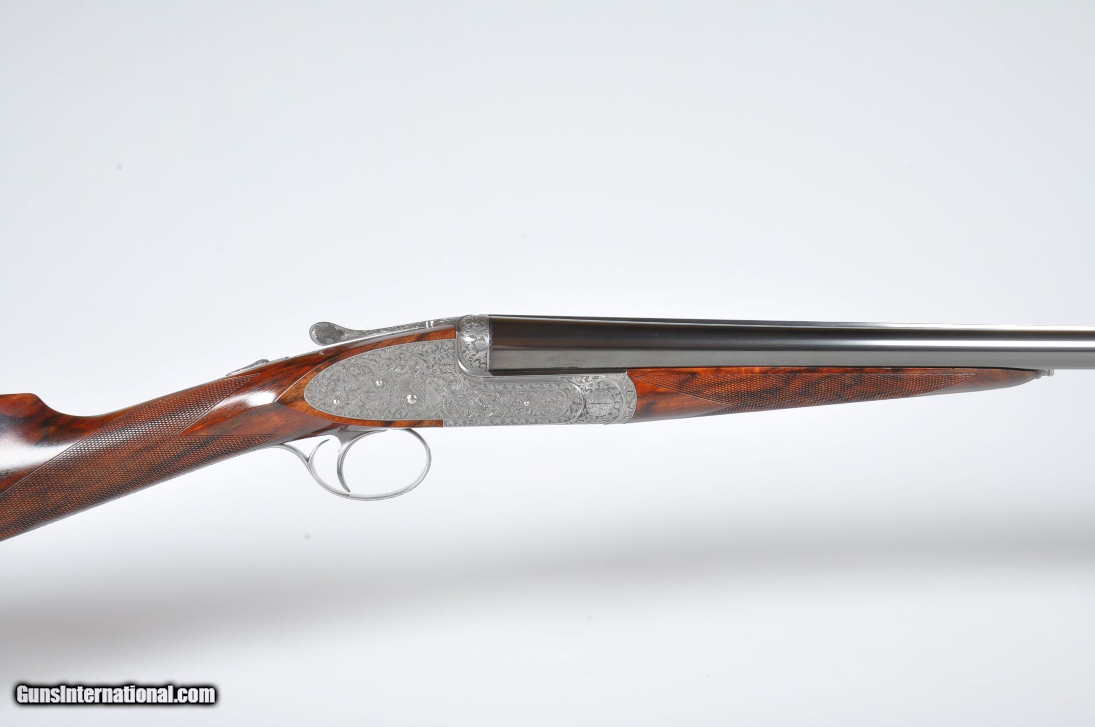 Description: 20 gauge, 2-3/4″ chambers. Beautifully struck 28″ chopper lump barrels are engraved “Flli RIZZINI – MAGNO V.T.” on narrow, game rib. Barrel flats are stamped with year 2000 Italian nitro proofs. Bottom of right barrel is engraved with importers name (William Larkin Moore). Coin finished, sidelock action features non-automatic safety and single non-selective trigger. It is engraved with full coverage truly exceptional semi-relief climbing and trailing open acanthus and scroll. This exceptional engraving melds into central motif of quartering portrait of swan, wing outstretched, on each lockplate. Bottom of action portrays this same swan face on. Fences are more deeply carved with scroll and acanthus. This theme extends to top lever and trigger guard. The serial number is on the tang. This striking engraving is by noted Italian engraver Stefano Muffolini, whose signature is on trigger plate. Beautifully marbled and lightly figured red-toned European walnut straight grip buttstock measures 14-7/8″ length of pull over skip line checkered wood butt. Stock shaping is flawless with sharp fields around lockplates, and crisp transition to grip, which is checkered in very well cut flat top borderless point pattern. Matching splinter ejector forend has Anson release. Bore diameter: left -.630, right -.632. Bore restrictions: left -.015 (mod), right -.009 (IC). Drop at heel: 2-1/8″, drop at comb: 1-7/16″. Weight: 6 lbs 3 oz. High quality tan leather case with stitched leather corners has green canvas outer cover with russet leather trim. Interior is lined in olive green felt, and has large paper Rizzini label in lid, along with info label for this gun. Case contains 2 piece walnut and brass cleaning rod with mop, brush, and jag (still in tissue), a pair of snap caps, and a round oil bottle. Condition: Essentially as new, appears unfired since proof, with only the faintest of light handling and assembly marks on wood and metal. Case leather is excellent, as protected by its outer cover, which has some scuffs and rubs. Interior is excellent. This esteemed maker produces fewer than a dozen guns each year. We prefer to communicate by email. We can not accept credit cards for collectible firearms. We have more than 500 Winchester Model 21s in stock in every grade and gauge. We also have hundreds of Parkers, Fox and LC Smith Shotguns so feel free inquire other fine shotguns. SOLD Manufacturer: Flli Rizzini Serial Number: 2230 Chambers: 2 3/4 Ejectors: Yes Barrels: 28 Triggers: Single Gauge Info: 20 Stock: Straight Fore End: Splinter LOP: 14 7/8 Weight: 6 lbs 3 oz Engraving: Muffolini Case: Yes |