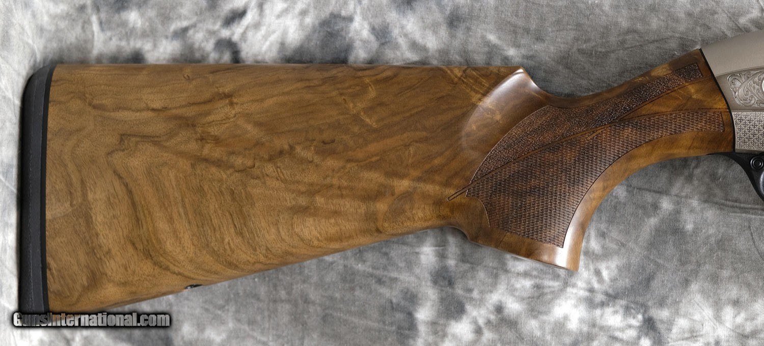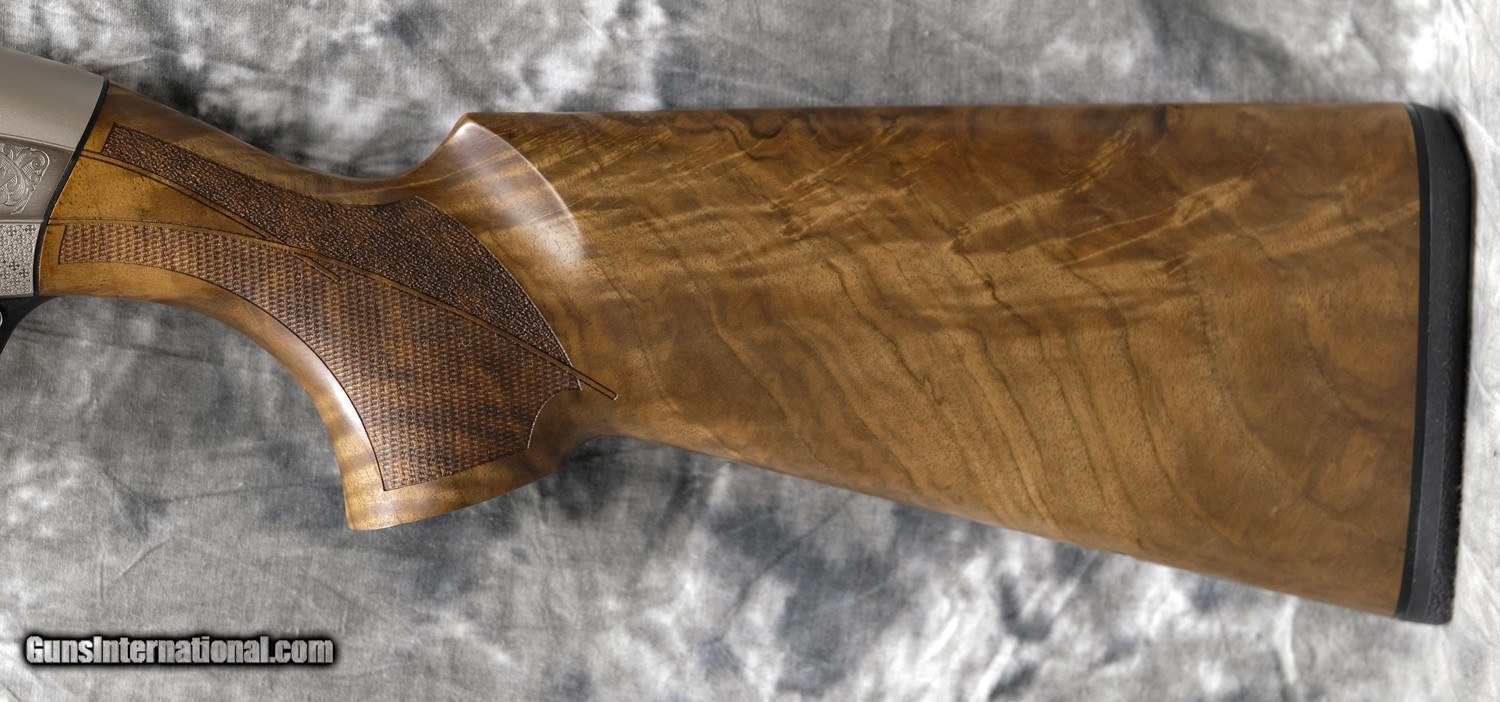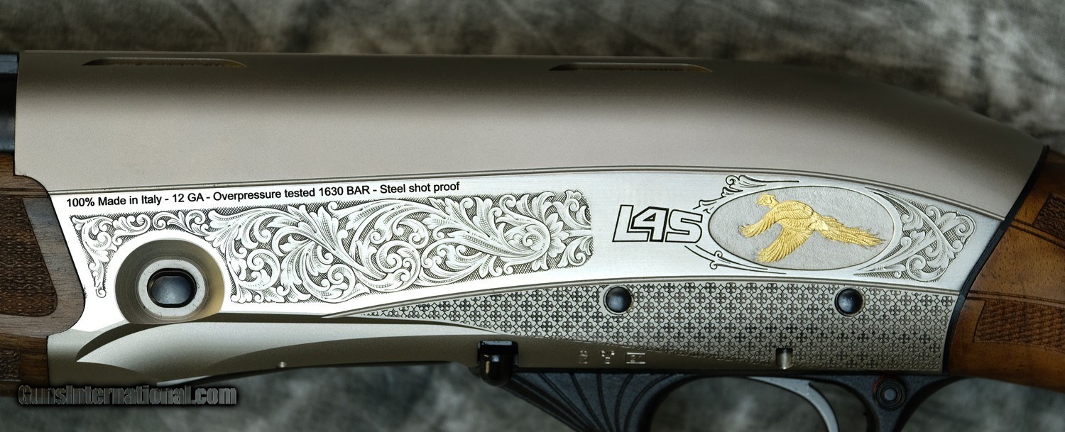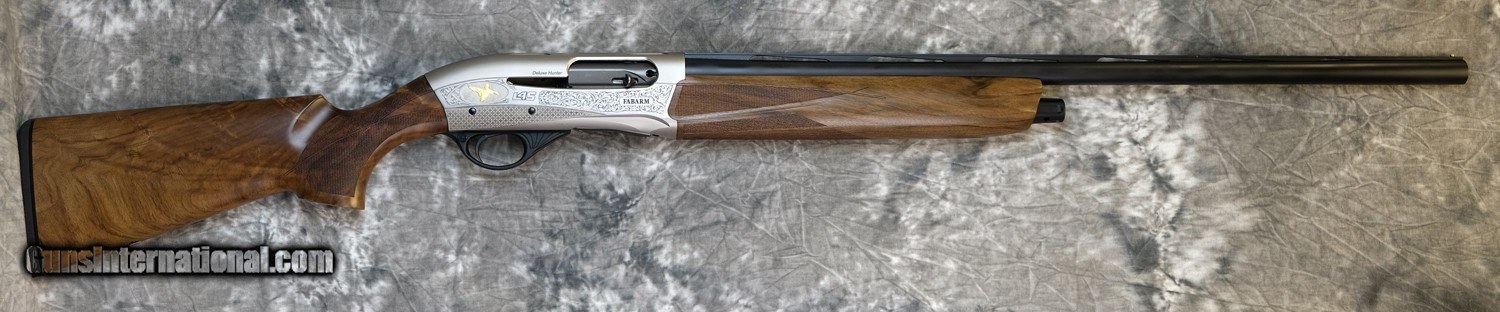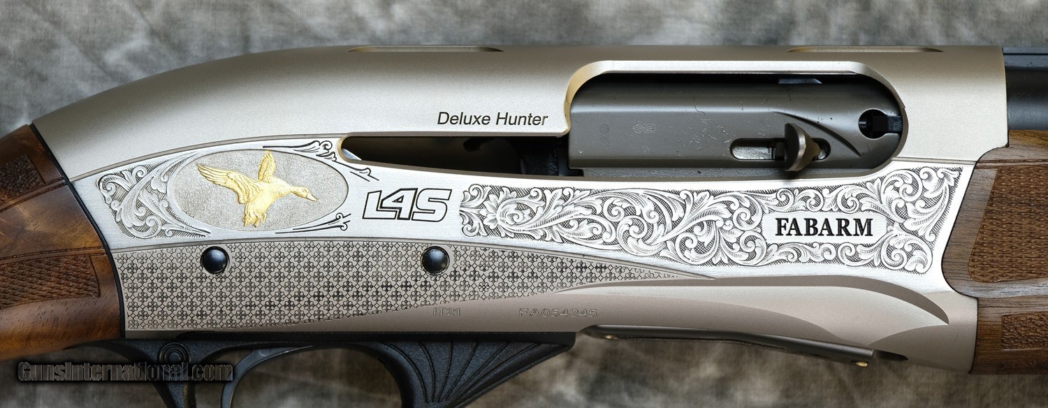 Description: New Fabarm L4S Deluxe Hunter 12GA with 28" factory choke tubed barrel, narrow field rib. Nickel finished action featuring scroll engraving and deeply engraved game scene inlaid in gold. Upgraded factory pistol grip field stock with field forearm. Includes factory case, chokes and tools. Call 626-633-1002 for pricing. SOLD Shotgun Gauge: 12 Gauge |
