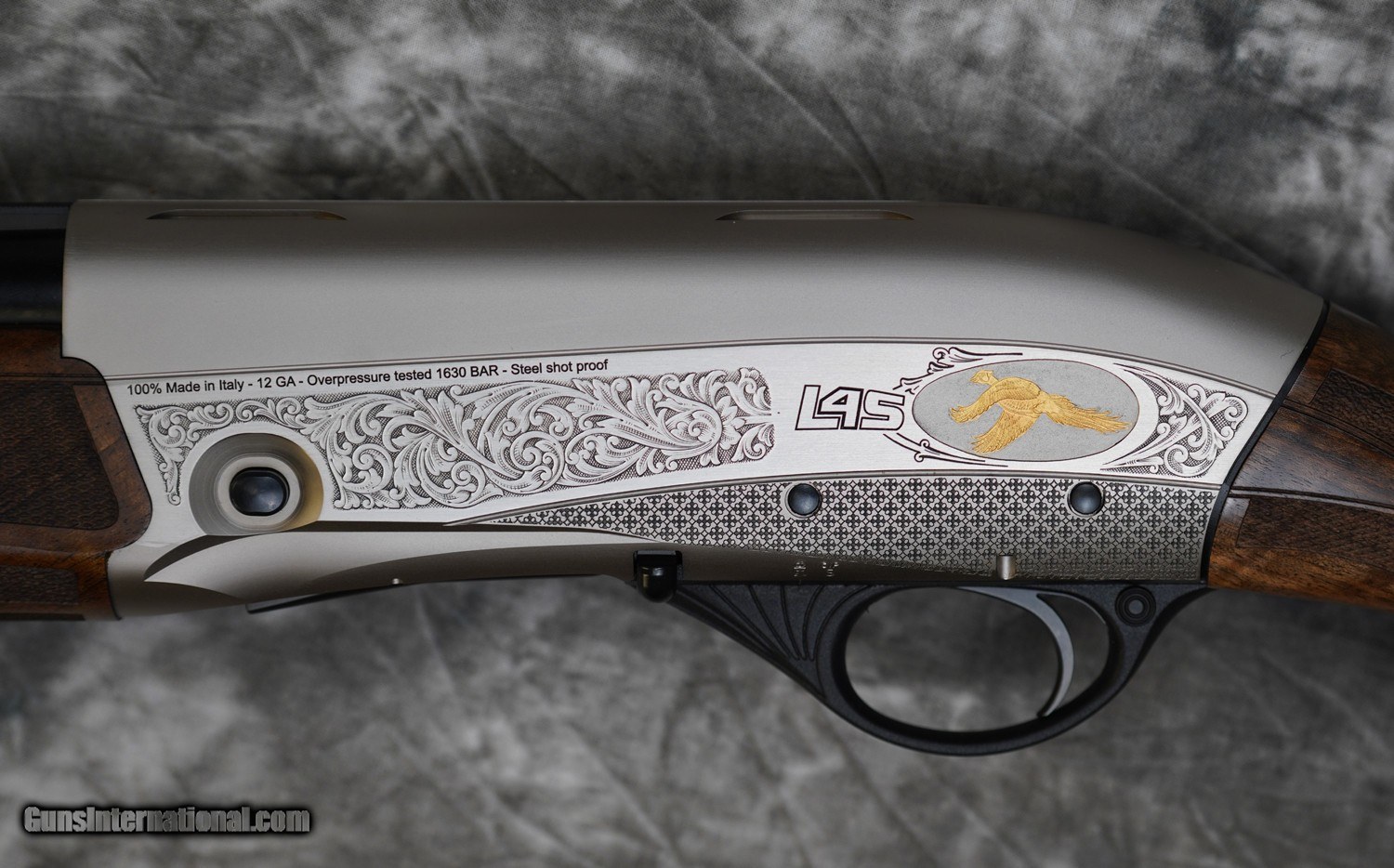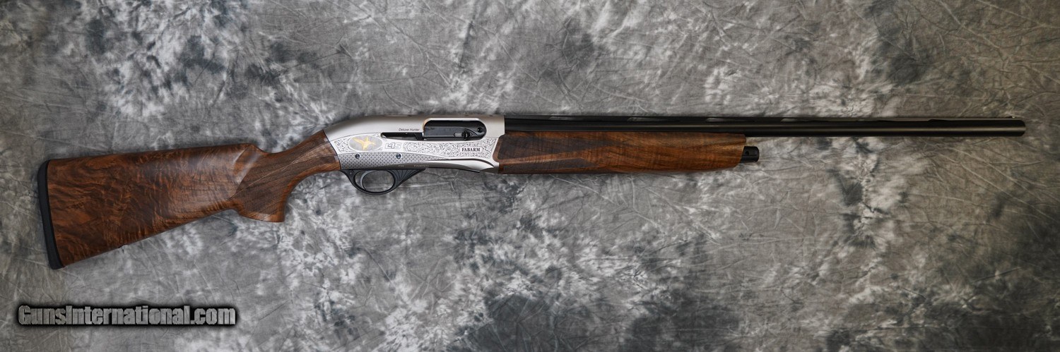 Description: New Fabarm L4S Deluxe Hunter 12GA with 28" factory choke tubed barrel, narrow game rib. Nickel finished action with scroll engraving and game scene medallion inlaid in gold. Factory pistol grip field stock with field forearm. Includes factory case, chokes and tools. Call 626-633-1002 for pricing. SOLD Shotgun Gauge: 12 Gauge |