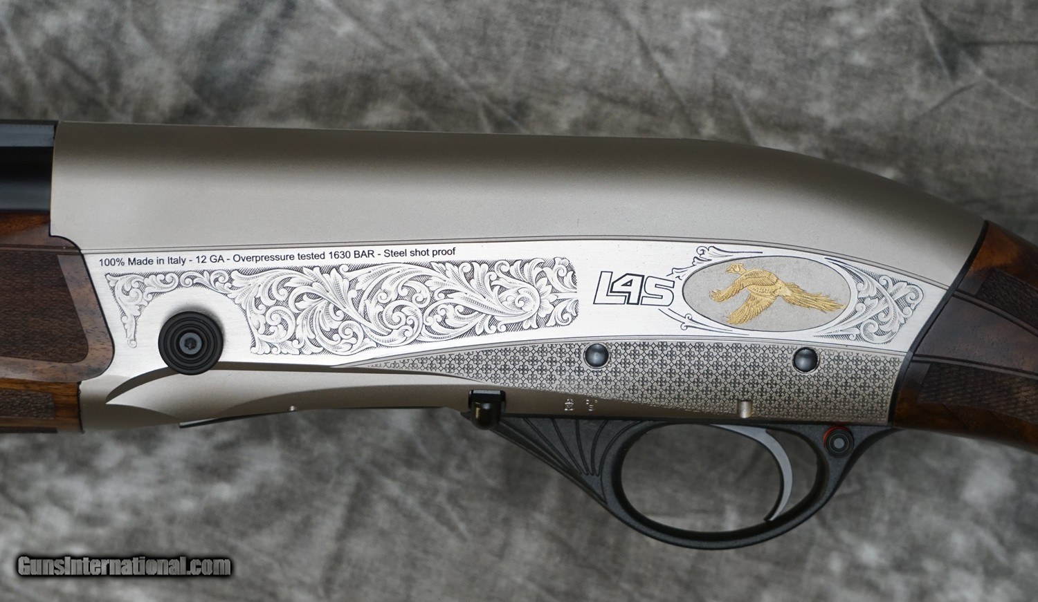 Description: New Fabarm L4S Deluxe Sporting 12GA with 30" factory extended choke tubed barrel, flat tapered sporting rib. Nickel finished action with scroll engraving and deeply engraved game scene inlaid in gold. Factory pistol grip sporting stock with sporting forearm. Includes factory case, chokes and tools. Call 626-633-1002 for pricing. SOLD Shotgun Gauge: 12 Gauge |