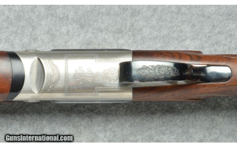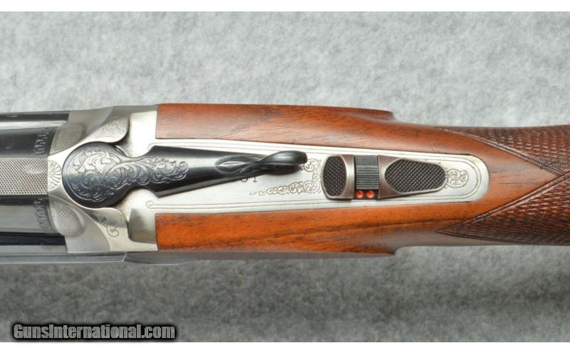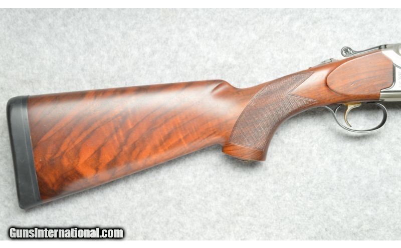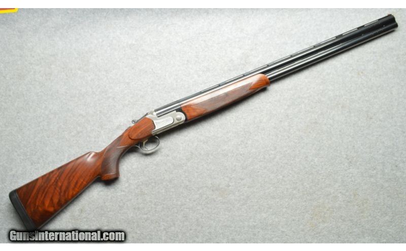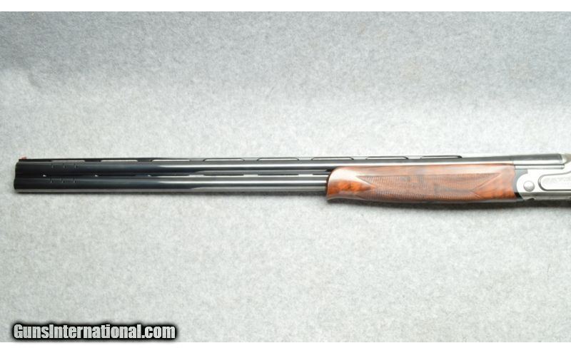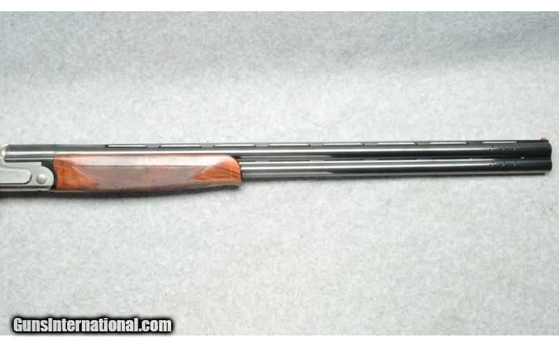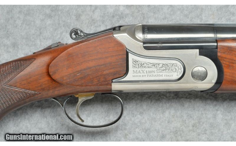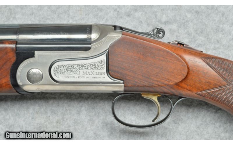Description: Manufactured in Italy by Fabarm for Heckler & Koch. Feature Hi-Viz sight on vent rib barrel chambered for 3" shells, screw-in Exis choke system with 8 different chokes. Adjustable single selective gold trigger and tang safety/selector. Case colored receiver shows three gold inlaid sporting clays on each side, bottom is engraved "FABARM / MAX" with a Belgian Lion surrounded by laurels in between. Select walnut checkered forearm and pistol grip stock with gold lion medallion on grip cap, and rubber recoil pad. SOLD Manufacturer: Modern manufacture. Caliber Info: 12 Ga. Chambers: Break action, two round over/under configured with 3 inch chambers. Metal Condition: Very good. Wood Condition: Very good. Bore Condition: Very good. Barrels: 30 inch smooth bore blued barrels with porting and vent rib. Triggers: Gold colored trigger is position adjustable, barrel selector safety is tang mounted. Stock: Checkered walnut pistol grip stock. Stock Dimensions: 14 7/8 inch length of pull. Fore End: Checkered walnut fore-end matches the stock. Butt Pad: Black rubber recoil absorbing butt pad. Weight: 7 1/8 pounds. Sights: Red fiber optic front sight, small brass bead mid vent rib. Chokes: Interchangeable chokes, Cylinder over Modified. Item Location: Berlin, MA |