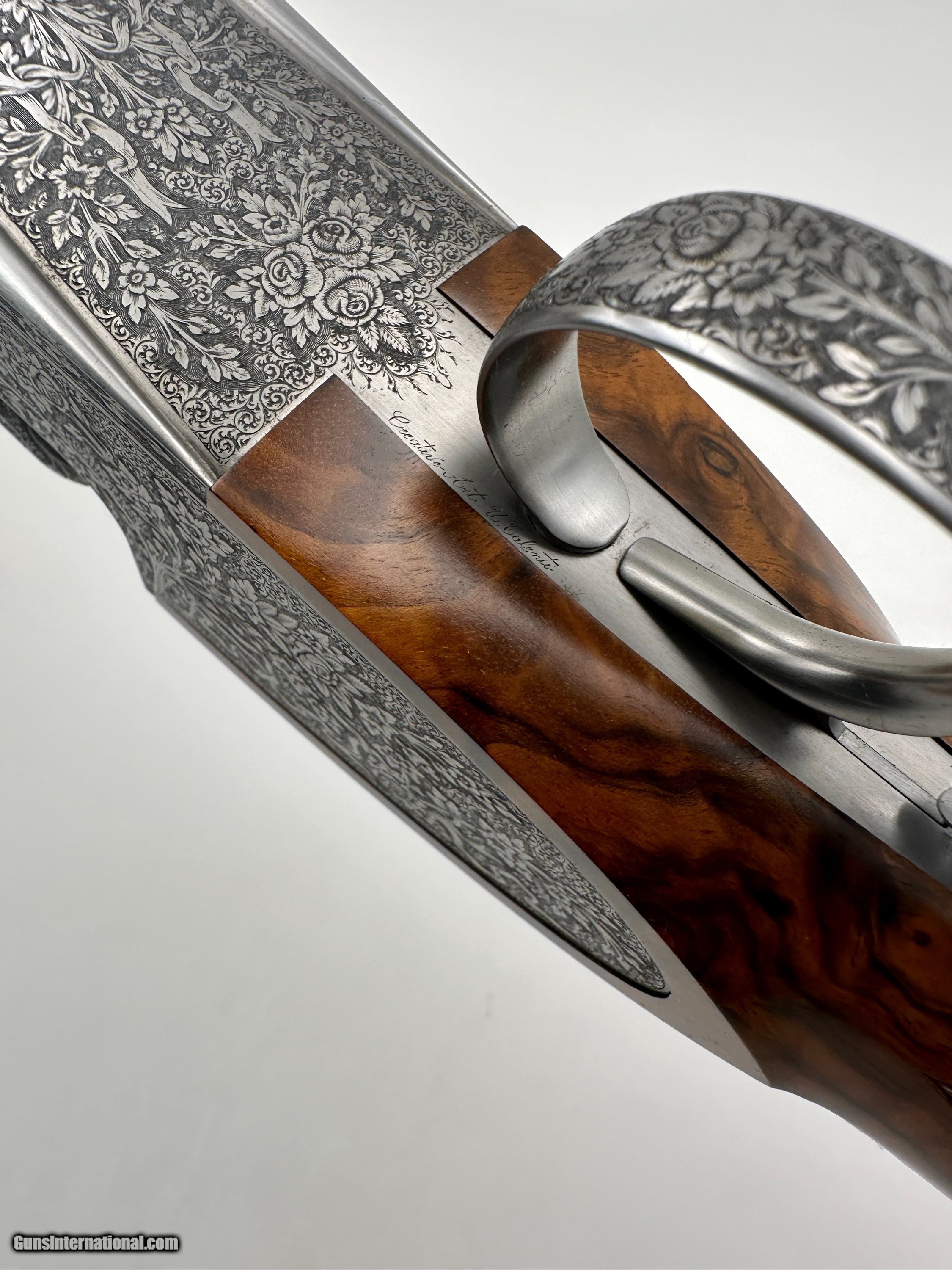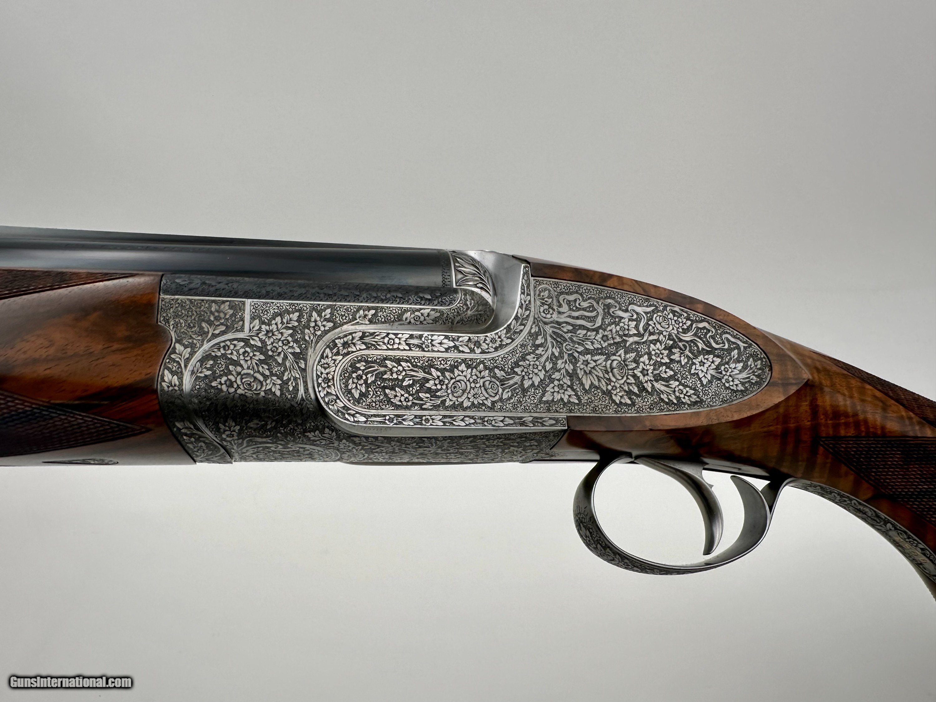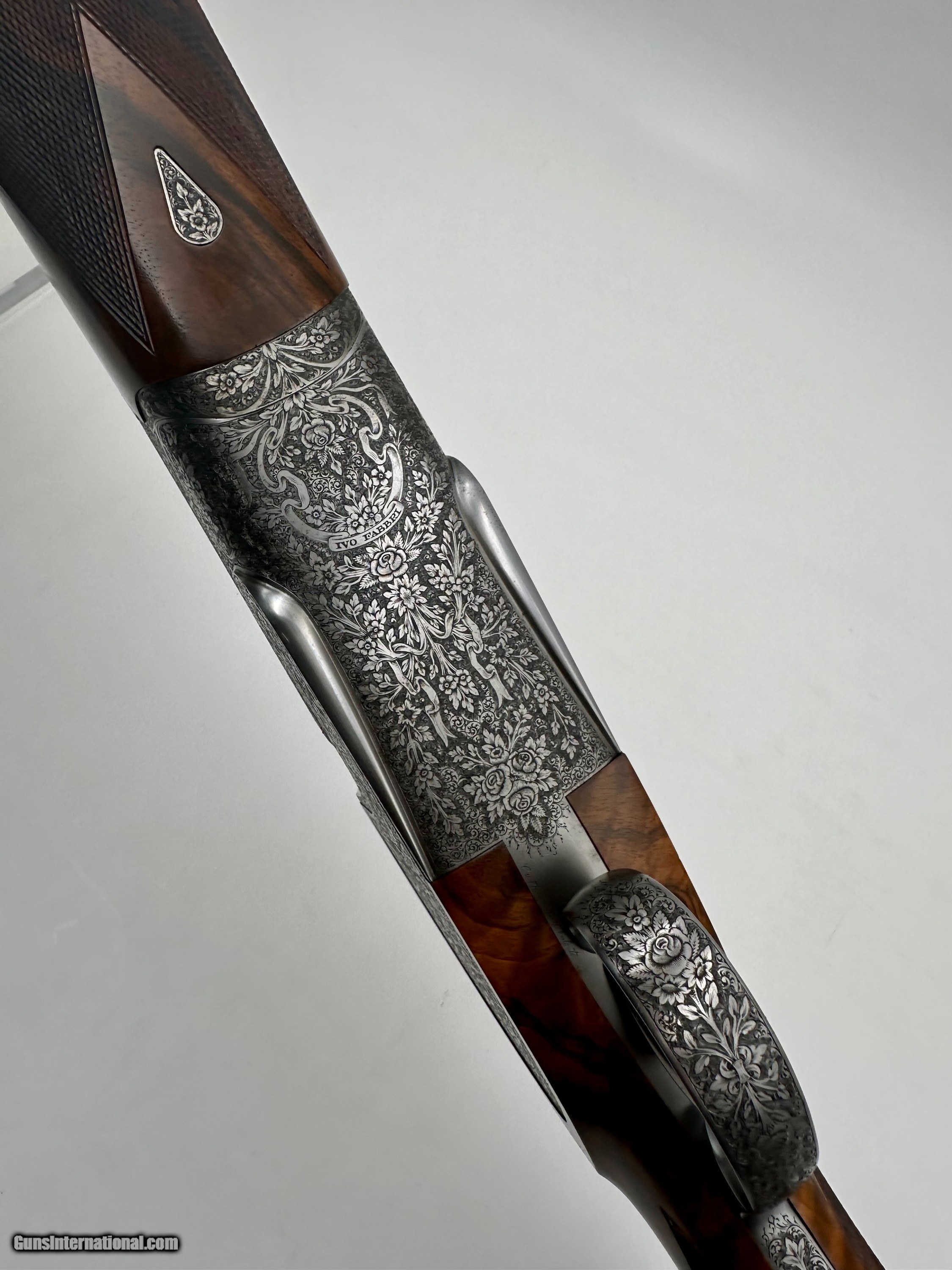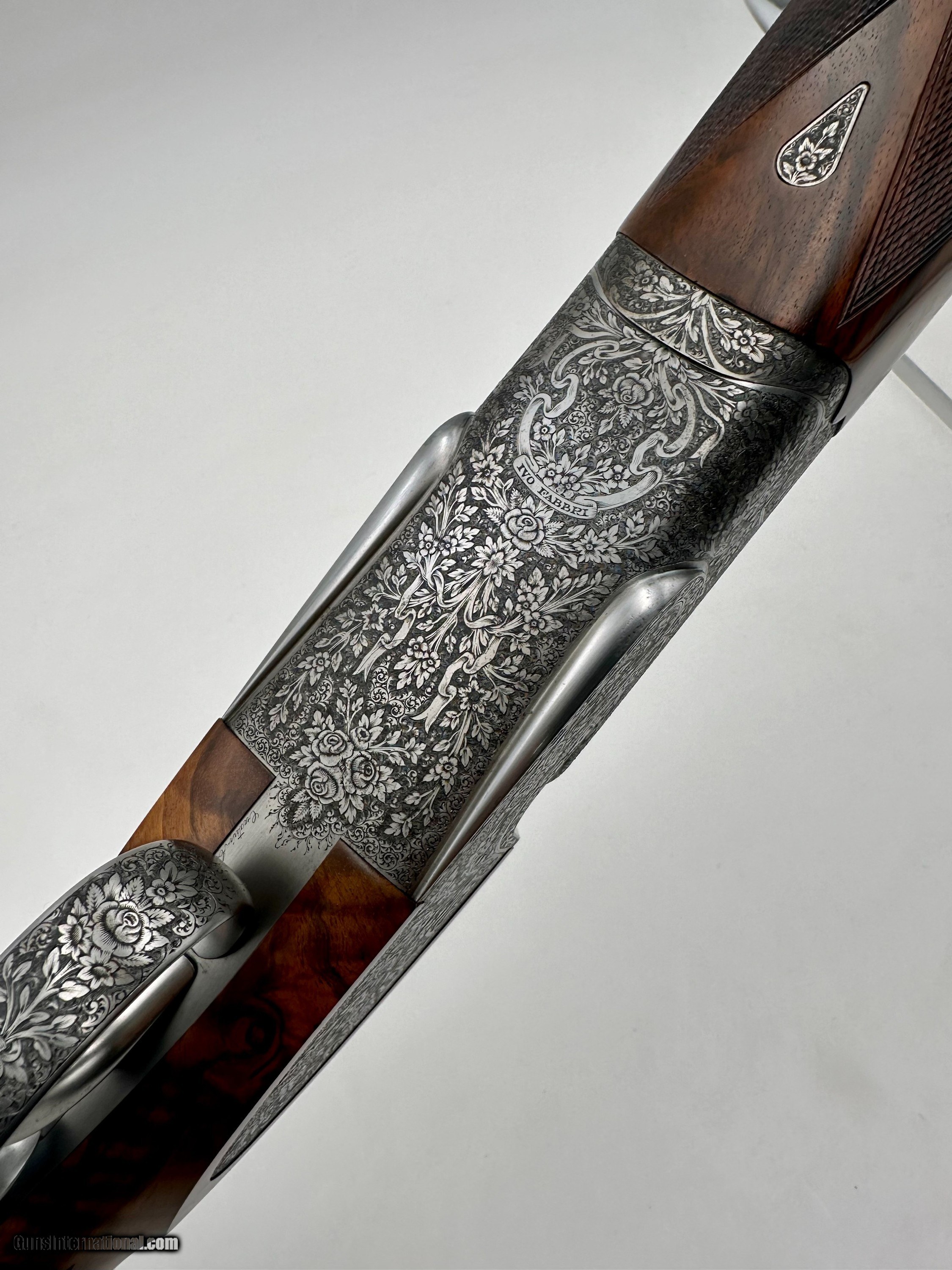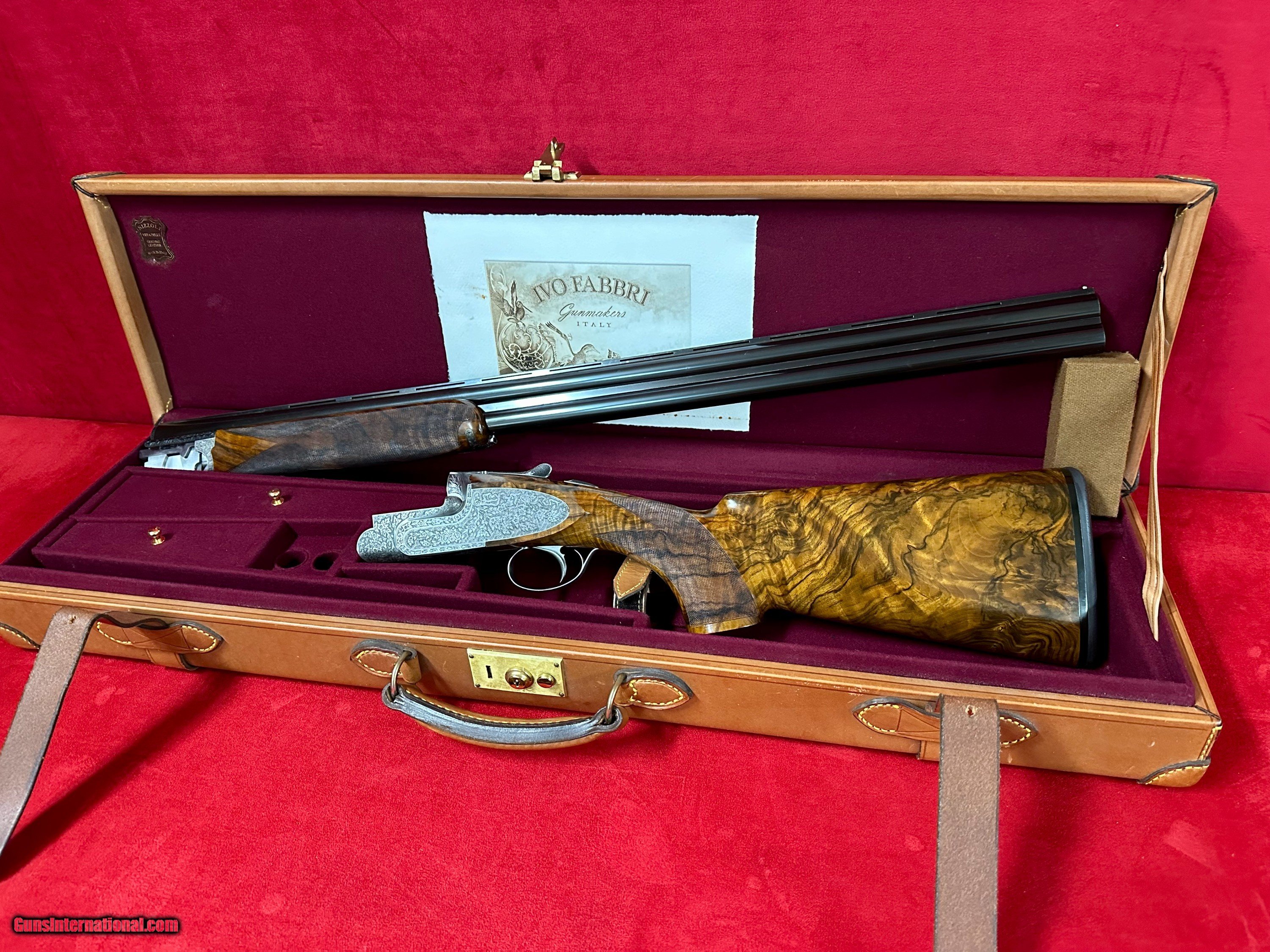 Description: Fabbri IVO 2002 Pinless Model in LIKE NEW condition. Serial #E85X. Engraved by Creative Arts but also engraved and signed by Master engraver Ugo Talenti which was one of the founders of Creative Arts in a beautiful fine floral pattern with full coverage large swags of flowers, foliage and ribbons in a background of small scroll. Many different layers of depth in this engraving pattern. Pinless sidekicks with hidden screw under flap on right lockplate. This gun is 100% original as it came out of Fabbri and remains in LIKE NEW condition with Gorgeous Turkish Walnut Stock Barrel Specs: 29.5 inch Demi Block barrels with Vacuum Remelting Steel 1.450kg 18.5 bore 10x7 tapered rib Fixed choke .021 bottom and .035 top Stock dimensions: 1.50 x 1.875 No Palm swell 5/8 cast off at toe for right handed shooter Length of pull is 14.125 but to very thin 1/2 pad Total weight of gun is 7lbs 10oz Comes in original Fabbri leather case SOLD Shotgun Gauge: 12 Gauge |