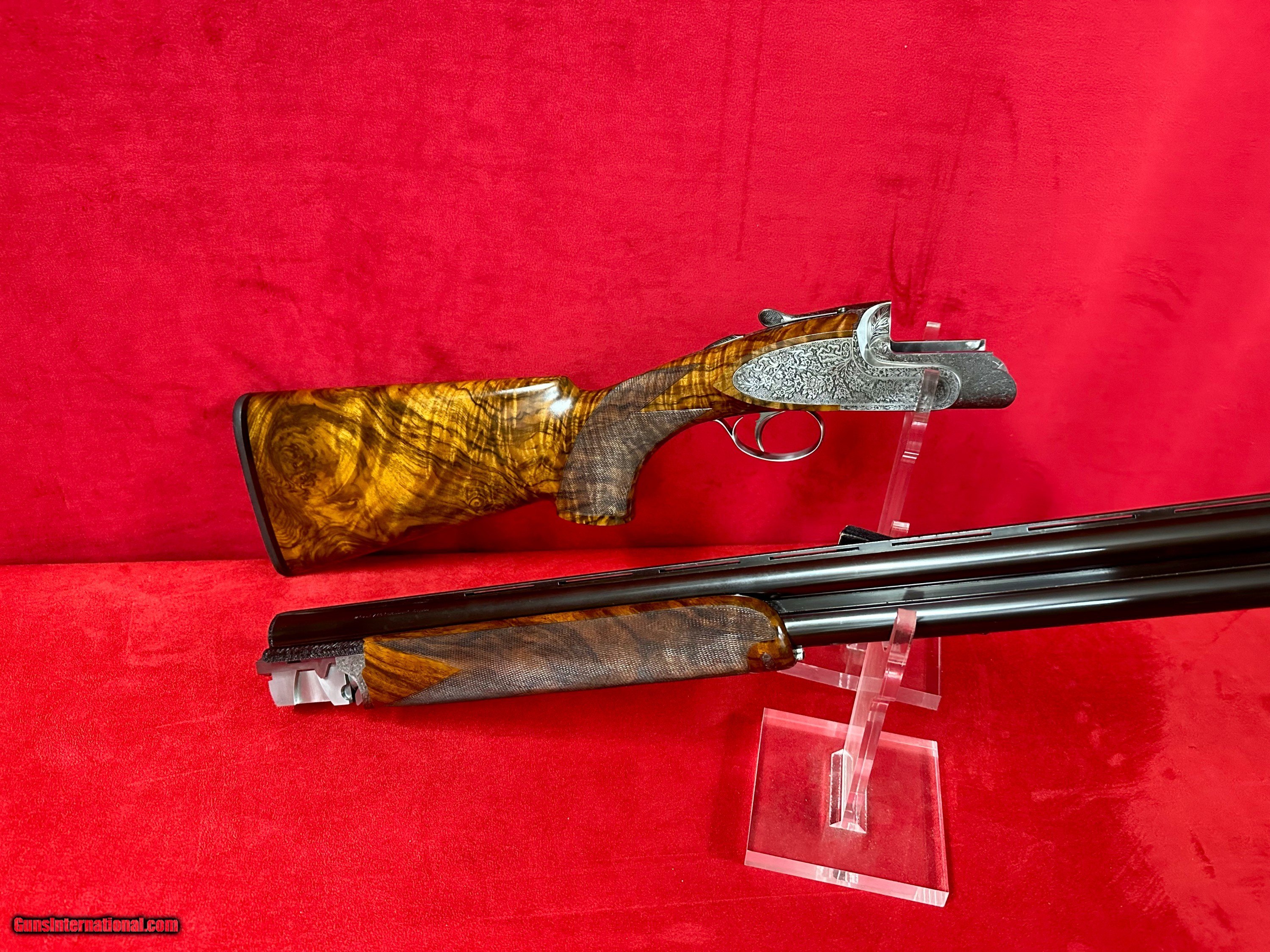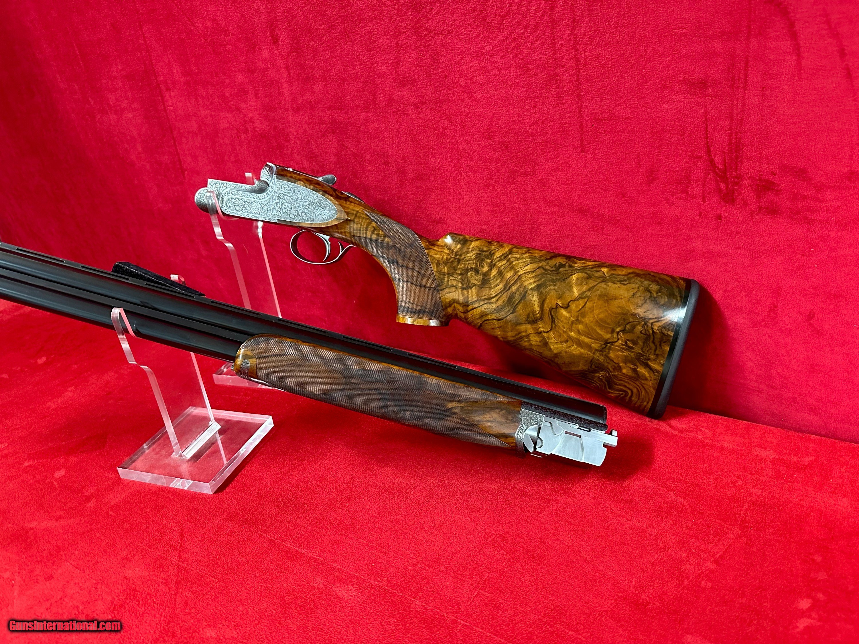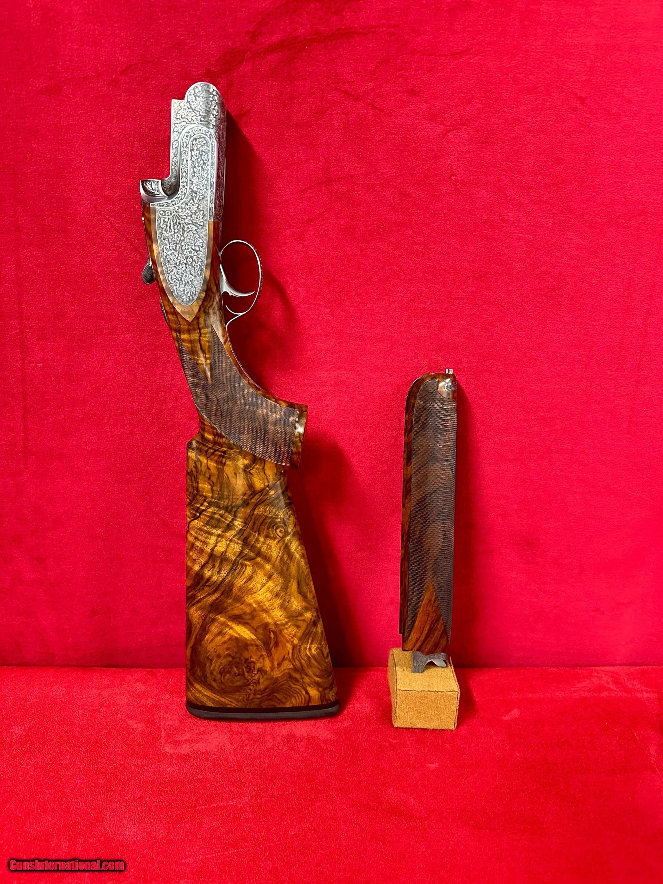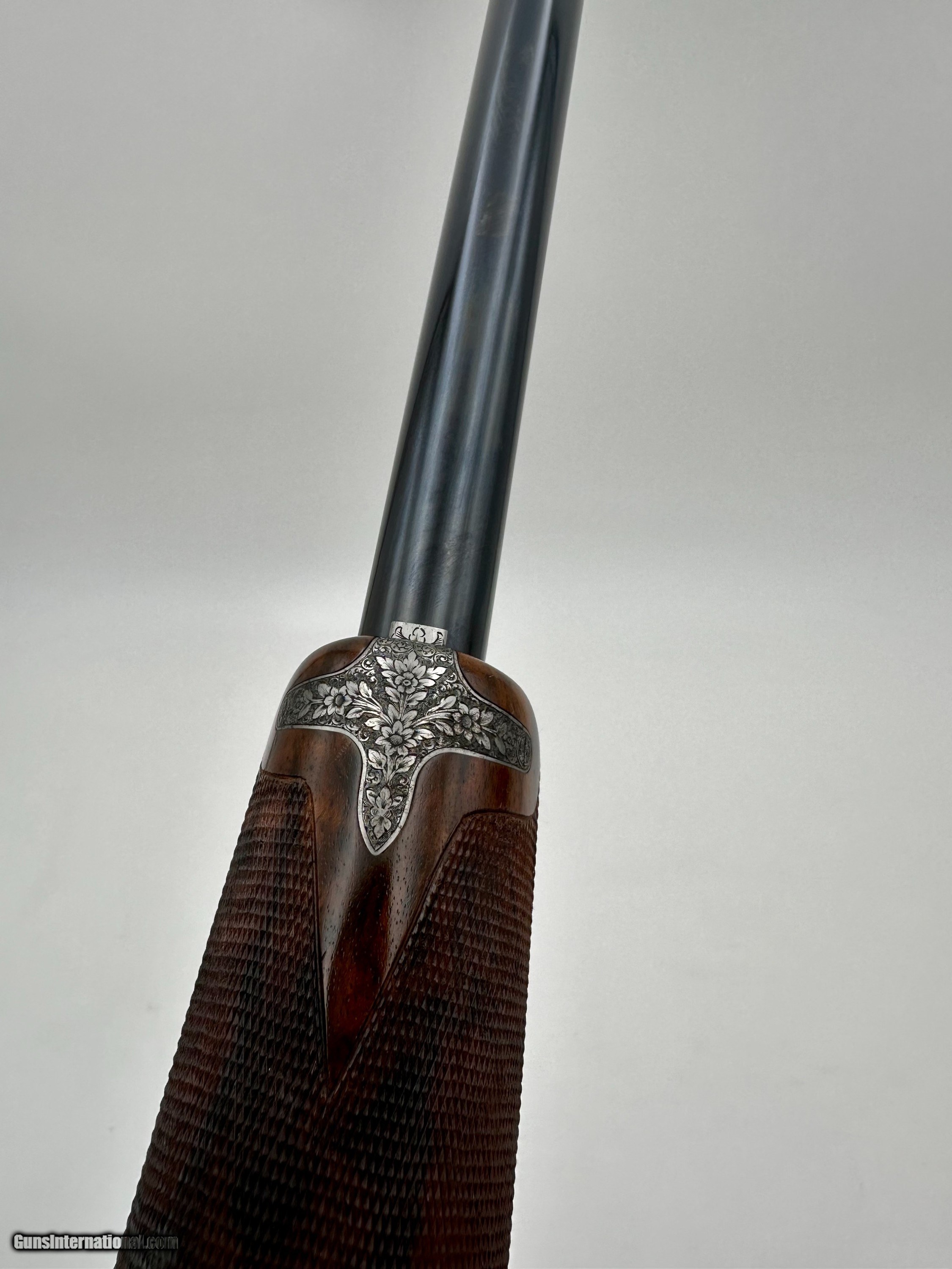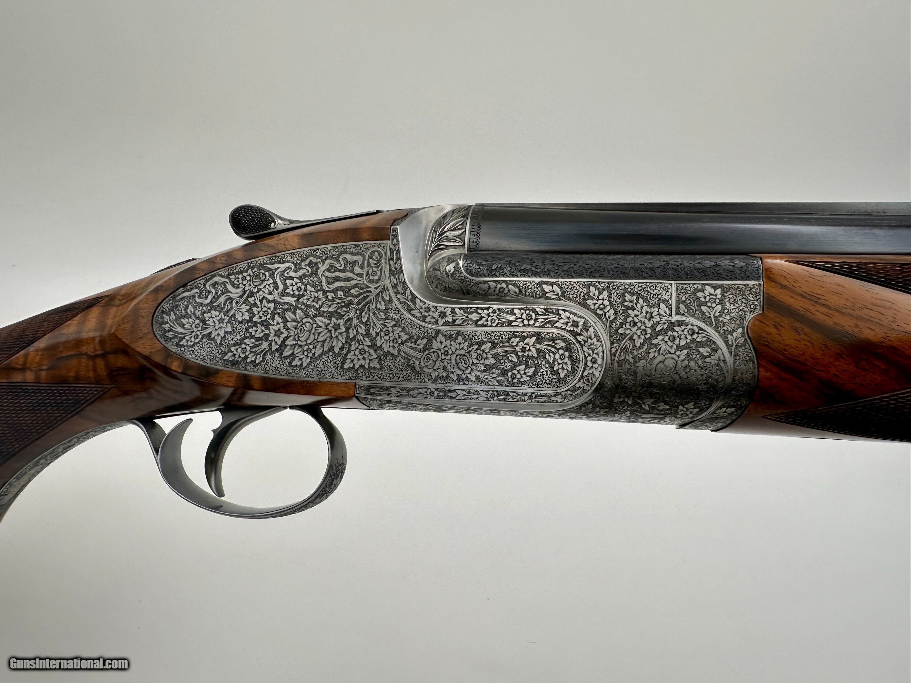 Description: Fabbri IVO 2002 Pinless Model in LIKE NEW condition. Serial #E85X. Engraved by Creative Arts but also engraved and signed by Master engraver Ugo Talenti which was one of the founders of Creative Arts in a beautiful fine floral pattern with full coverage large swags of flowers, foliage and ribbons in a background of small scroll. Many different layers of depth in this engraving pattern. Pinless sidekicks with hidden screw under flap on right lockplate. This gun is 100% original as it came out of Fabbri and remains in LIKE NEW condition with Gorgeous Turkish Walnut Stock Barrel Specs: 29.5 inch Demi Block barrels with Vacuum Remelting Steel 1.450kg 18.5 bore 10x7 tapered rib Fixed choke .021 bottom and .035 top Stock dimensions: 1.50 x 1.875 No Palm swell 5/8 cast off at toe for right handed shooter Length of pull is 14.125 but to very thin 1/2 pad Total weight of gun is 7lbs 10oz Comes in original Fabbri leather case SOLD Shotgun Gauge: 12 Gauge |
