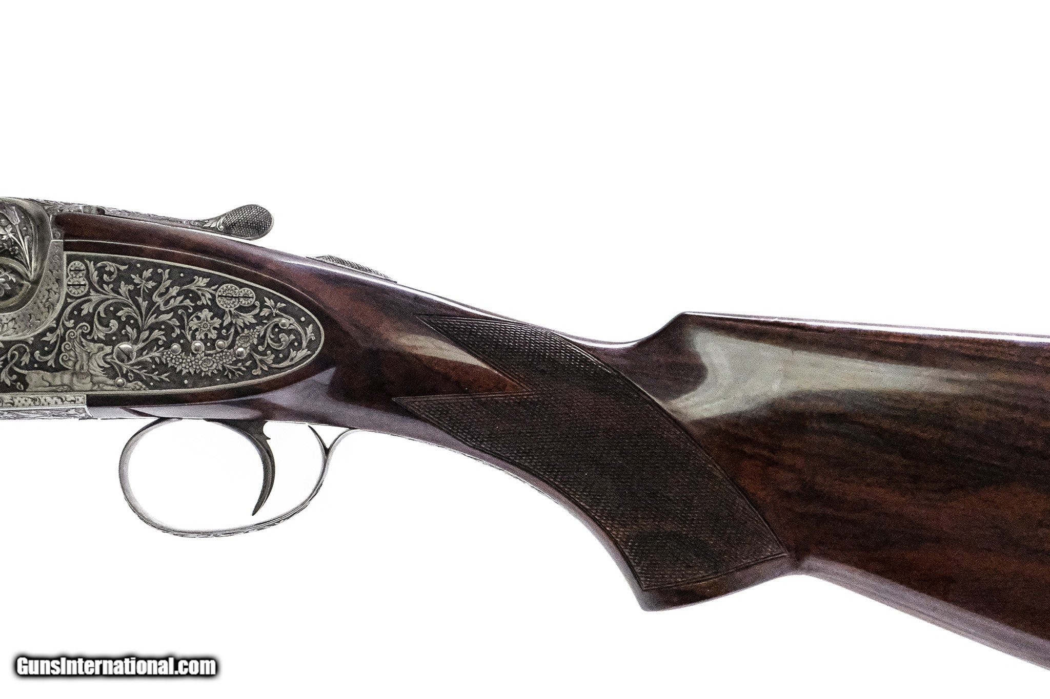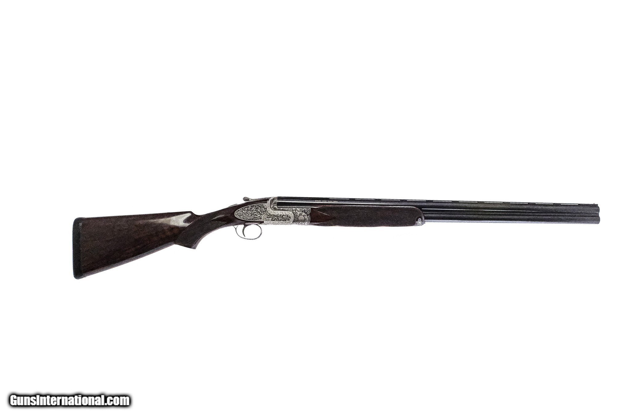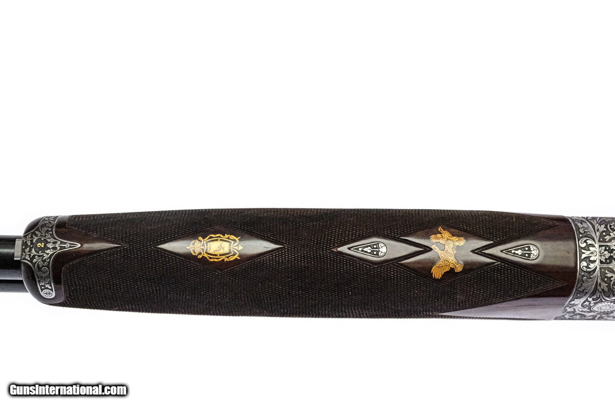 Description: Fabbri - O/U, 12ga. 27" Bohler Barrels. Deep chisel engraved, 27” Bohler barrels, 2 ¾” chambers, straight grip, leather cover pad, extremely rare, only a few guns ever made this way with a single trigger, very unusual swept prince of whales pistol grip, gold medallions inlaid in wood by factory of quail. Highly figured Turkish walnut, minor handling marks but virtually unused, originally #2 of pair, vent rib. Just a superb find of an extra special gun, that was special ordered with one of a kind features, and priced at a fraction of the cost new. Inv: 69433 7 lbs. 3 oz. 14 ¾" x 1 3/8" x 2 1/8" $59,500.00 SOLD |