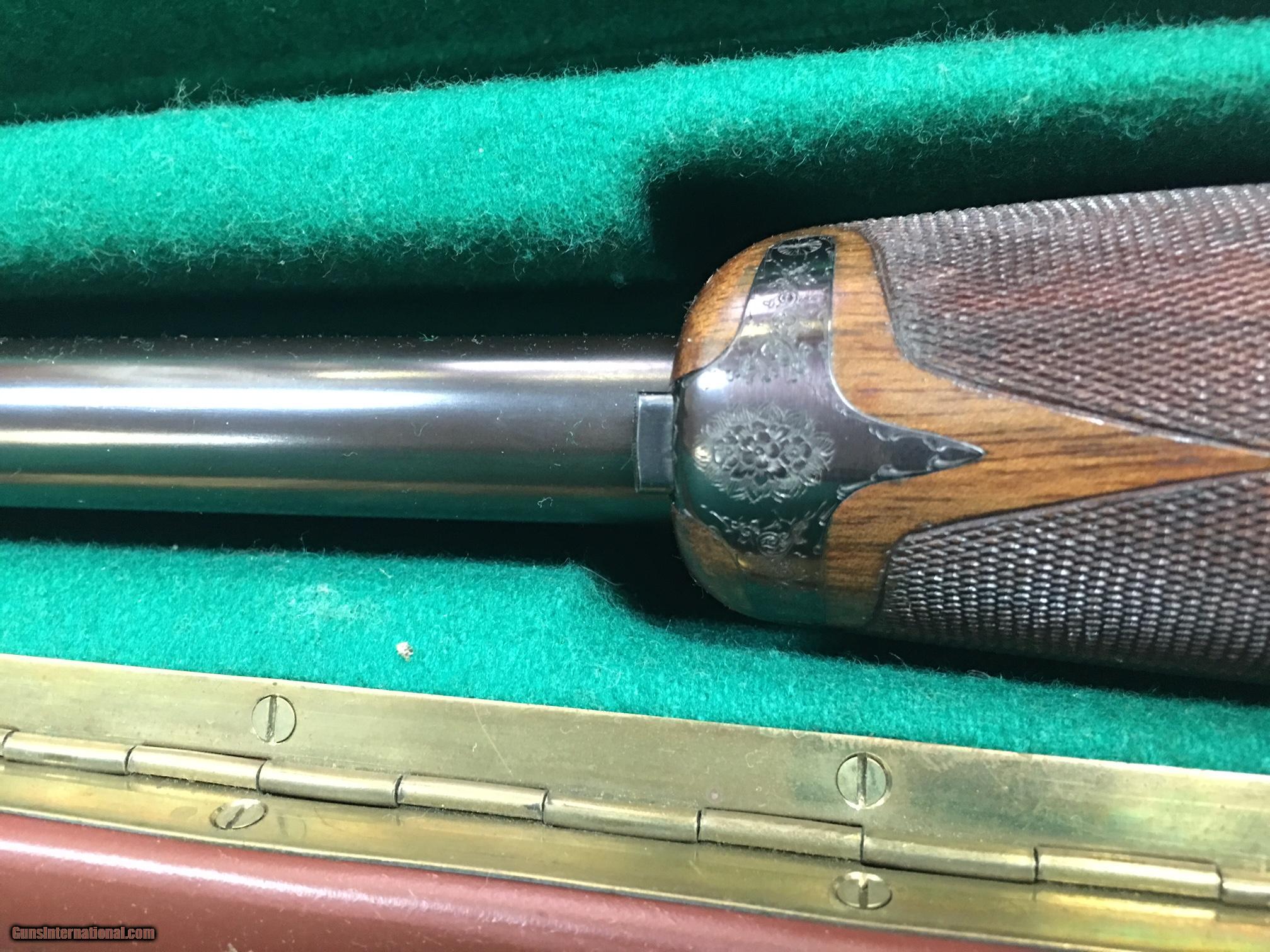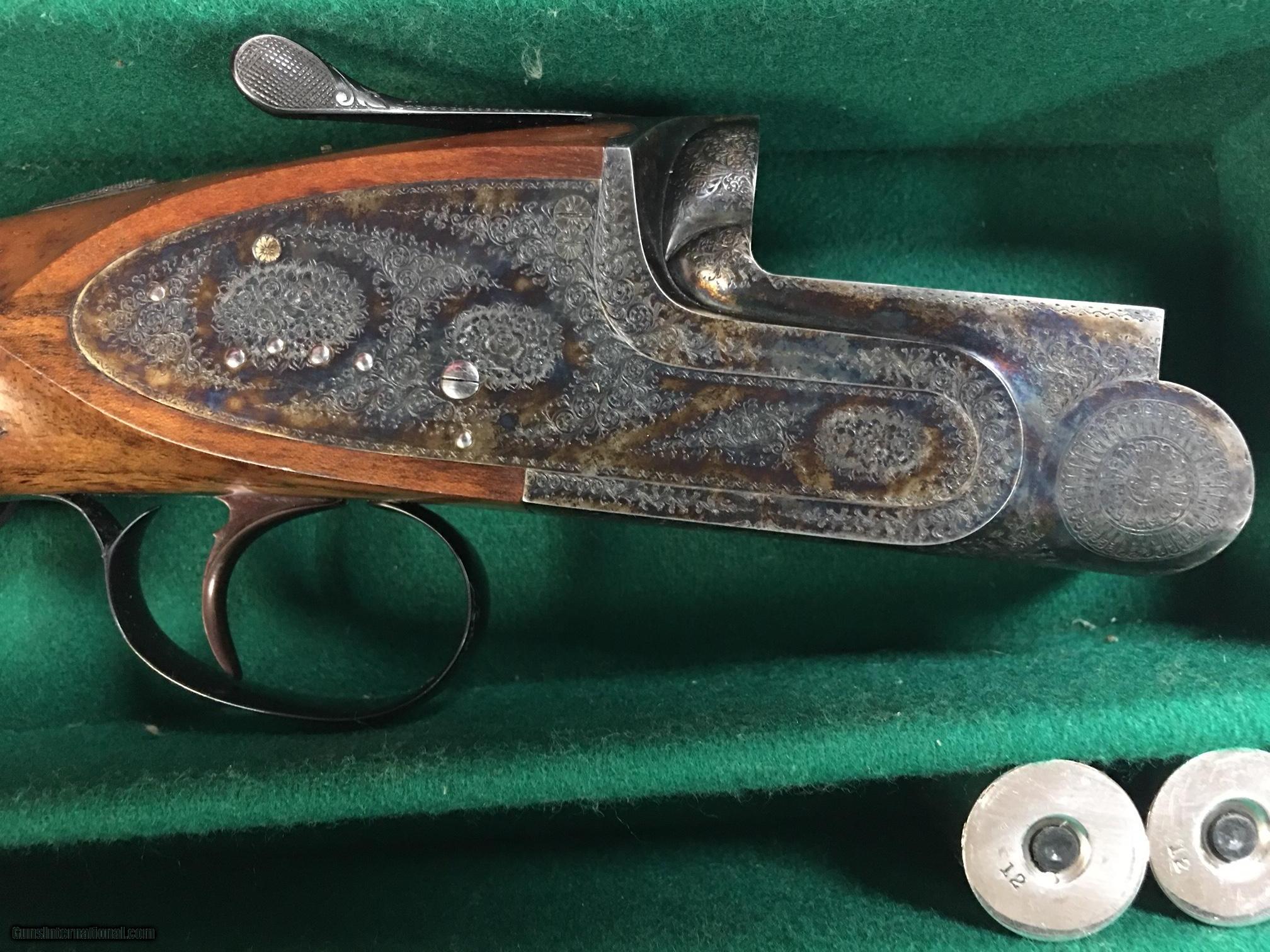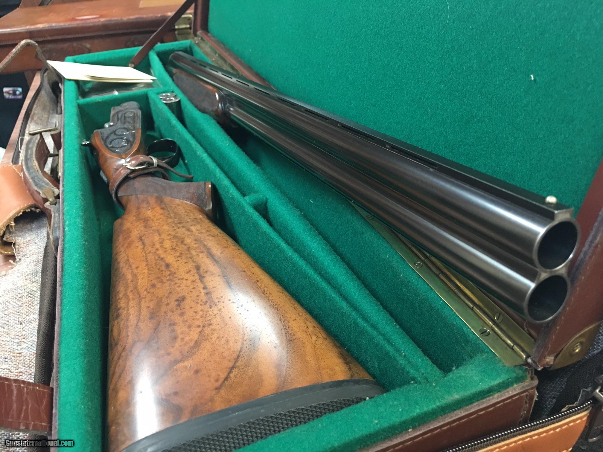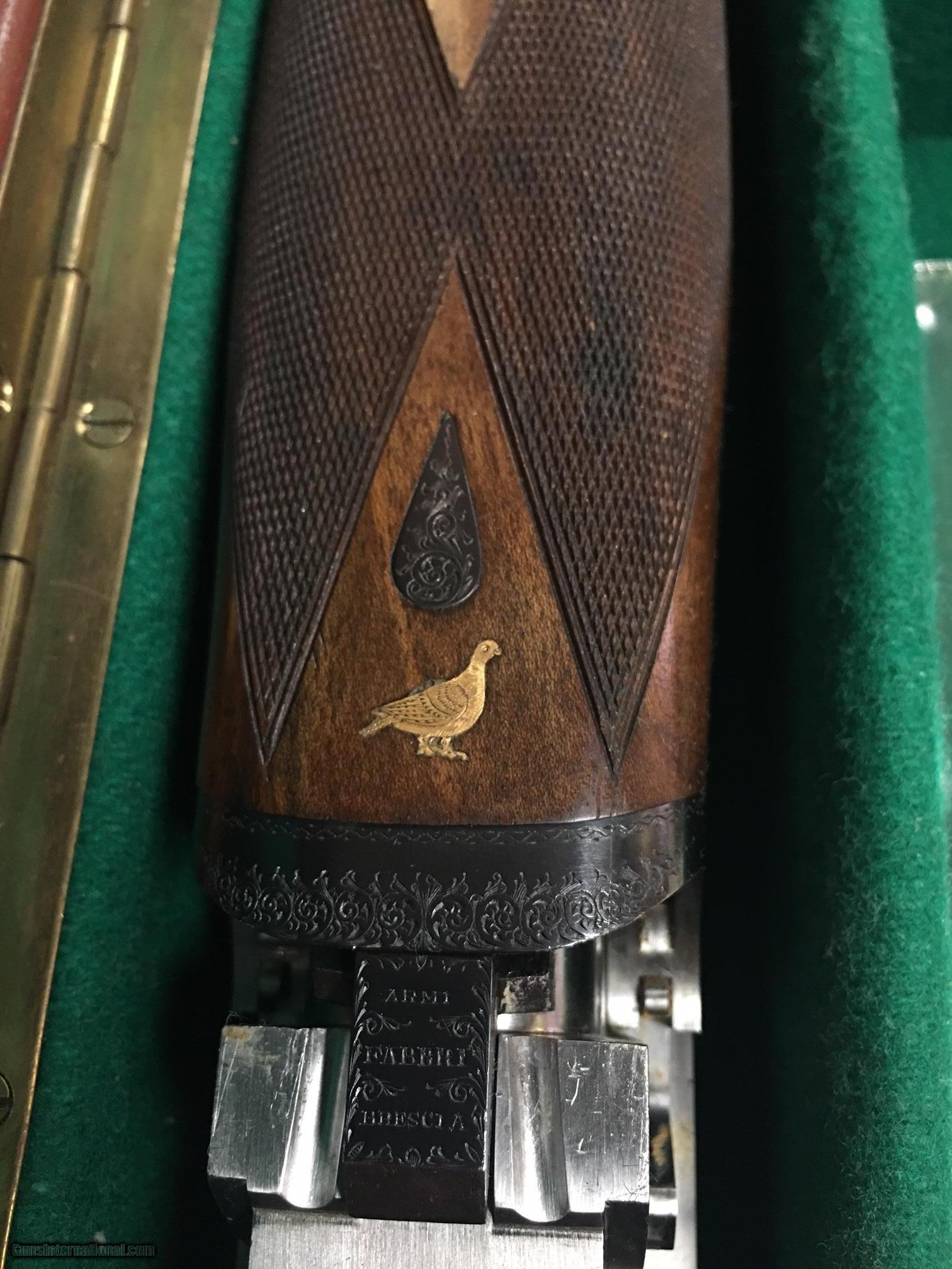 Description: GREAT ESTATE FABBRI Fabbri – Superposed Pigeon Sidelock O/U, 12ga. 28” BOHLER barrels fixed chokes - under/right 18.5 (4/10), over/left 18.5 (8/10) Single trigger, pistol grip, ventilated rib, beavertail forend, recoil pad, automatic ejectors, gold pigeon on forearm, the engraving features gorgeous miniature English Rose and Scroll. Marked F.IORA, Inc in front the trigger gaurd. 3 digit SERIAL Number = E*** weight 3.435 kg Length of pull - 14 1/4 Drop at heel - 1 3/8 Drop at comb - 1 /4 The gun has been cased in leather trunk case and stored many years. Estate sale, not fired/tested. Looks to be in great condition with no dings, dents or bulges on the barrels. Wood may be walnut - please check pictures. Available for immediate delivery. Will only ship to a FFL, FedEx 2nd day air. Please call or email with questions or more pictures. We will be happy to answer questions. Several other old shotguns available in other s, Boss, Le Beau, Dickson. $45,000 us dollars SOLD Manufacturer: Fabbri Model: Pigeon Ejectors: automatic Barrels: bohler Action: o/u Gauge Info: 12 Stock Comb: 1 1/4 Stock Heel: 1 3/8 LOP: 14 1/4 Weight: 7.57 Chokes: fixed Engraving: English Rose Case: leather box |