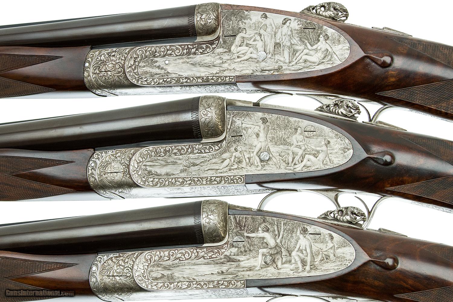 Description: THE 20 GAUGE IS 28" CYLINDER AND FULL THE 28 GAUGE IS 27 1/2 IMPROVED MODIFIED AND FULL THE 410 IS 28" MOD AND FULL THE GUNS HAVE SPECIAL SERIAL NUMBERS REMO TONY AND FRANCO GODDESS OF THE HUNT ENGRAVED SINGLE TRIGGER EJECTORS SEMI BEAVERTAIL FOREARMS ENGLISH GRIPS CHECKERED BUTTS VENTILATED RIBS NEW CONDITION IN MAKERS 3 GUN MOTOR CASE ALL ARE 2 1/2 X 1 1/2 X 14 1/4 NEW UNFIRED SOLD |