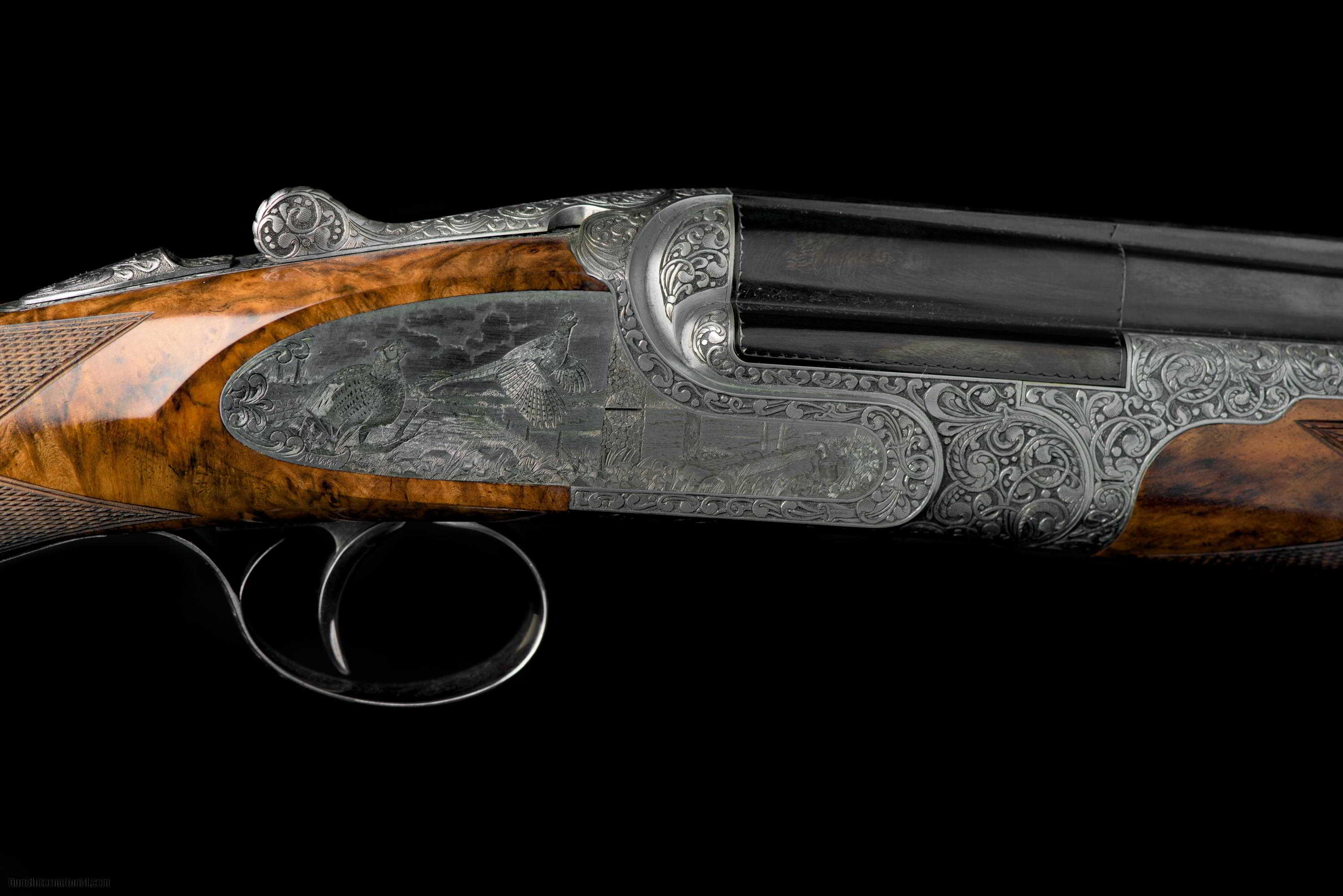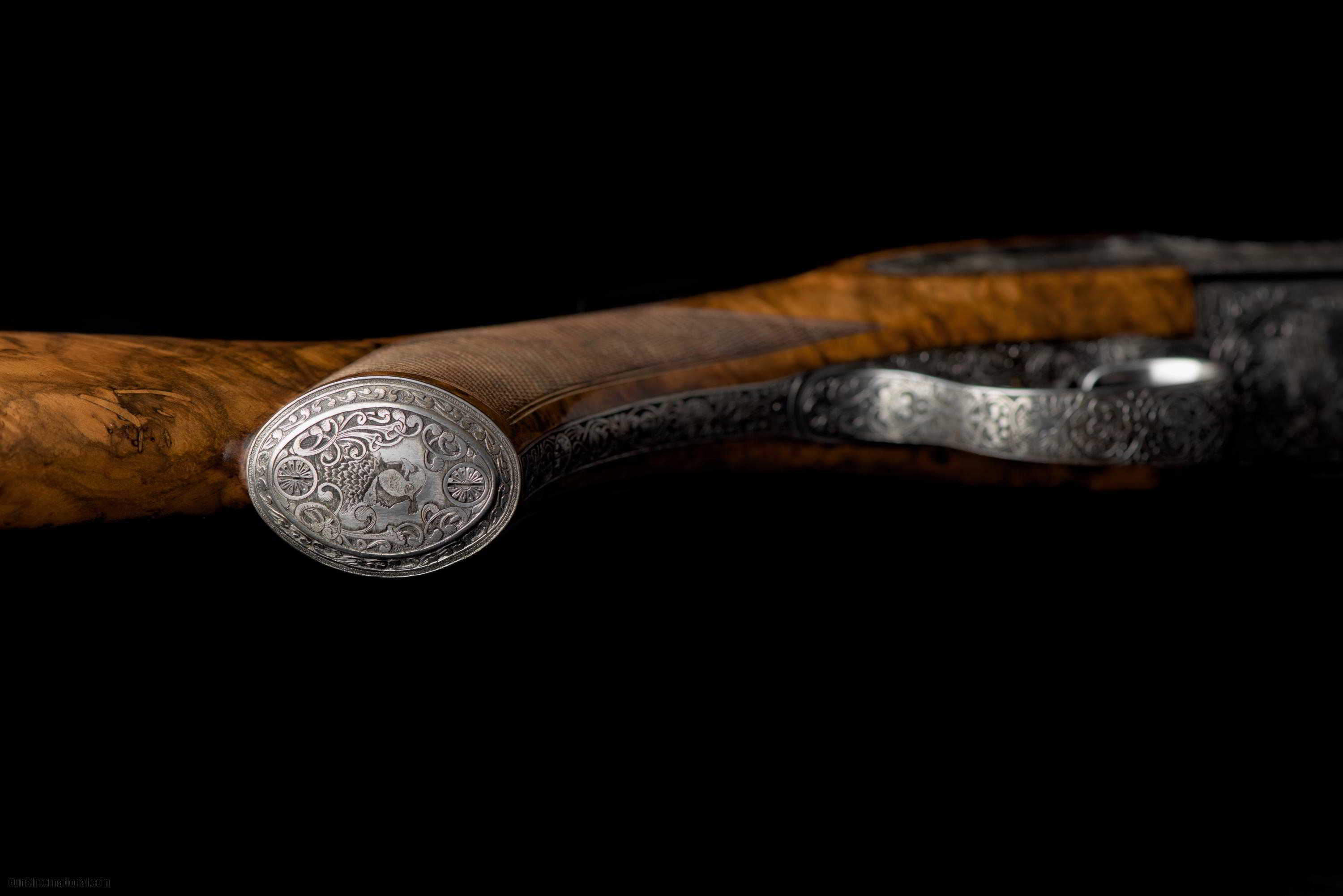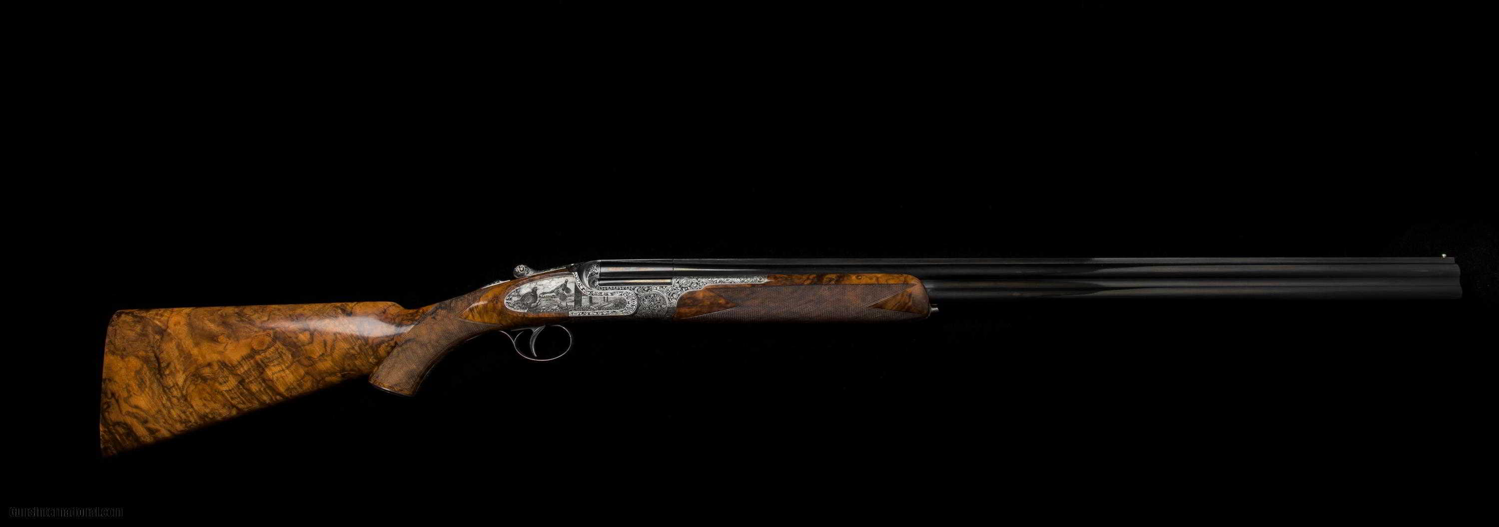 Description: Where does one begin? Gun remains, stunningly beautiful. Presented is one Abbiatico and Salvinelli, Leonardo, in 20 bore. The Leonardo is a pinless sidelock, with a Woodward style stock, Woodward Boss locking system, 30" chopperlump barrels, single trigger, auto-safety, and removable trigger group. The buttstock and forearm are of Exhibition Grade Turkish Walnut, which is absolutely magnificent, with perfecly executed diamond point checkering. Frame, forearm iron, trigger guard, grip cap, and top-lever are heavily engraved in deep, ornamental, shaded scroll, and sideplates masterfully engraved with rising pheasant over game fields, by Italian Master Engraver, Mariano Volpi. Upon inspection of the trigger guard, one will discover that it is engraved as well. This is a best quality gun, which handles as well as any 20 bore O/U on our planet. Class, defined. SOLD Manufacturer: Famars Model: Leonardo Serial Number: 008* Bore: 20 Ejectors: Yes Condition: Excellent Barrels: 30 Barrel Type: Chopperlump Triggers: Single Non-Selective Stock Dimensions: 14 3/4 x 1 1/2 x 2 1/4 Weight: 6 lbs. 10 oz. Chokes: Fixed Mod/Imod Engraving: Mariano Volpi |