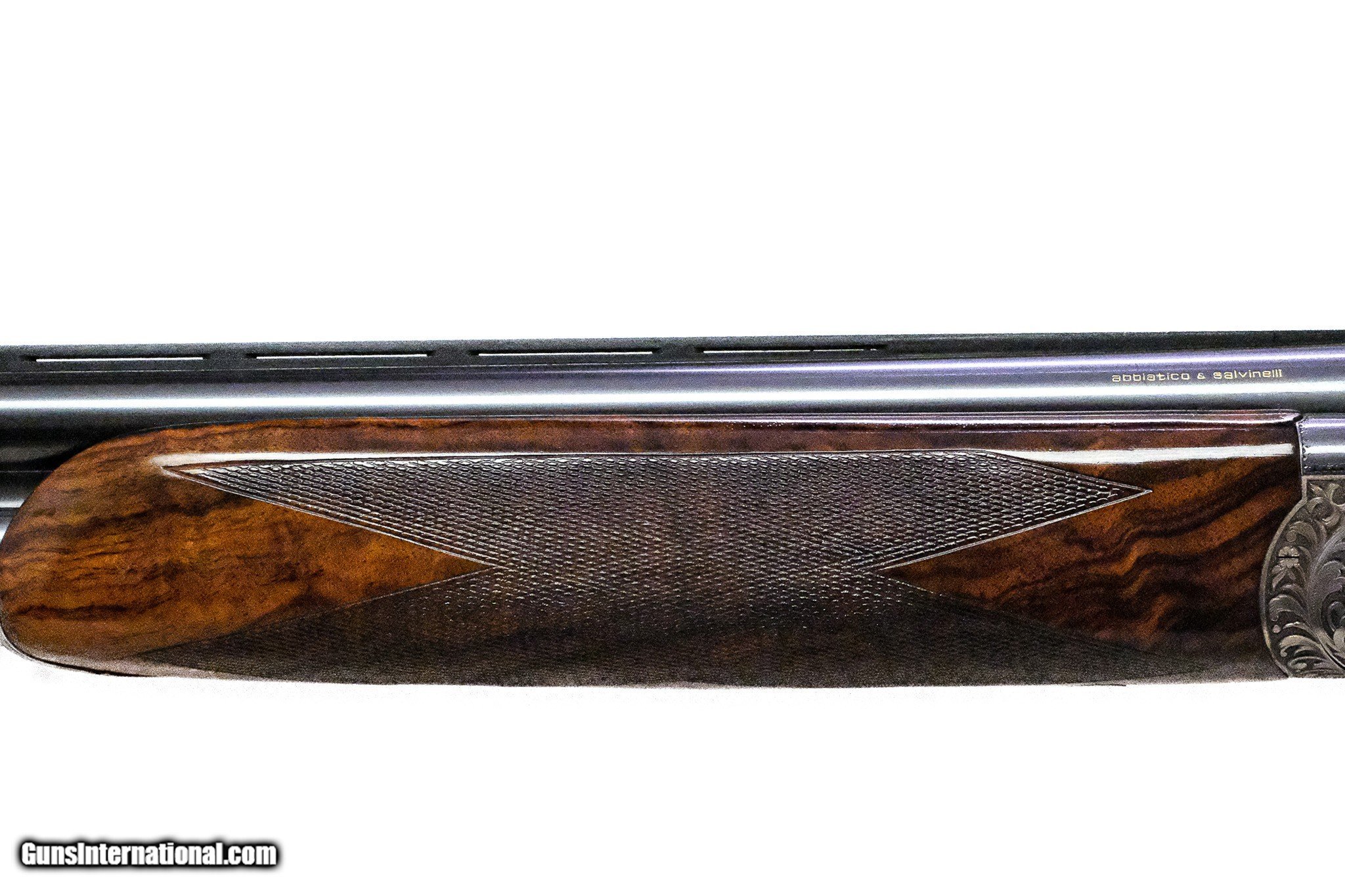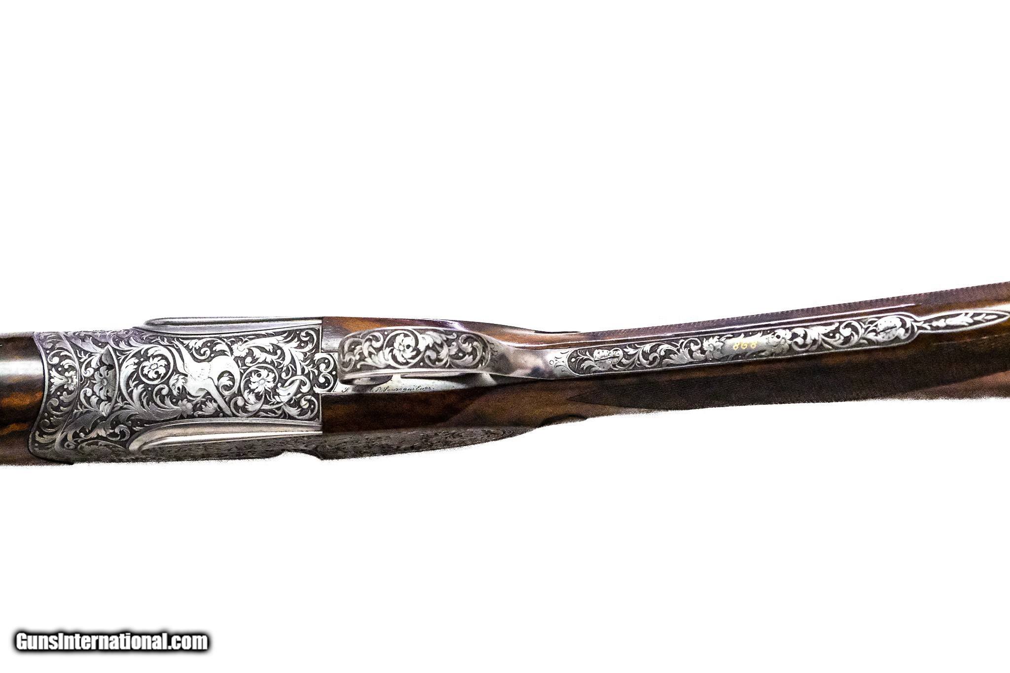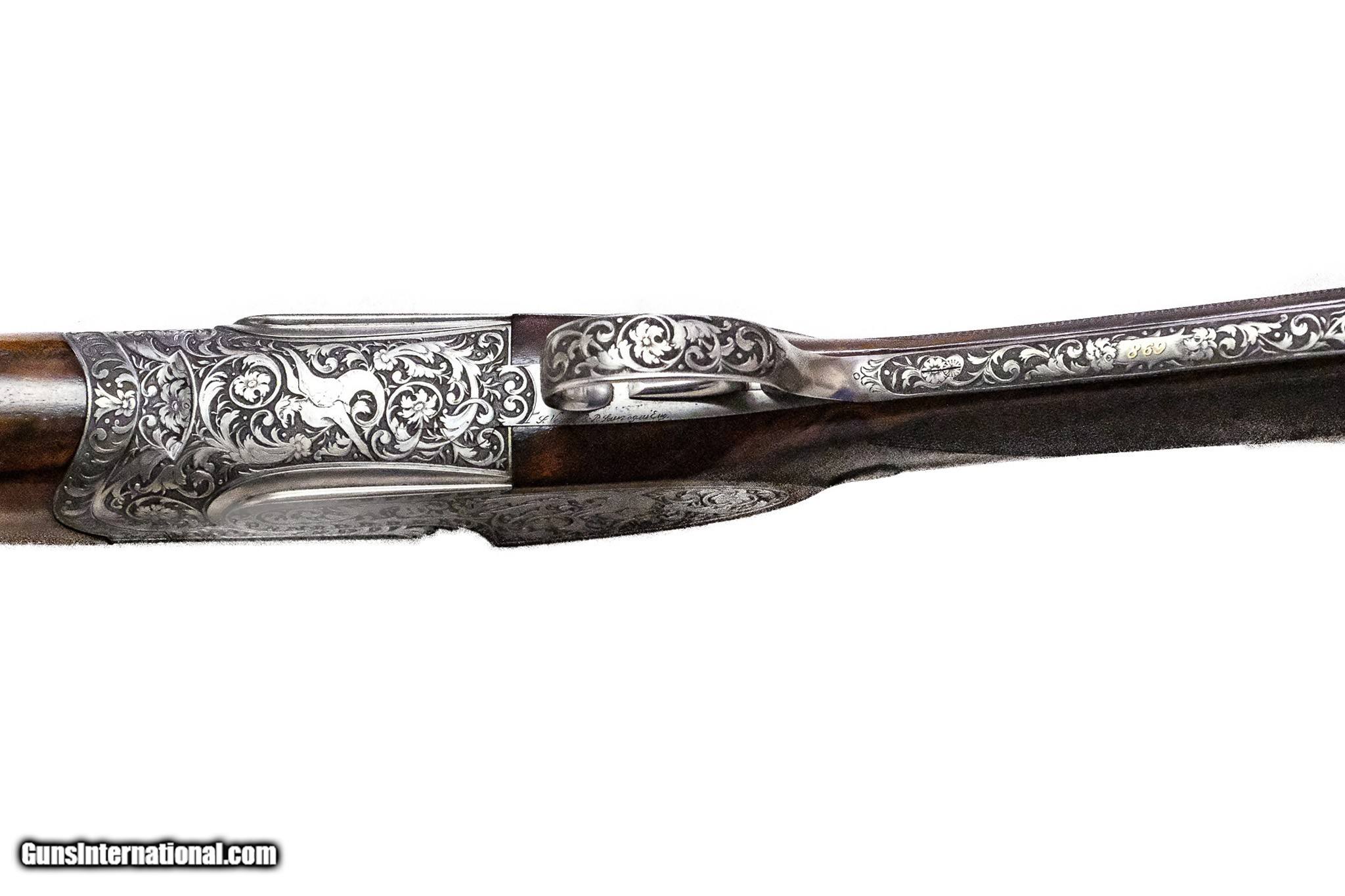 Description: Abbiatico & Salvinelli - Best O/U Sidelock, Matched Pair, 12ga. 27 ¼” IC/IM & 27 ¼” IM/IC. 27 ¼” barrels choked IC/IM on gun #1 and IM/IC on gun #2, beautiful Turkish walnut straight grip stocks, drop point stocks, slim hunting style forearms, full leather covered pads, single trigger, automatic ejectors, non-automatic safety, vent rib, gold ovals with initials “WGT”, the engraving features spectacular deep sculptured ornamental scroll with beautiful mythological scenes interwoven with the deep scroll, all executed by J. Veuzi & P. Lauzogui, 1988 production, gorgeous handmade guns, consecutive serial numbers, marked with gold 1 & 2, guns remains in excellent overall condition, cased in makers leather case, available for immediate delivery. Inv: 73933 - 73934 7 lbs. 4 oz. 14 ½” x 1 ½” x 2” $44,999.00 SOLD |