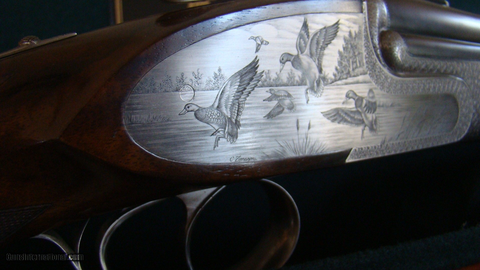 Description: Abbiatico & Salvinelli Jorema Royal DeLuxe over/under sidelock ejector. Lightweight 12 ga., 2-3/4" chamber, two sets of 27" demi-block barrels each complete with individual forends with gold numeral "I" and "II". Extraordinary example features detachable pinless locks with gamescenes by Tomasoni and the finest scroll by Dassa. The barrels with Boss-style engraved quarter ribs, barrel set "I" choked .008/.002, barrel set "II" choked .031/.019. The highly marbled straight hand stock measures 1-7/16" comb, 2-1/16" heel, from the articulated front trigger 14-3/8" over a checkered butt, manual safety. A remarkable low profile over/under weighing a mere 6 lbs., 10 oz. reminds one of a pre-war best game gun. Leather motor case with maker's label. SOLD |