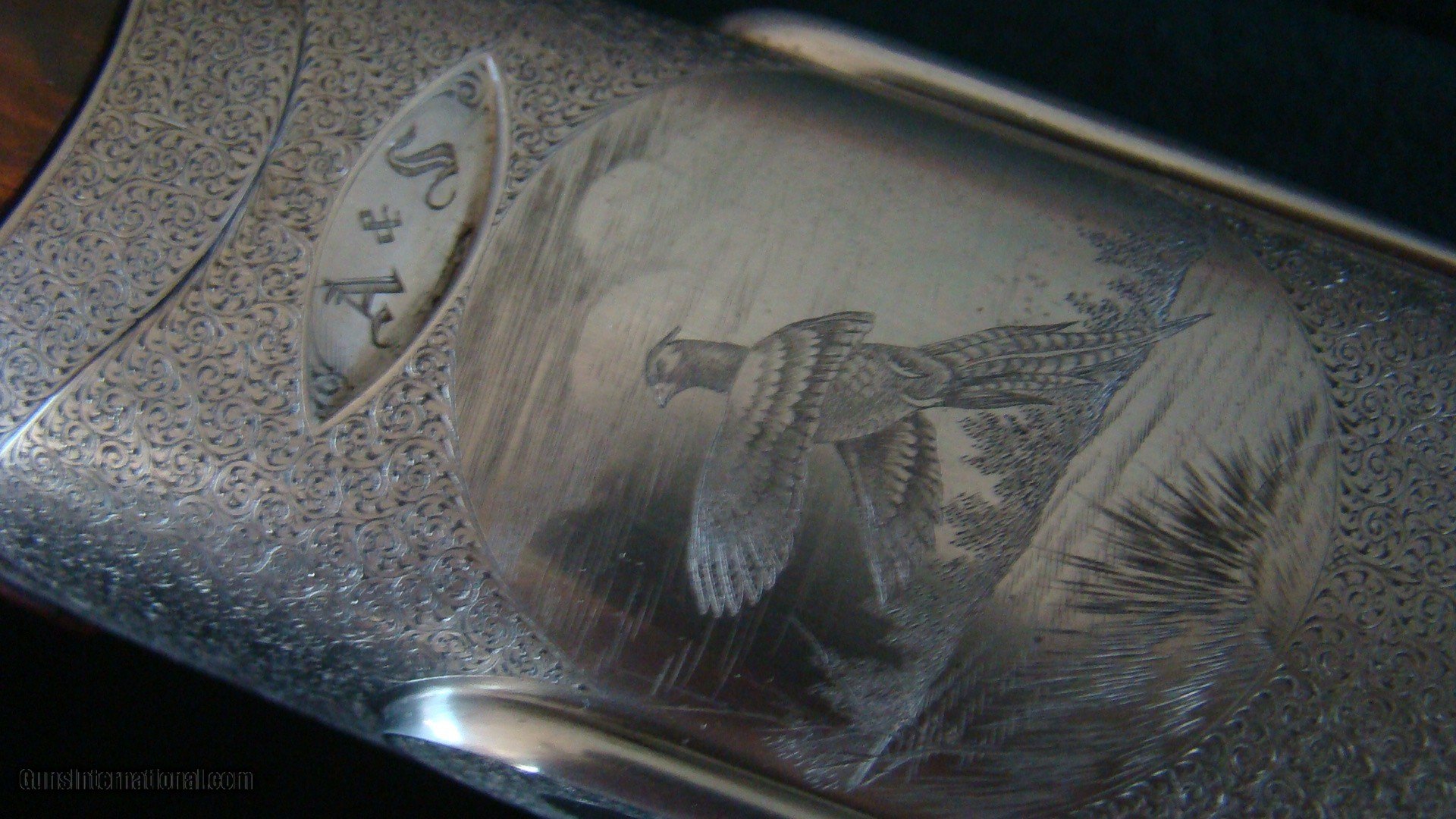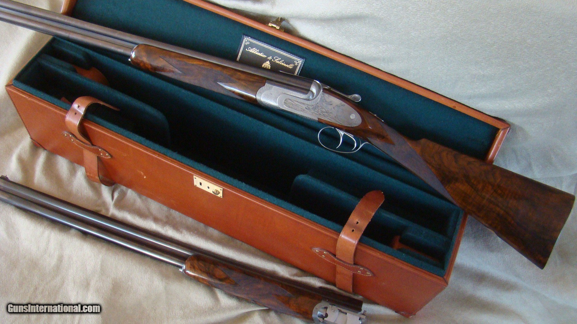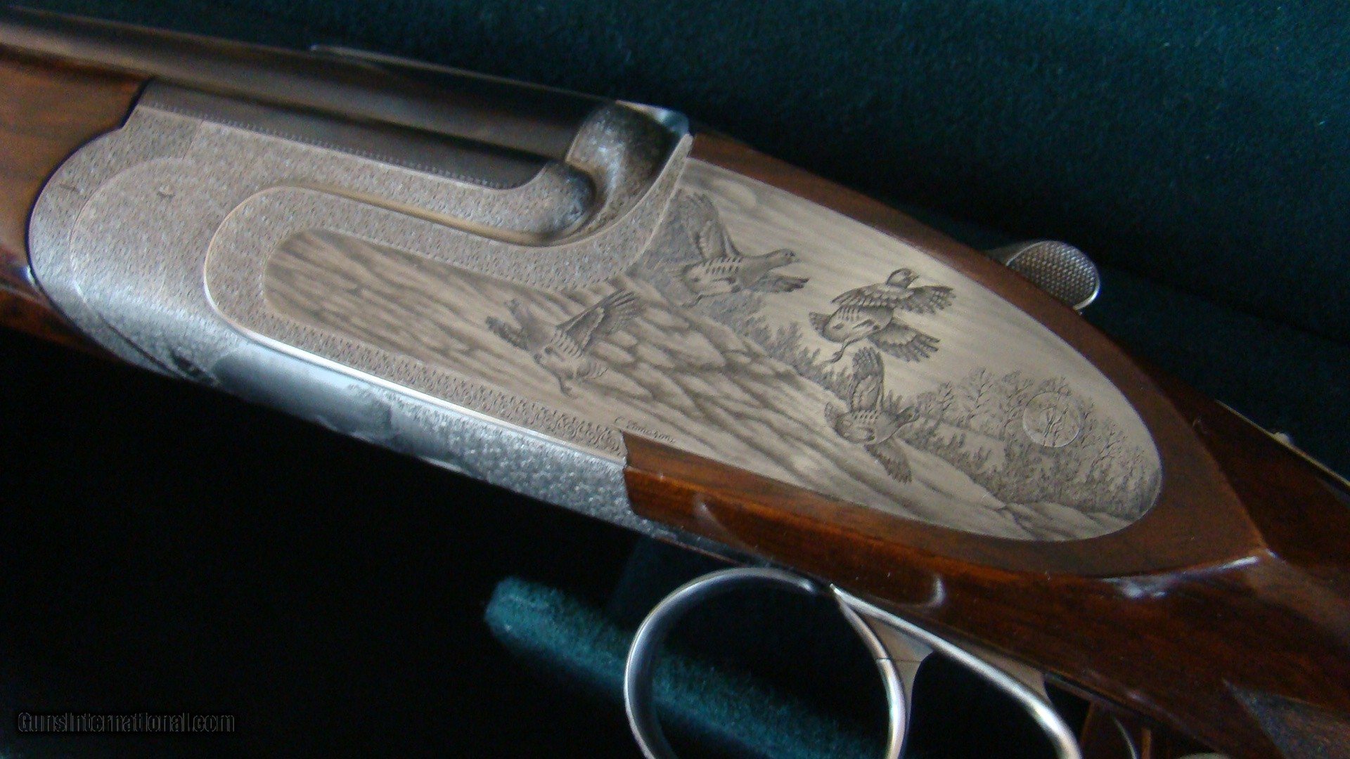Description: Abbiatico & Salvinelli Sovereign over/under sidelock ejector. Lightweight 12 ga., 2-3/4" chamber, two sets of 27" demi-block barrels each complete with individual forends with gold numeral "I" and "II". This extraordinary example features Fabbri-style torque-screw detachable pinless locks. Gamescenes engraved by Tomasoni and the finest scroll by Dassa. The barrels with Boss-style engraved quarter ribs, barrel set "I" choked .008/.002, barrel set "II" choked .031/.019. The highly marbled straight hand stock measures 1-7/16" comb, 2-1/16" heel, from the articulated front trigger 14-3/8" over a checkered butt, manual safety. A remarkable low profile over/under weighing a mere 6 lbs., 10 oz. reminds one of a pre-war best game gun. Leather motor case with maker's label. SOLD |