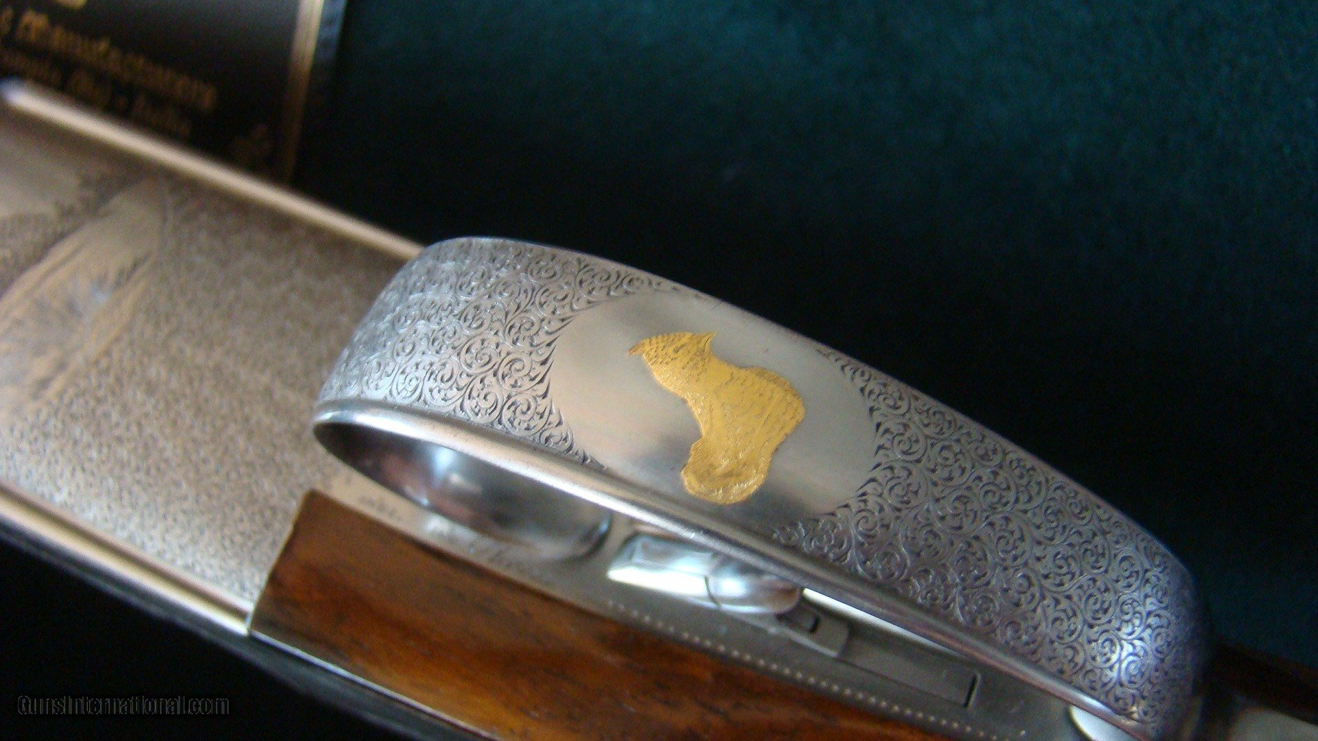 Description: Abbiatico & Salvinelli Sovereign over/under sidelock ejector. Lightweight 12 ga., 2-3/4" chamber, two sets of 27" demi-block barrels each complete with individual forends with gold numeral "I" and "II". This extraordinary example features Fabbri-style torque-screw detachable pinless locks. Gamescenes engraved by Tomasoni and the finest scroll by Dassa. The barrels with Boss-style engraved quarter ribs, barrel set "I" choked .008/.002, barrel set "II" choked .031/.019. The highly marbled straight hand stock measures 1-7/16" comb, 2-1/16" heel, from the articulated front trigger 14-3/8" over a checkered butt, manual safety. A remarkable low profile over/under weighing a mere 6 lbs., 10 oz. reminds one of a pre-war best game gun. Leather motor case with maker's label. SOLD |