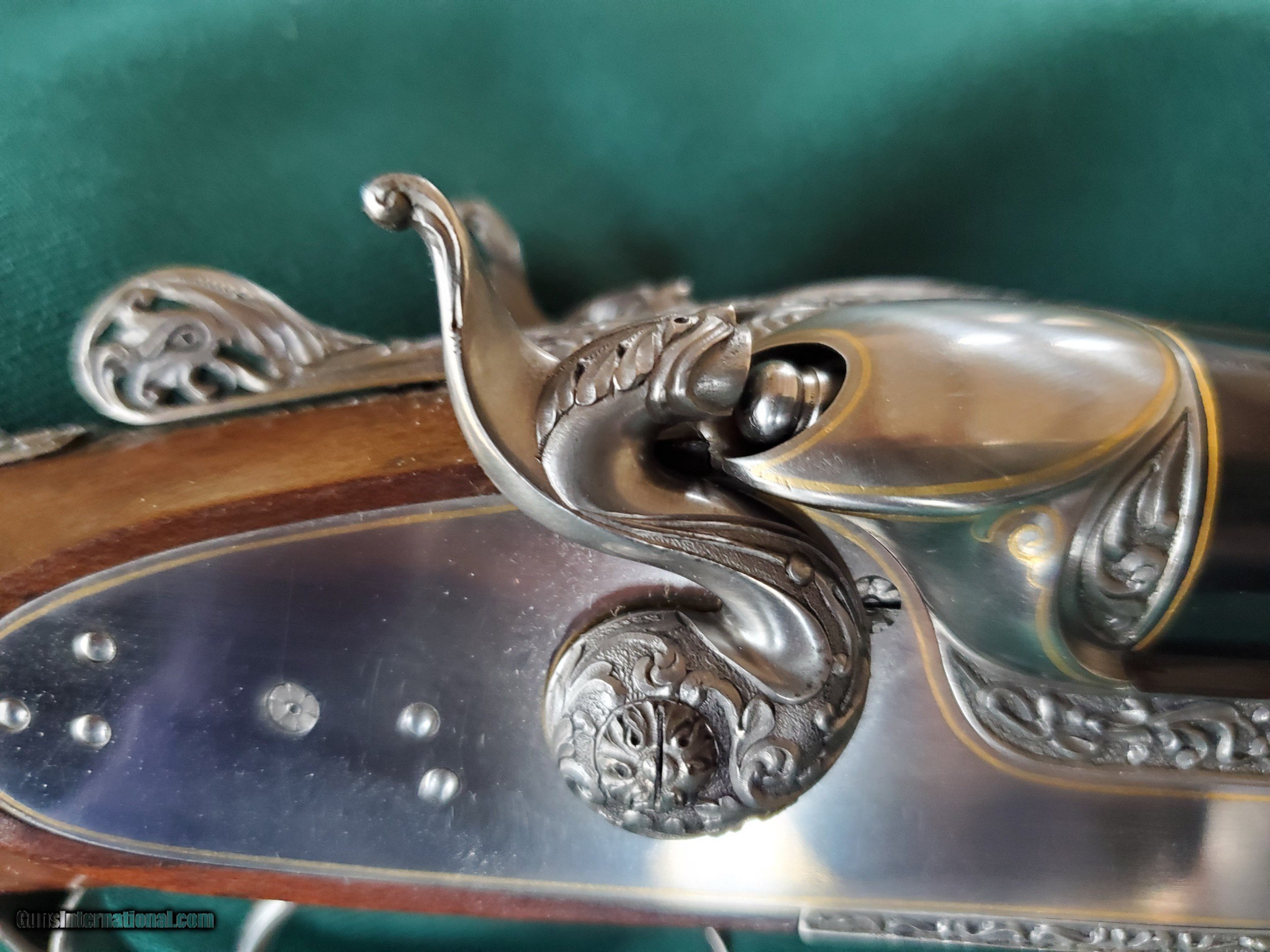 Description: PRICE REDUCTION!!!!!!!! Built in 1978, this single trigger, automatic ejector, hammer gun is truly a work of art. The gun has 27 1/2" barrels with narrow slightly raised tapered rib with small brass front bead, choked 4/10-9/10. The barrels have small gold bands at breach ends and are engraved on the top of the left tube "Abbiattico & Salvinelli". Barrel flats with 1978 proof date, makers names on lug, and marked with A & S proof. Beaded action is superbly polished with gold line work throughout. The hammers are fabulously sculpted and engraved in a deep relief floral pattern. The engraving extends from the front of the frame and bolsters to the trigger plate which is engraved with a royal mythical face and very deep relief. Bottom of the action engraved with gold "Castore" in crown pattern surrounding it. The trigger guard tang is beaded on the right side and relief engraved with scroll and mythical face. The long tang trigger guard shows the same fantastically executed deep relief scroll pattern. The top lever shows incredible piercing of a mythical bird with super relief engraving that extends to the tang and top safety. Ahead of the safety is a gold inlayed "S". All metal parts are exquisitely, finely polished. Engravers signature "G. Pedretti, Inc." found in front of the trigger guard bow. Straight grip butt stock with tear drops behind locks is checkered in two point pattern through the wrist and terminates with a finely checkered butt. The stock measures 14 1/2" from the trigger to the end of the butt. Semi-beavertail forend is checkered in three point pattern with gold makers crest at center and has an Anson type push button release. Forend tip shows frame with gold line work and carving near tip. Gun is housed in a light brown A & S labeled case with red velvet interior. Within the case is the original order card with the gun from A & S describing it as is. Also included 28 ga. snap caps, oil bottle and cleaning rod. Condition of the gun: new - unfired. Case is in very good condition with some water stains on the outside and straps showing some wear. This is a very classy gun with incredible chisled engraving by one of the world's best and would be a hoot to use in the field! PRICE REDUCTION BY $2,0000..............NOW $22,500!!!!!!! plus shipping & insurance HOLIDAY PRICE REDUCTION BY $4,000...............NOW $18,500!!!!!!!!!!!!! SOLD Shotgun Gauge: 28 Gauge Manufacturer: Famars - Abbiatico & Salvineli Model: Castore Barrel Length: 27 1/2 Bore: 28 Chambers: 2 3/4 Ejectors: auto Condition: New Metal Condition: New Wood Condition: New Bore Condition: New Stock: straight Stock Dimensions: 14 1/2 Stock Comb: 1 1/2 Stock Heel: 2 1/4 Weight: 5 1/2 lbs Manufacture Date: 1978 Chokes: 4/10-9/10 Engraving: Carved - Gold Inlay Case: Original Leather |