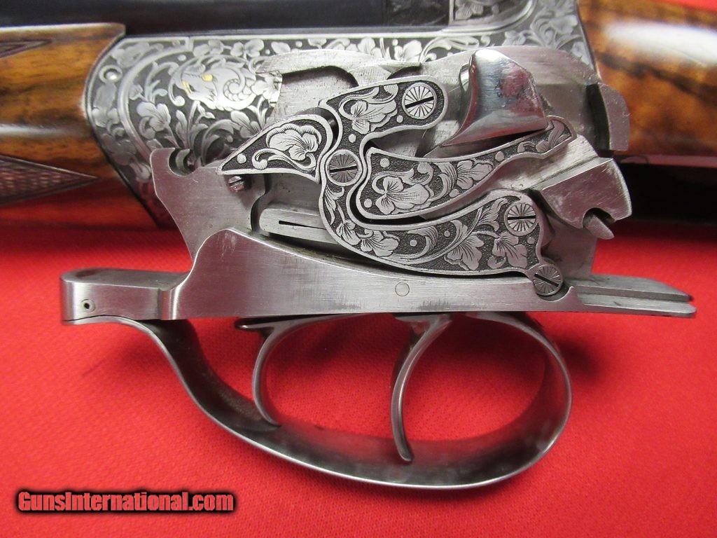 Description: Round action frame with removable trigger -- This is a stunning firearm to say the least. Full coverage deep cut engraving featuring gargoyles and scroll. Highly figured exhibition grade stock and forend. Factory luggage case. This gun is priced at a fraction of replacement cost. Please call for details. SOLD |