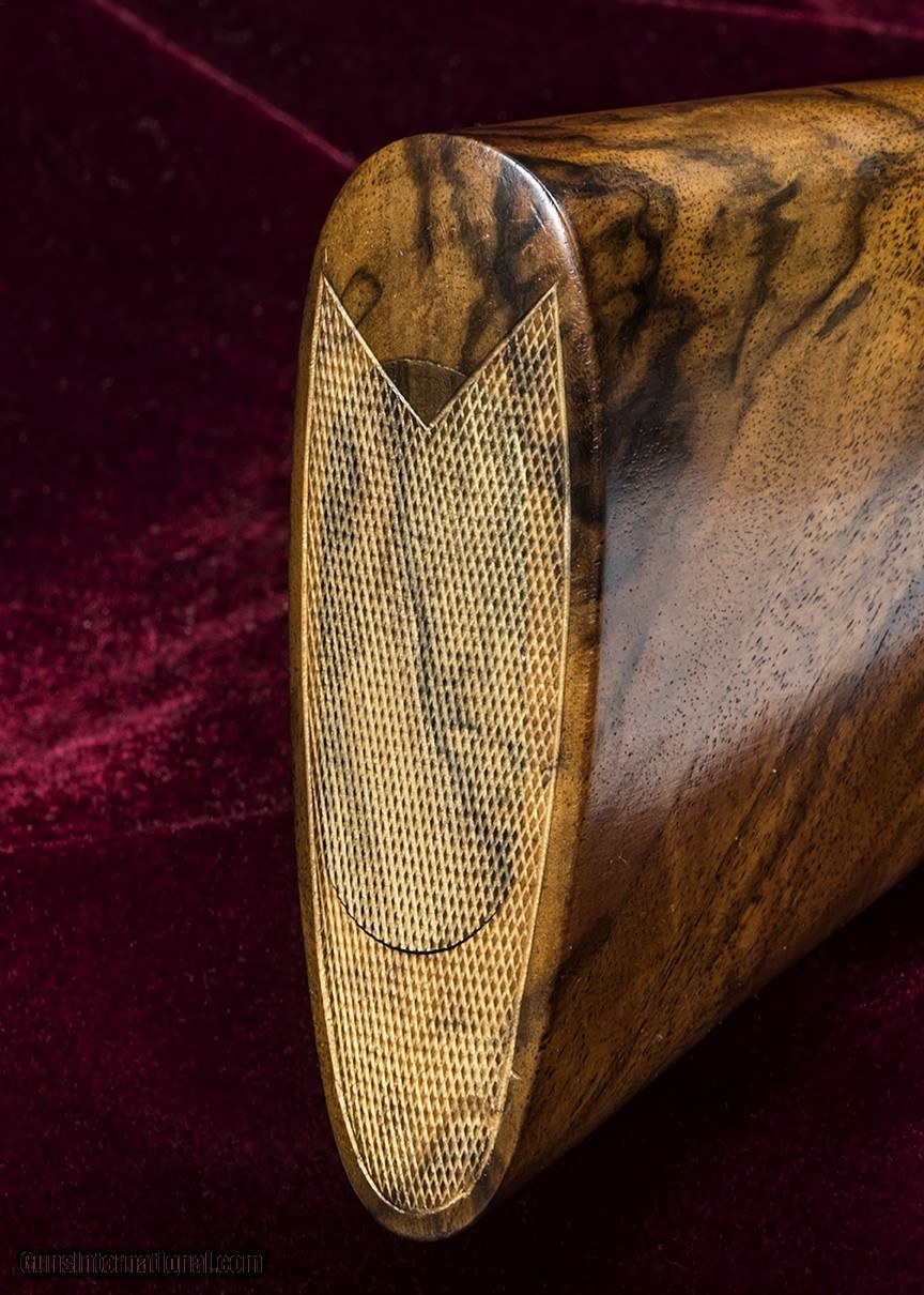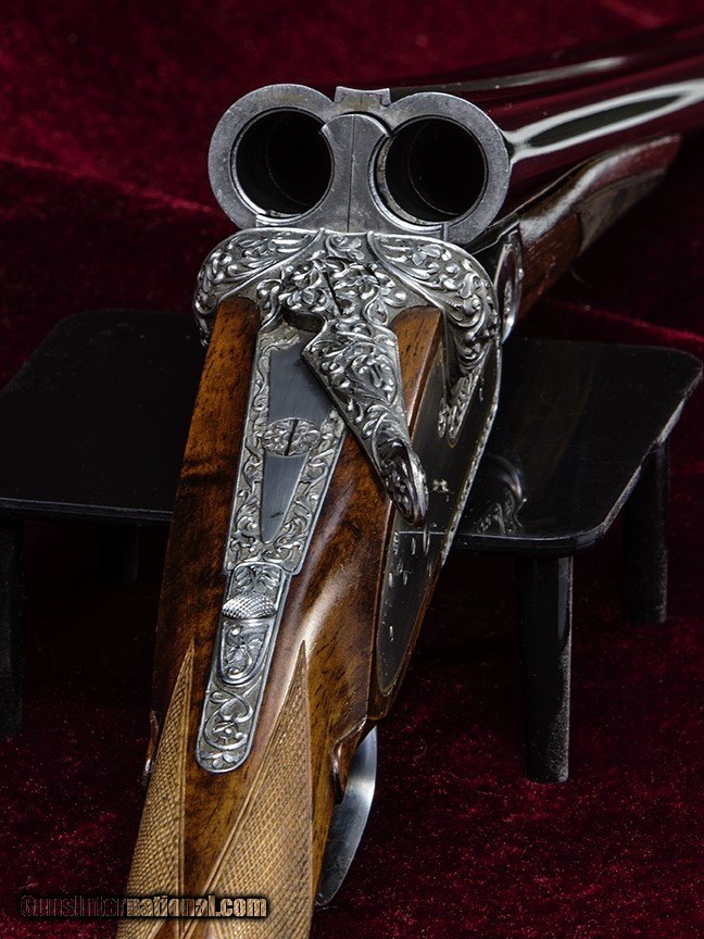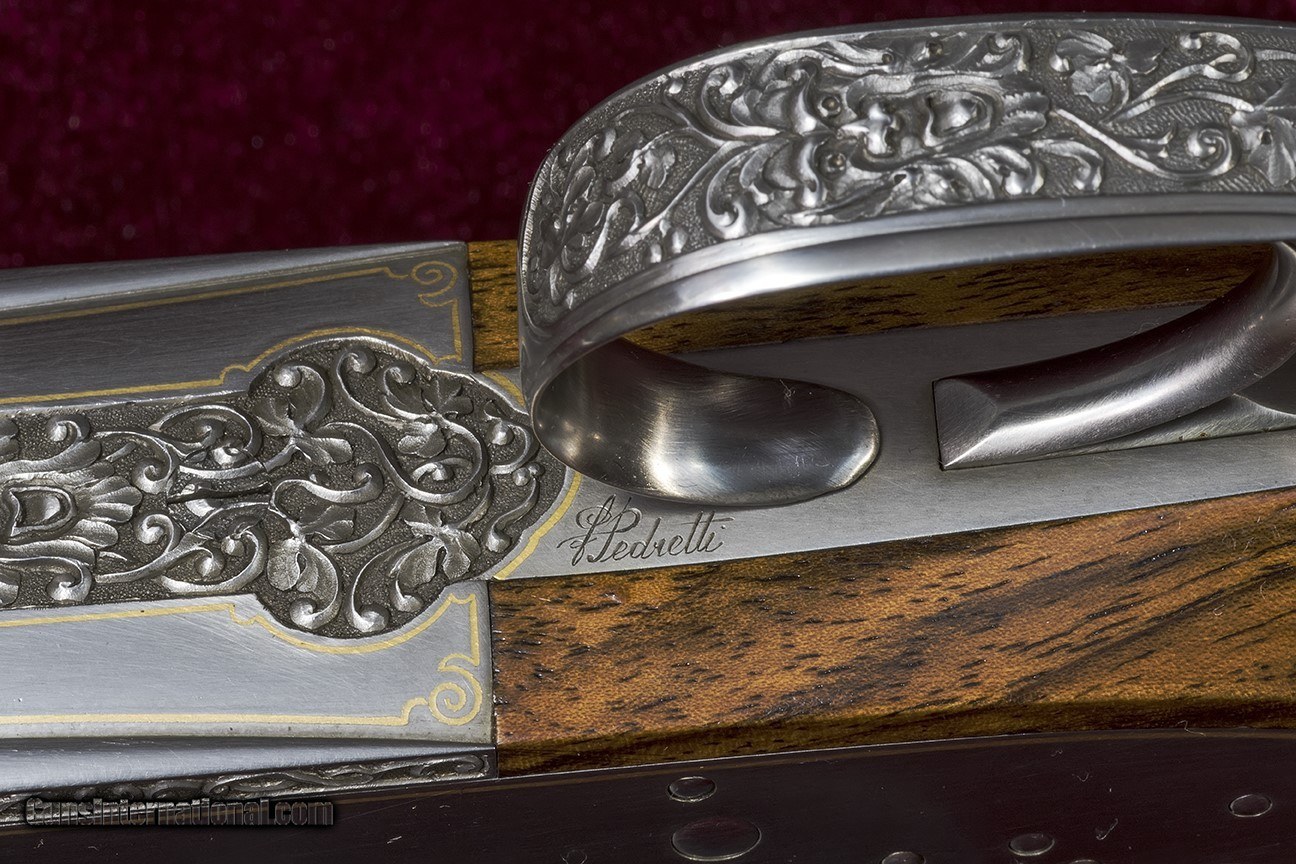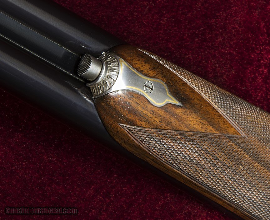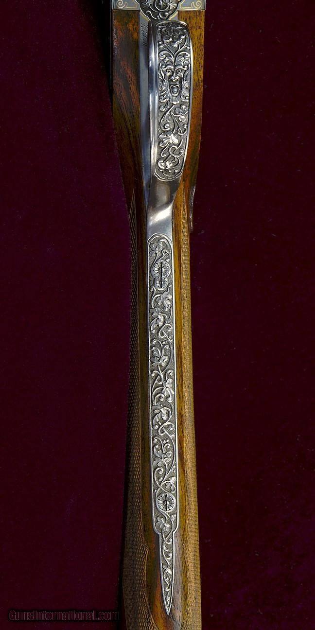 Description: SN: 251 (1979). 28 Ga. Best Quality light game gun made for ubiquitous Pittsburgh Mogul Joe Bojalad, features 27” chopper lump barrels, raised smooth concave game rib and single sighting bead. Barrel flats are stamped with 1979 Italian nitro proofs, serial number and A & S principals' marks on lump. Bottom of left tube stamped "Joe Bojalad-Pittsburgh". Coin finished sidelock action features ejectors, disk set strikers, manual safety, with a swept single non-selective trigger and rolled guard bow. Action is engraved along sides of frame onto top fence and continuing to top strap and lever with classic Italian high relief intertwined acanthus vine and ribbons with dark shaded background perfectly executed by Italian maestro Giancarlo Pedretti (1947-2017) and signed on left trigger plate. Remainder of action body and lockplates are painstakingly hand-polished to a flawless smooth surface with gold wire inlaid borders presenting a work of understated elegance. Top lever, hinge pin pivots and appended metal are relief engraved to match. Maker's name is presented inside a flowing gold riband on floorplate. Classical deep relief scrollwork continues the trigger plate and bow incorporating two stylized Grotesque (Macherone) masks and extending down the length of the tang. Highly figured Circassian walnut stock has straight grip with finely checkered delicate diamond profiled wrist section running well into the flute area and terminating in a checkered butt. Delicate matching checkered semi-beavertail forend has push rod release and inlaid gold A & S shield on central diamond. Accompanied by Maker's leather trunk case and accouterments. Wt: 4 lbs 15 oz; Bore:.563 (Both), Choke: R-.010, L-.028; Stock: 14-3/8" x 1-3/8" x 2-1/4", cast off 1/8". CONDITION: Excellent. Gun retains virtually all of its fine factory wood and metal finishes. Wood is sound with only the slightest of handling marks on the stock and forearm. Crisp checkering. Action body polish is pristine. Some very minor marks in barrel bluing. Standing breech and barrel flats show very light usage. Crisp mechanics, Bright bores. Case exterior shows some discoloration and scuffs from storage.Interior is fine, as are accoutrements. PROVENANCE: Ex Joe Bojalad Collection. Italian craftmanship at the very highest levels representing the best of A&S during their apogee of gunmaking. Irreplaceable at the price ! SOLD |