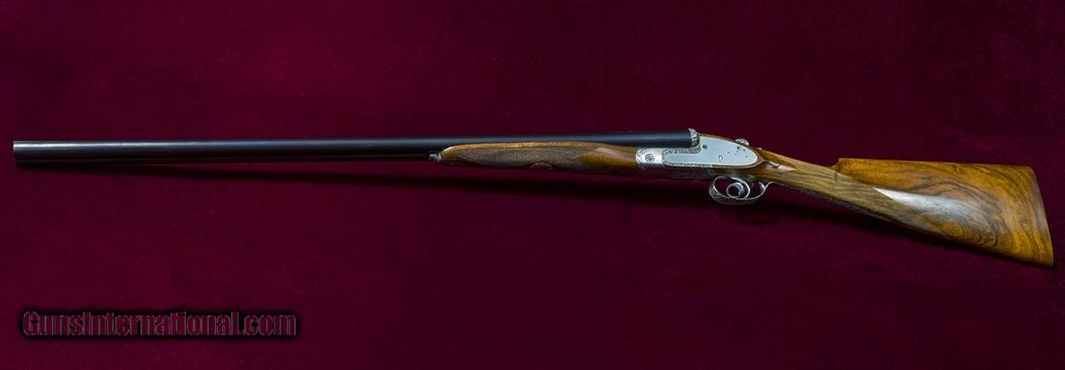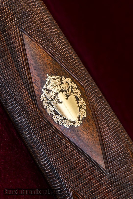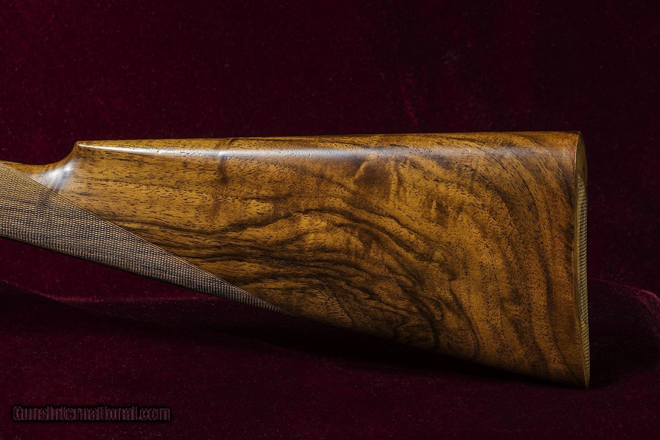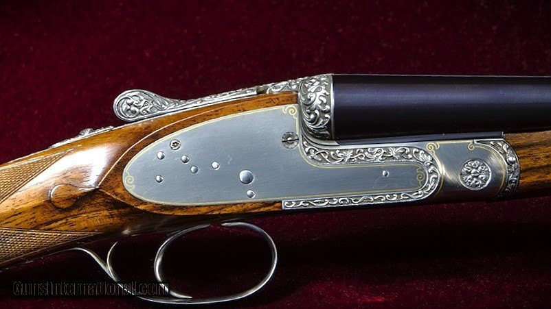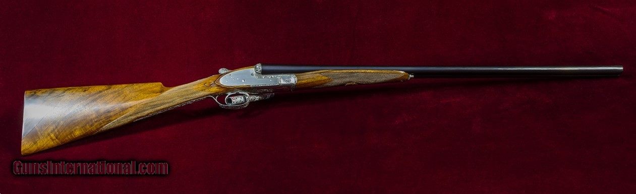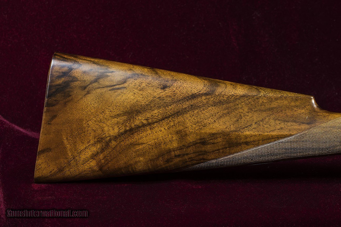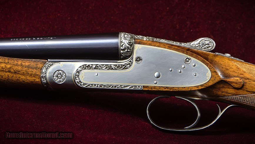 Description: SN: 251 (1979). 28 Ga. Best Quality light game gun made for ubiquitous Pittsburgh Mogul Joe Bojalad, features 27” chopper lump barrels, raised smooth concave game rib and single sighting bead. Barrel flats are stamped with 1979 Italian nitro proofs, serial number and A & S principals' marks on lump. Bottom of left tube stamped "Joe Bojalad-Pittsburgh". Coin finished sidelock action features ejectors, disk set strikers, manual safety, with a swept single non-selective trigger and rolled guard bow. Action is engraved along sides of frame onto top fence and continuing to top strap and lever with classic Italian high relief intertwined acanthus vine and ribbons with dark shaded background perfectly executed by Italian maestro Giancarlo Pedretti (1947-2017) and signed on left trigger plate. Remainder of action body and lockplates are painstakingly hand-polished to a flawless smooth surface with gold wire inlaid borders presenting a work of understated elegance. Top lever, hinge pin pivots and appended metal are relief engraved to match. Maker's name is presented inside a flowing gold riband on floorplate. Classical deep relief scrollwork continues the trigger plate and bow incorporating two stylized Grotesque (Macherone) masks and extending down the length of the tang. Highly figured Circassian walnut stock has straight grip with finely checkered delicate diamond profiled wrist section running well into the flute area and terminating in a checkered butt. Delicate matching checkered semi-beavertail forend has push rod release and inlaid gold A & S shield on central diamond. Accompanied by Maker's leather trunk case and accouterments. Wt: 4 lbs 15 oz; Bore:.563 (Both), Choke: R-.010, L-.028; Stock: 14-3/8" x 1-3/8" x 2-1/4", cast off 1/8". CONDITION: Excellent. Gun retains virtually all of its fine factory wood and metal finishes. Wood is sound with only the slightest of handling marks on the stock and forearm. Crisp checkering. Action body polish is pristine. Some very minor marks in barrel bluing. Standing breech and barrel flats show very light usage. Crisp mechanics, Bright bores. Case exterior shows some discoloration and scuffs from storage.Interior is fine, as are accoutrements. PROVENANCE: Ex Joe Bojalad Collection. Italian craftmanship at the very highest levels representing the best of A&S during their apogee of gunmaking. Irreplaceable at the price ! SOLD |