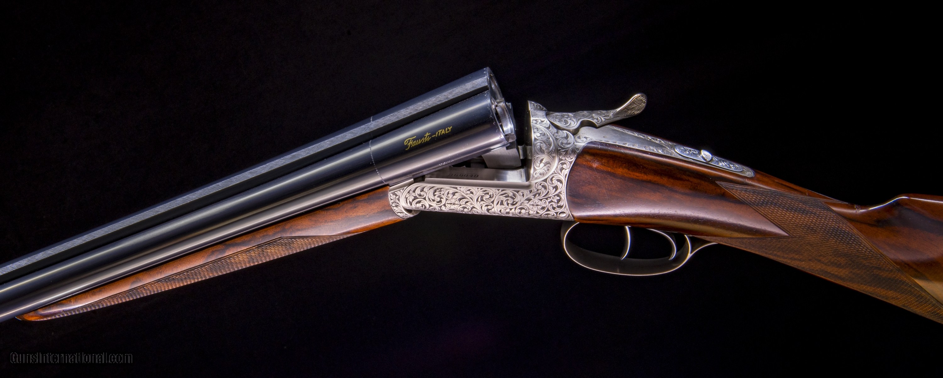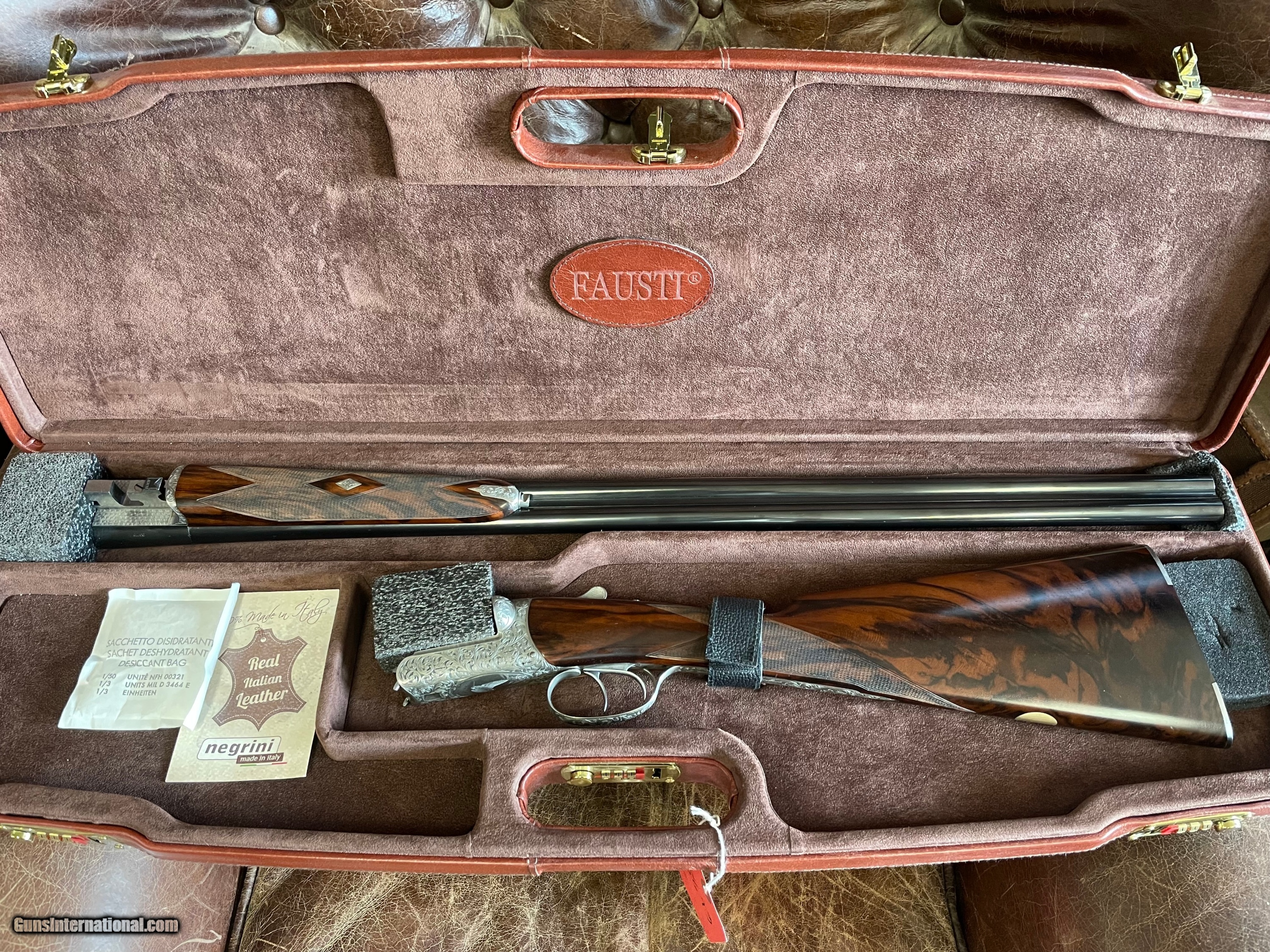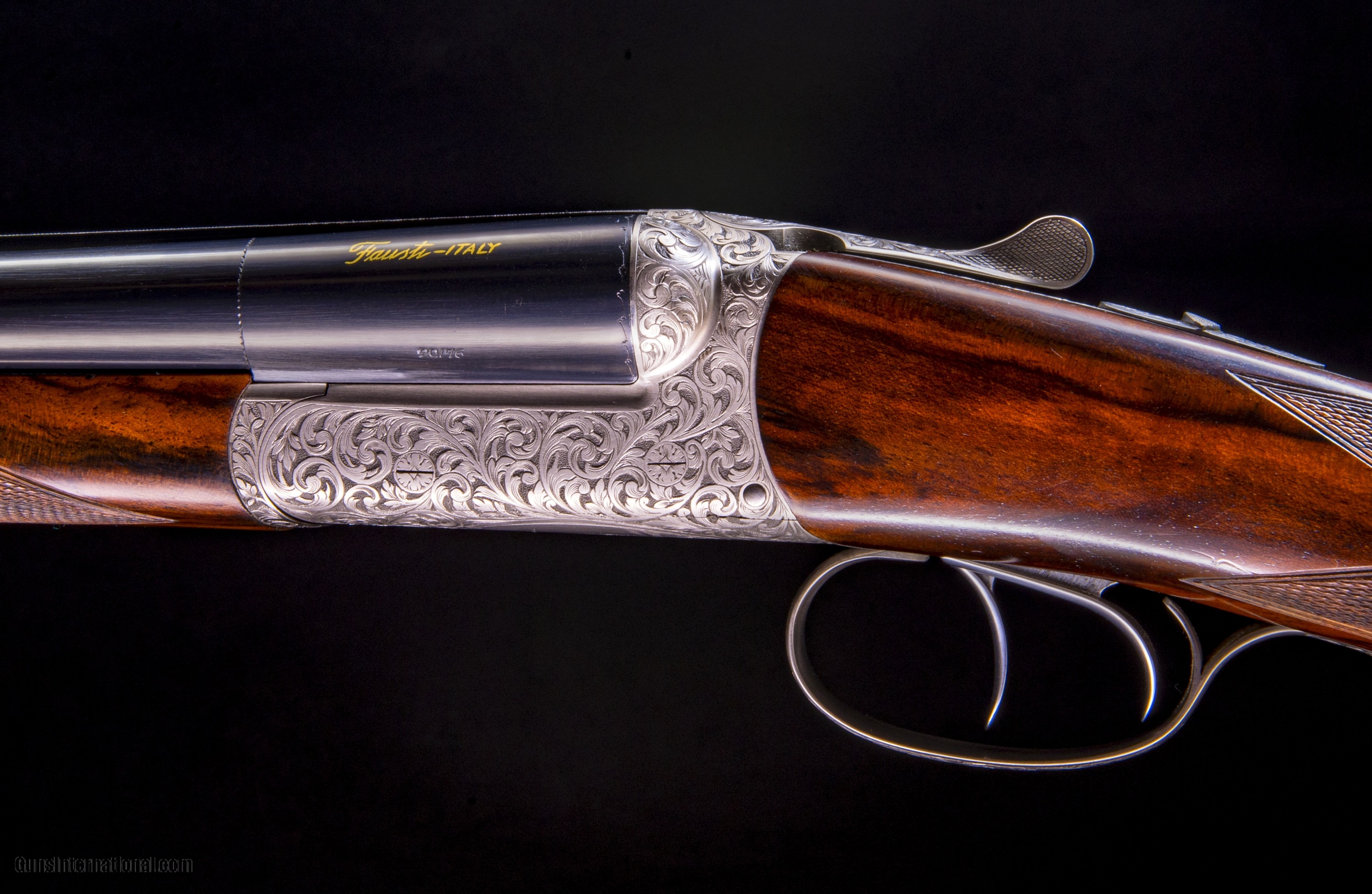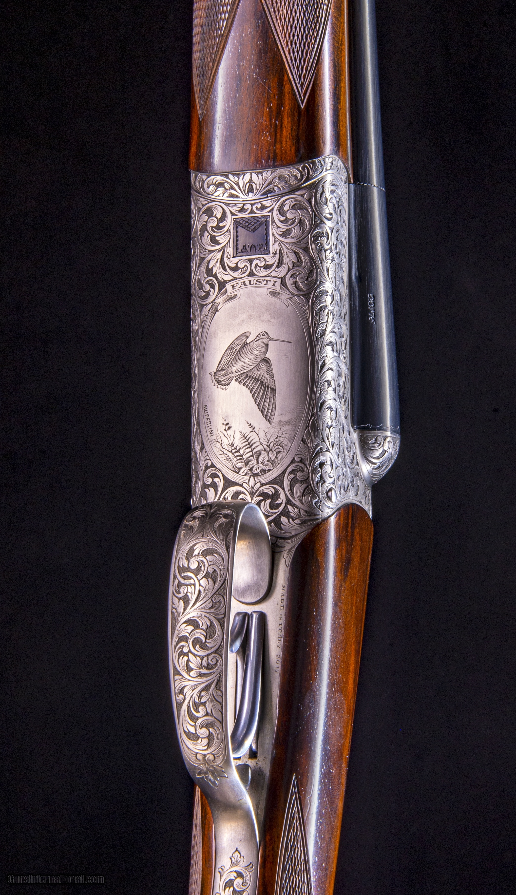 Description: Boxlocks - And excellent almost-new Fausti 20 bore made in 2017. Beautiful engraving featuring a woodcock in flight on the underside, signed by Muffolini The highly figured stock is capped with finely engraved steel toe and heel plates. *I met the three Fausti daughters at a Vintager event at Orvis Sandanona one year and found them, while obviously beautiful, thoughtful and extremely knowledgeable in the gun trade.