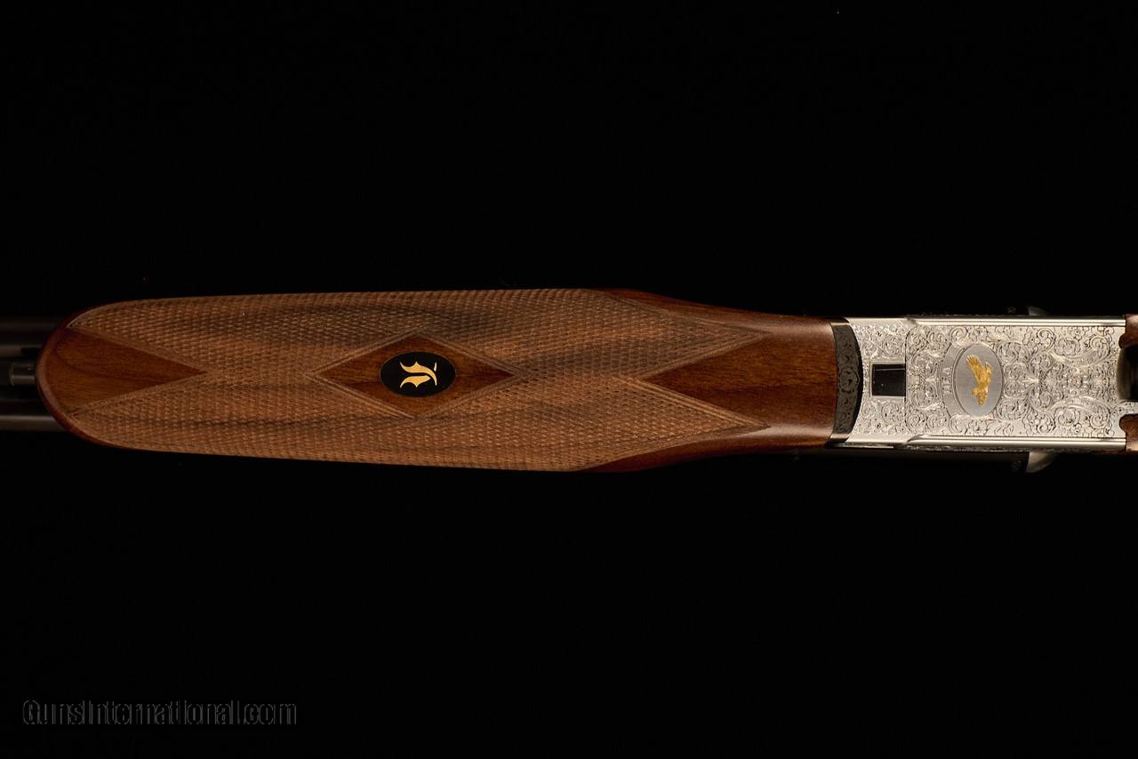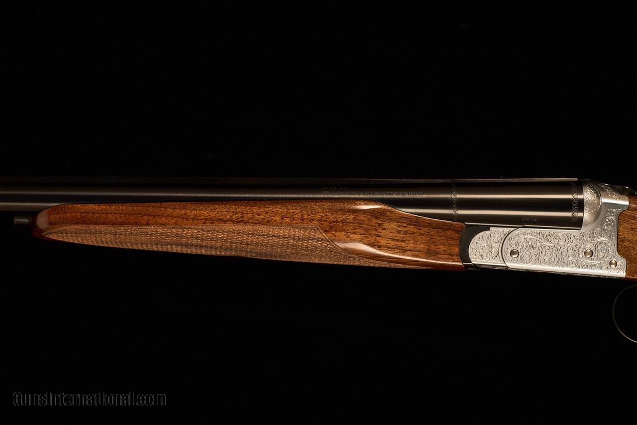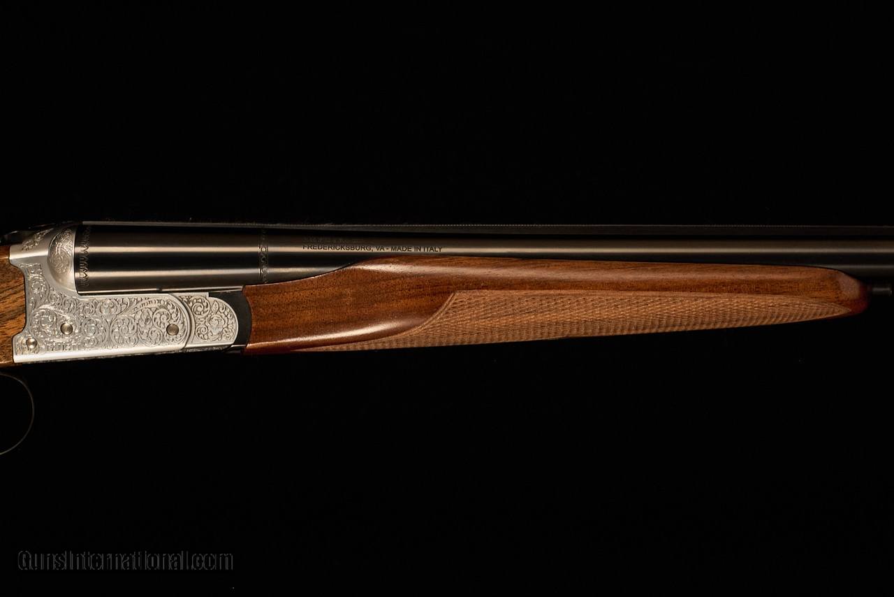 Fausti DEA in 28ga. Barrels are 28" with screw-in chokes. Rib is flat (non-swamped) with machine texturing for glare reduction. Front bead is brass. Action features a nickeled finish over medium scroll engraving with 95% coverage. Trigger is mechanical and non-selective. Trigger guard is blued with gold Fausti logo on long tang. Stock and forearm are of English/Turkish walnut with straight grain and moderate figure. Wood finish is semi-gloss oil. Checkering is actually hand-cut. Recoil pad is thin rubber and perfectly fit. Forearm latch is the Anson rod design which protrudes from the front of the forearm wood, thus eliminating possible snags on field gloves. Forearm is semi-beavertail which keeps the hand free of hot barrels, while maintaining classical styling.