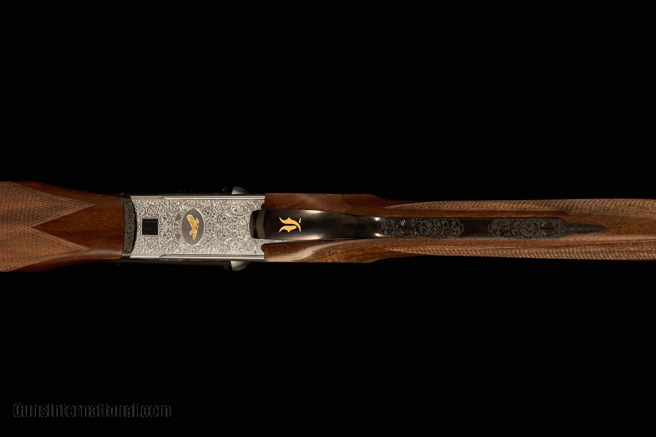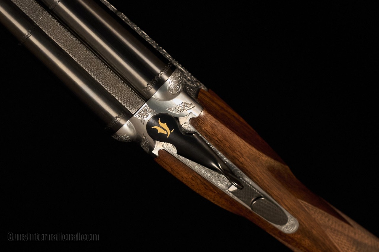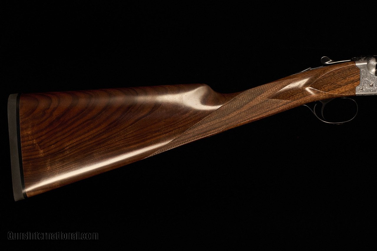 Fausti DEA in 28ga. Barrels are 28" with screw-in chokes. Rib is flat (non-swamped) with machine texturing for glare reduction. Front bead is brass. Action features a nickeled finish over medium scroll engraving with 95% coverage. Trigger is mechanical and non-selective. Trigger guard is blued with gold Fausti logo on long tang. Stock and forearm are of English/Turkish walnut with straight grain and moderate figure. Wood finish is semi-gloss oil. Checkering is actually hand-cut. Recoil pad is thin rubber and perfectly fit. Forearm latch is the Anson rod design which protrudes from the front of the forearm wood, thus eliminating possible snags on field gloves. Forearm is semi-beavertail which keeps the hand free of hot barrels, while maintaining classical styling.