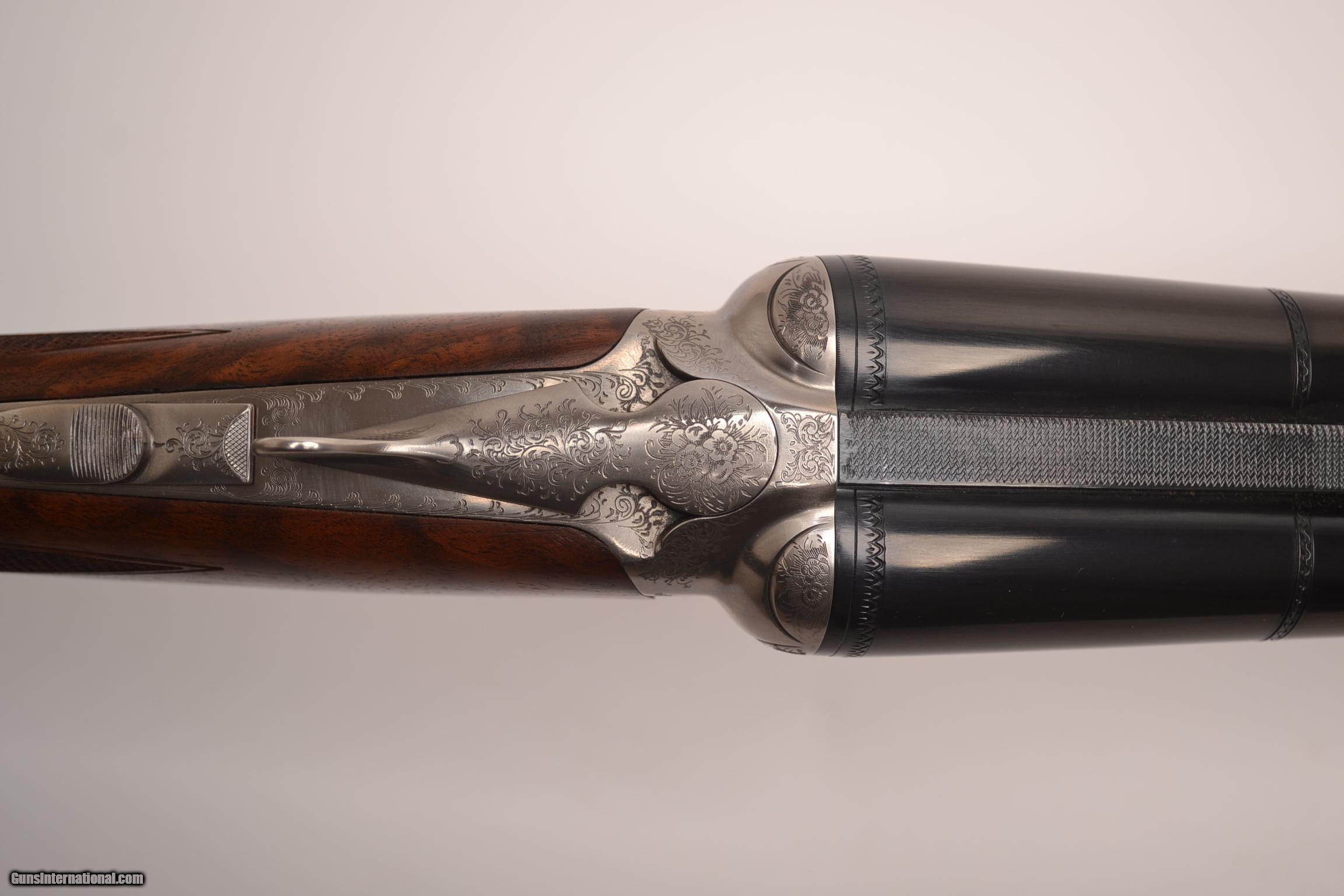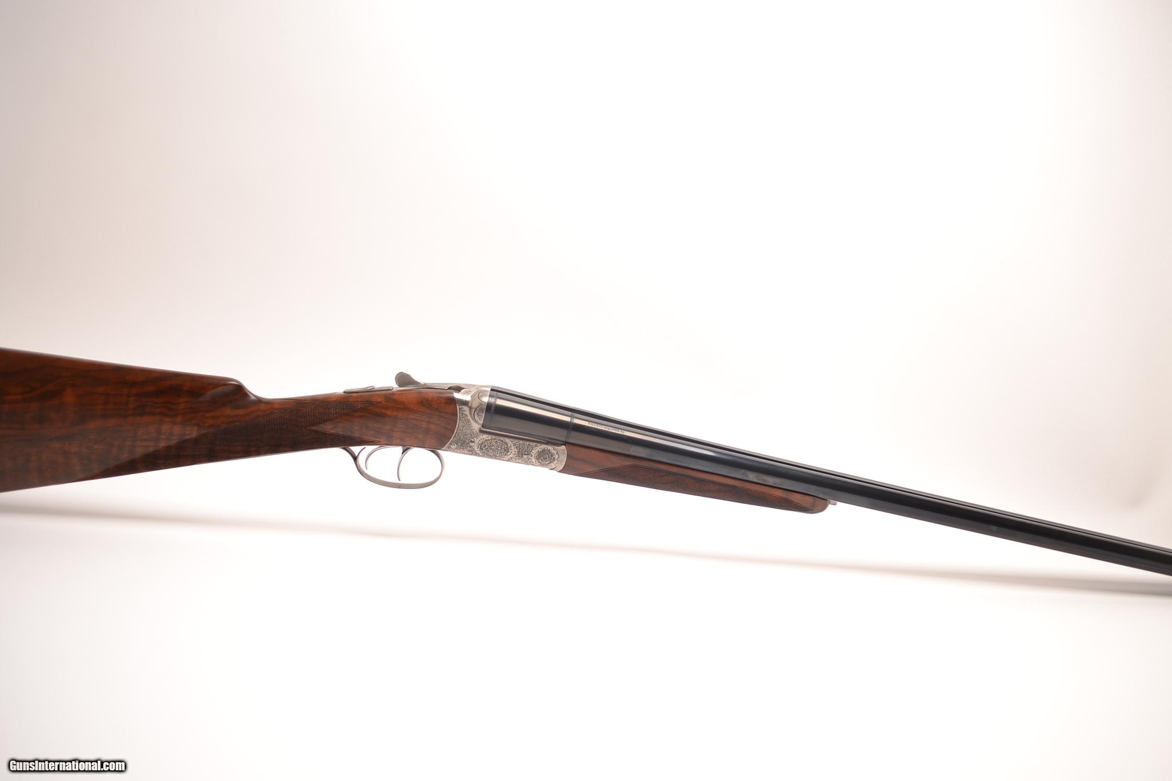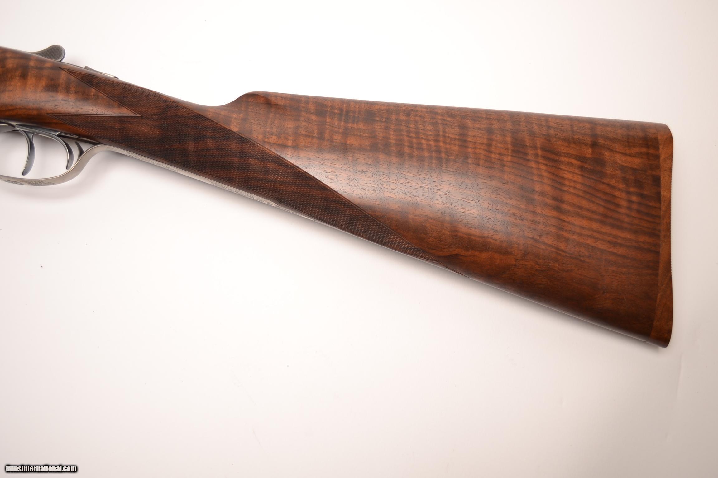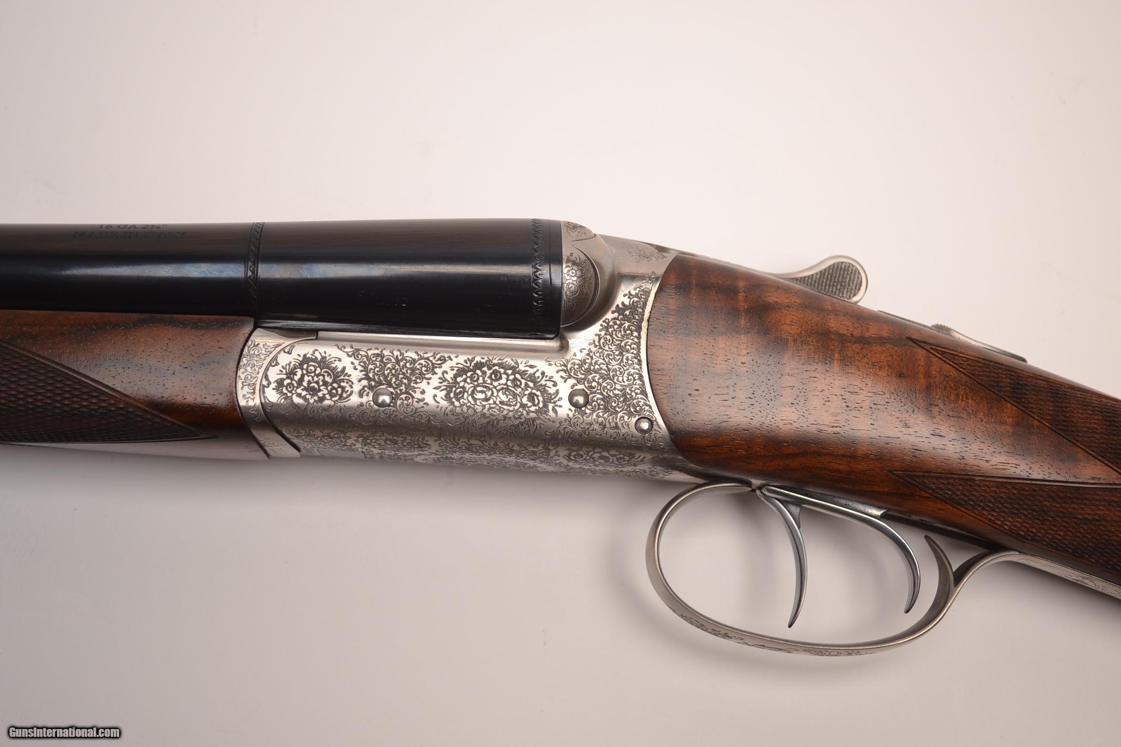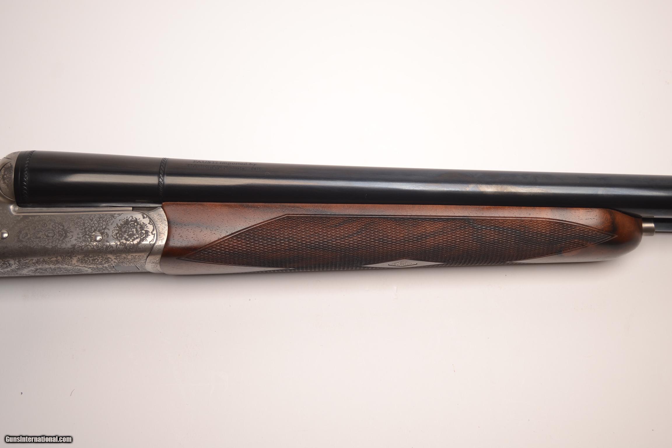 Description: FAUSTI – Round Body 16ga 28” IC/M, nicely figured straight grip stock, wood butt plate, double triggers, automatic ejectors, game rib, splinter forend, full coverage rose and scroll engraving over a coined finish receiver, gun appears unused, included factory case, excellent game gun.