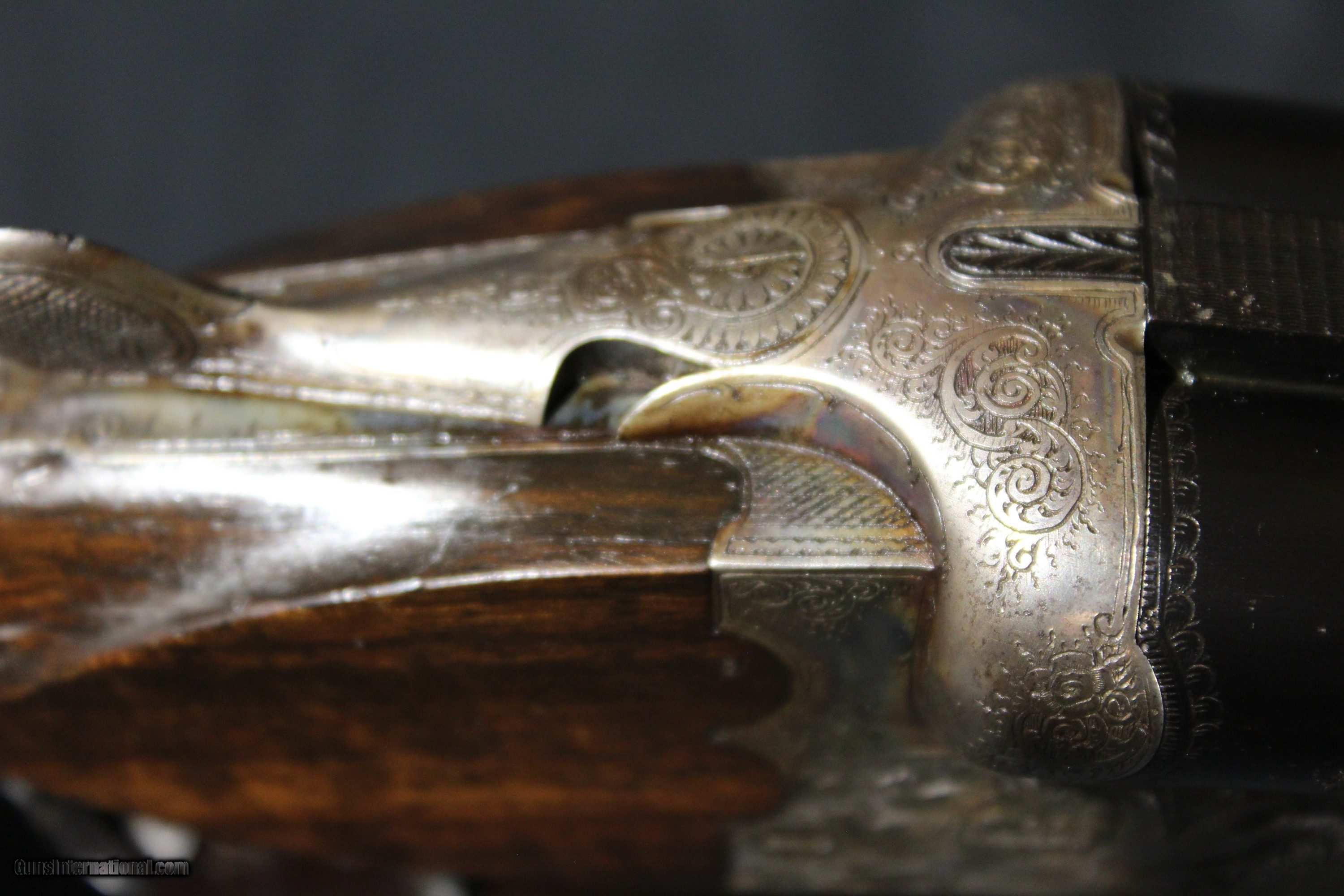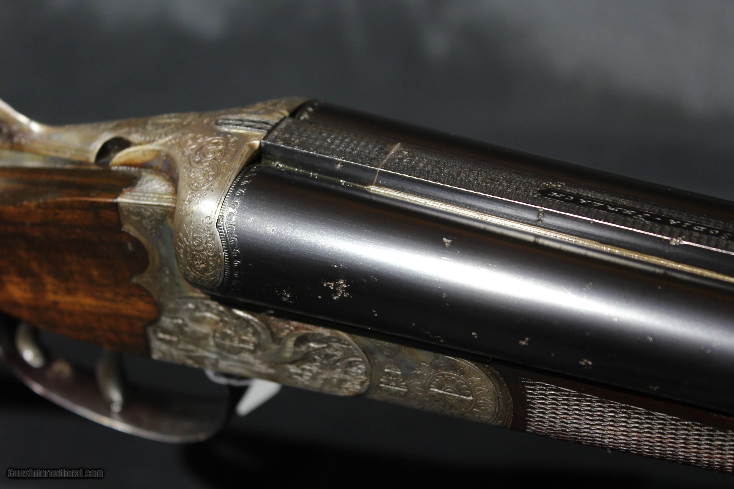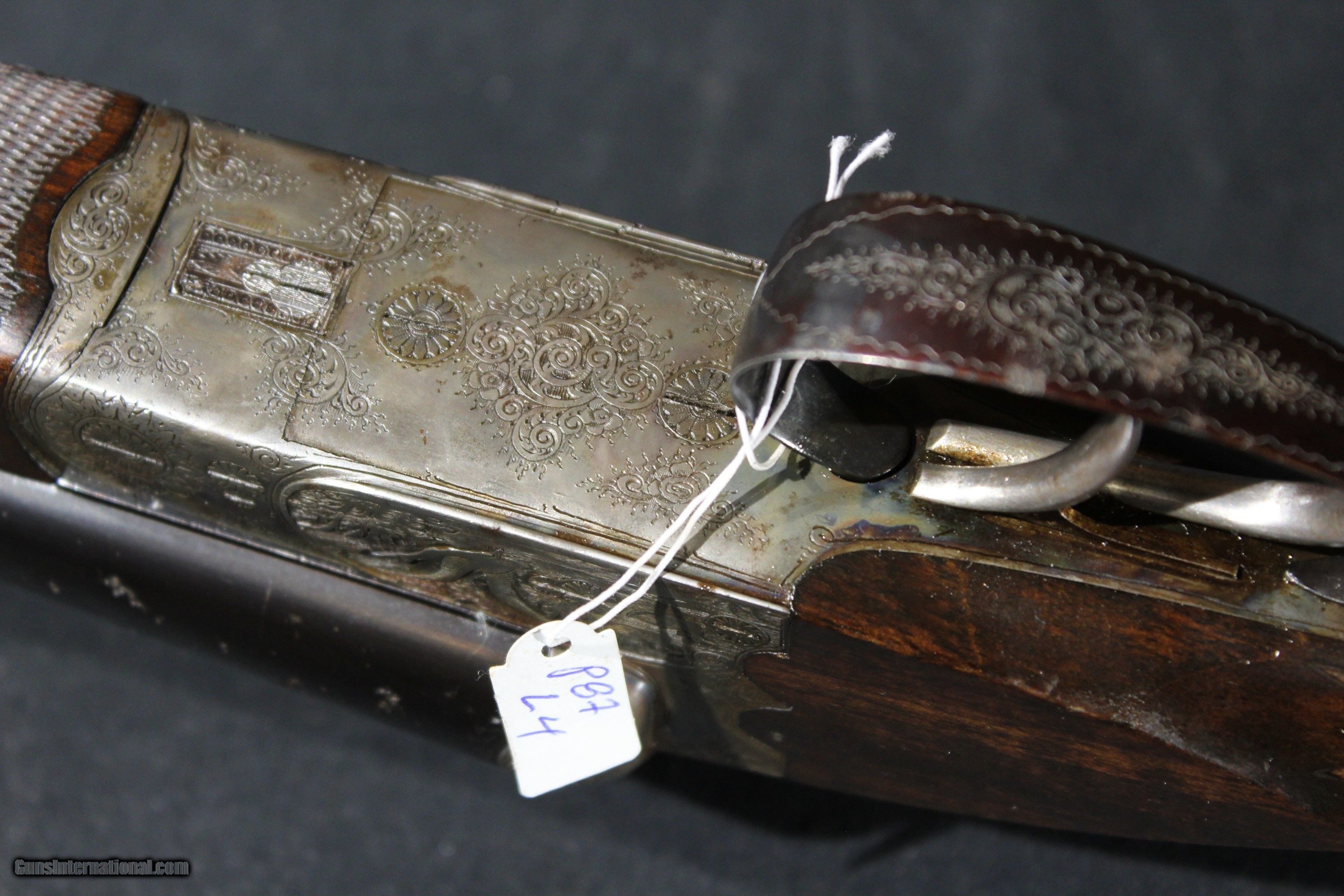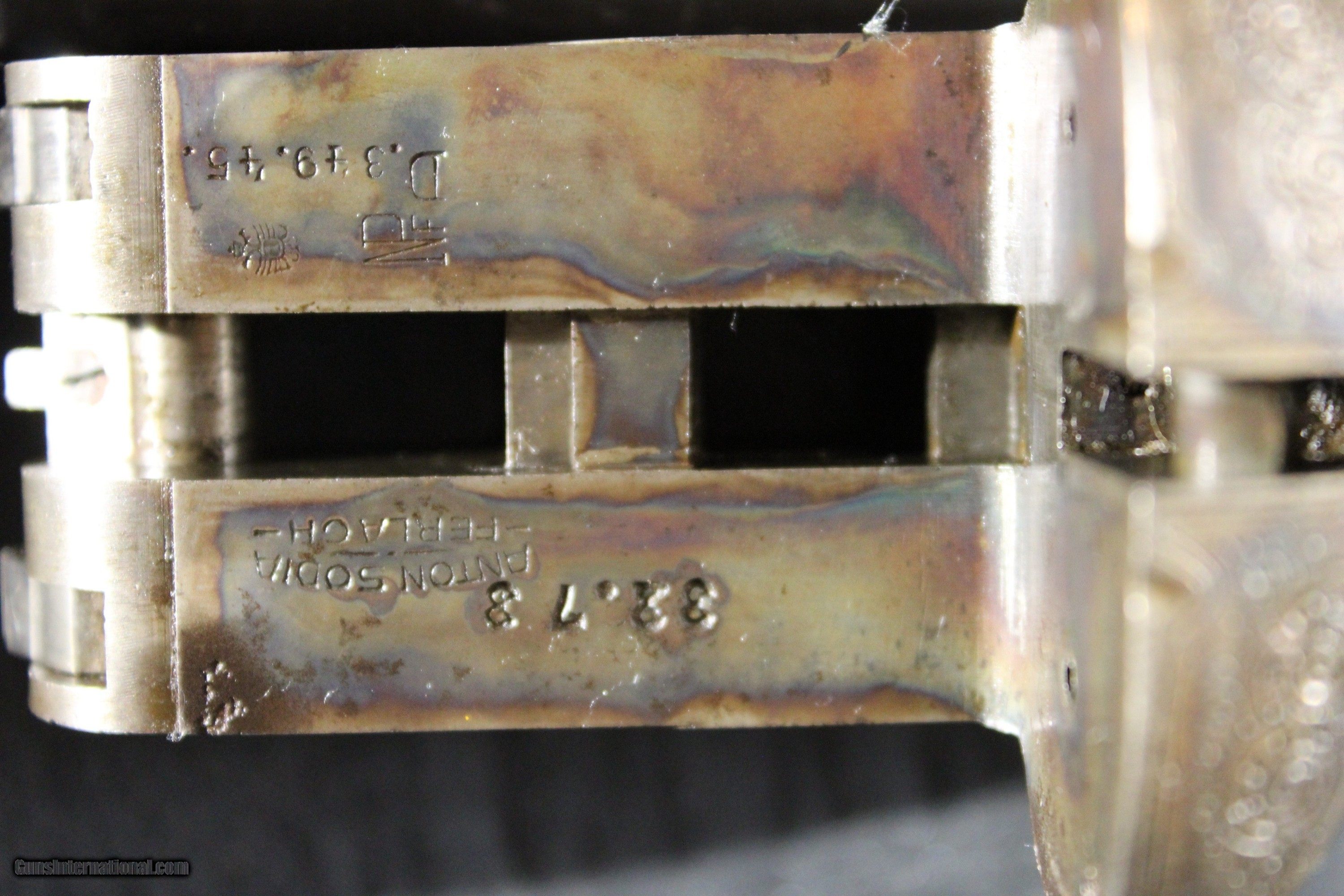 Description: Very Nice 12ga. 2 1/2" chambered 6.6 LB Ferlach SXS. LOP is 14 3/8" choked Full and Full. Gun has a 1 1/4" drop at comb and a 2 3/8" drop at heel. This Anton sxs is heavily engraved and would be in excellent condition except for Pitts on the outside of the barrels. (please see pictures) bores are excellent and ejectors work as new. all around a very nice sxs. Gun was made in 1945 SOLD Curio/Relic: Yes Shotgun Gauge: 12 Gauge Manufacturer: Anton Sodia Model: sxs Barrel Length: 28 Chambers: 21/2 Ejectors: yes Condition: very good Metal Condition: good Wood Condition: vg Bore Condition: excellent Choke Left: full Choke Right: Full Proof:Nitro: yes |