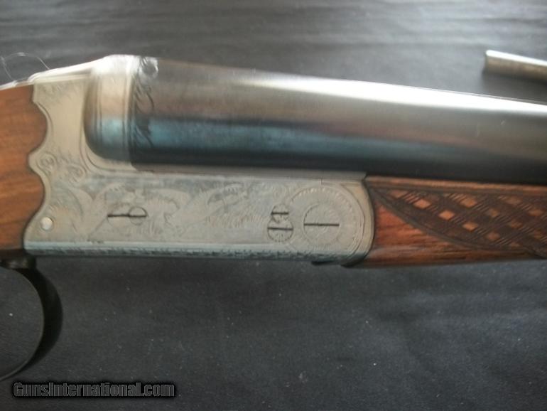 Description: by Josef Hambrusch, (Master Gunmaker), 28 1/2" swamp rib, bbls choked M/IC, single select trigger,extractor, full coverage exitic gamescenes of phesants, ducks & rabbit, gorgeous PG stock,,exquisite diamond cut skipline checkering, European cheekpiece, factory sling swivels, 6 lbs.7ozs, this little shotgun looks inas new condition overall, lightest of handling SOLD