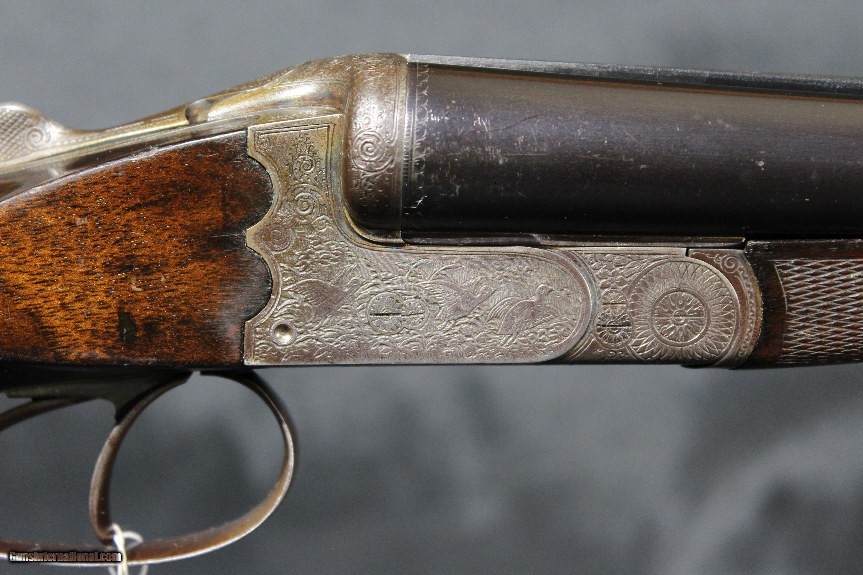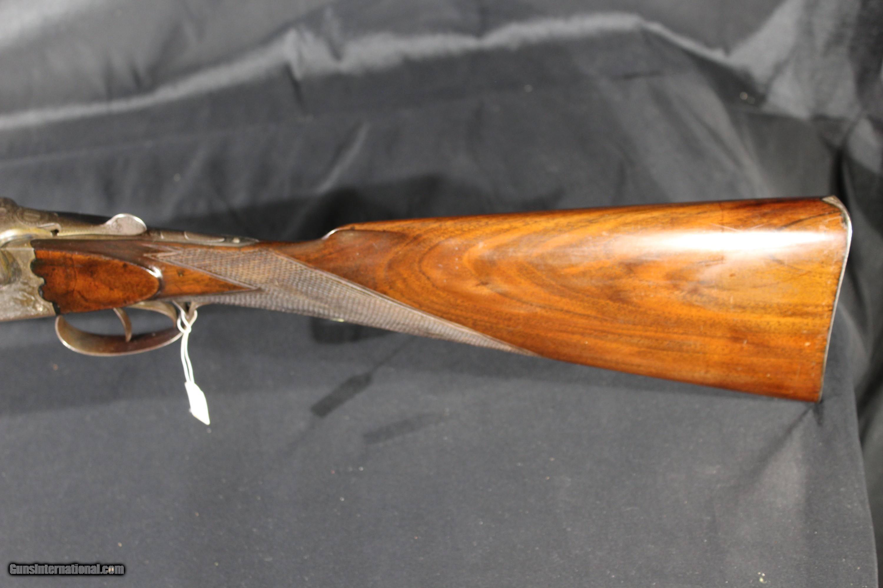 Description: Matted solid rib barrels with a bright front bead. Choked Full and Full. Chambers are 2 1/2"", with ejectors. "SEB. BOROVNIK FERLACH" on the Rib. Full coverage floral engraving with game scenes. Double triggers and tang safety. Length of pull is 14 3/8", drop at comb is 1 1/2", drop at heel is 2 5/8". Checkered forearm. Stell butt plate. Gun weighs in at 6.4LBS SOLD Shotgun Gauge: 12 Gauge Manufacturer: Seb Borovnik Model: BLE Serial Number: D.757.46 Barrel Length: 28 |