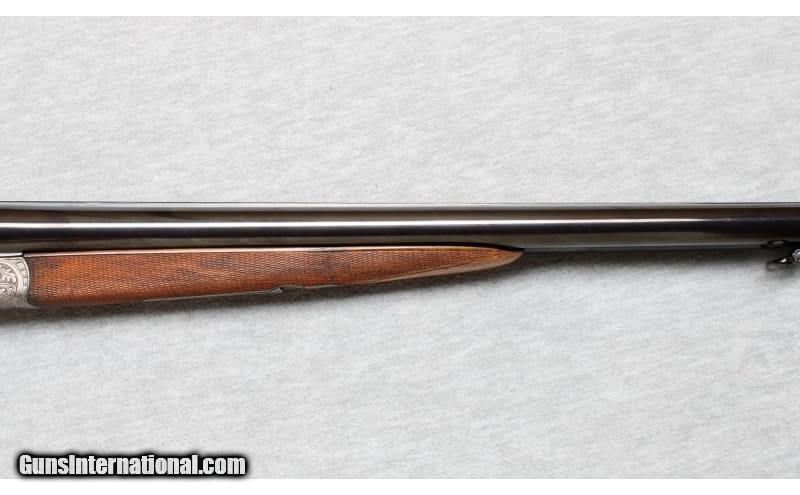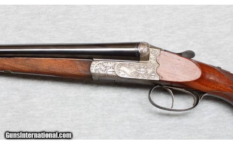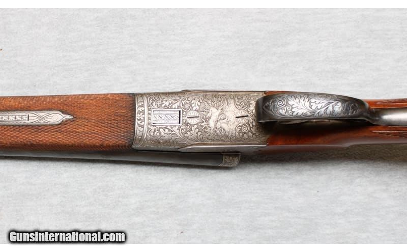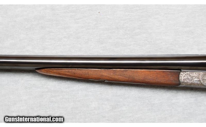 Description: Ferlach Austrian Guild Gun side by side shotgun in 20 Gauge. The age of the shotgun is unknown but since it has no importers marks, it is at least pre-1968. If features 26" Bohler barrels choked Improved Cylinder & Full. Excellent original blue on the barrels. Receiver is in the white with fine engraving and relief carvings of a European Stag on the left, A Hare on the bottom, and a Fox and Mallard on the right . The wood has a straight grain with a scant cheekpiece buttstock for right hand shooter. LOP is 13 1/2". Original sling swivels are present. All bores are bright as if unfired. The action is tight and precise as a vault. The overall condition is excellent. 20 Gauge SOLD Chambers: 2 3/4 Inches Metal Condition: Excellent Wood Condition: Excellent with minor handling marks Bore Condition: Bright Barrels: 26 Inches Triggers: Doulble triggers Stock Dimensions: 13 1/2 Inches Fore End: Checkered walnut Butt Pad: Plastic pad Sights: Single brass bead on a game rib Chokes: IC/Full Item Location: La Vista, NE |