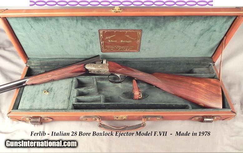 Description: #33290, Ferlib, Gardone V.T., Italy: A Ferlib 28 Bore Boxlock Ejector Game Gun Made in 1978, Model 7 F.VII, 27 1/4" Ejector dovetail lump barrels at .567 .019 & .040" (Imp.Mod. & Extra Full), 2 3/4" chambers, Correct bore size as proved at 14.4mm, KG 1,060 weight barrels, Matted flat concave top rib, Single non-selective trigger, Scalloped action back, A very slight beavertail forend, Straight hand stock at 14 1/16 x 1 1/2 x 2 3/8" over a full face checkered butt, Neutral stock for the right or left hand, 5 lbs. 8 oz., 90% coverage of scroll and game bird engraving by Gobbi on a soft coin finished frame, A decent piece of European Walnut with nice contrast, This piece is with original barrel blue at 99%, The coin finished frame at 99%, The stock and forend at 99%, The checkering at 100%, The barrels inside & out are as new, They ring with a very pronounced chime. The whole is cased in a leather cornered leather trunk with the makers trade label. Here is a Classic Italian game gun with the proper size action body for 28 Bore fun by a quality gunmaking firm. SOLD  |