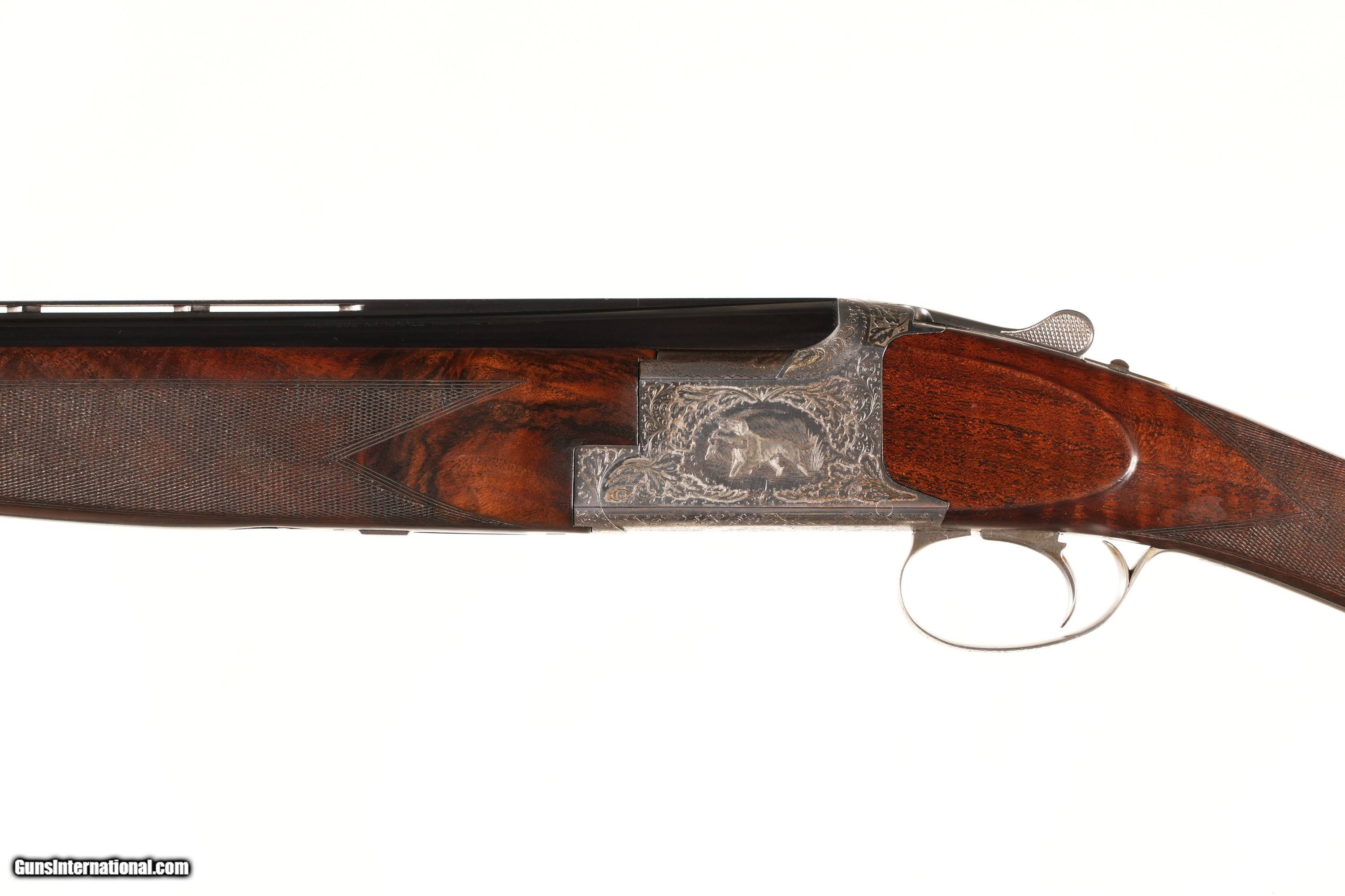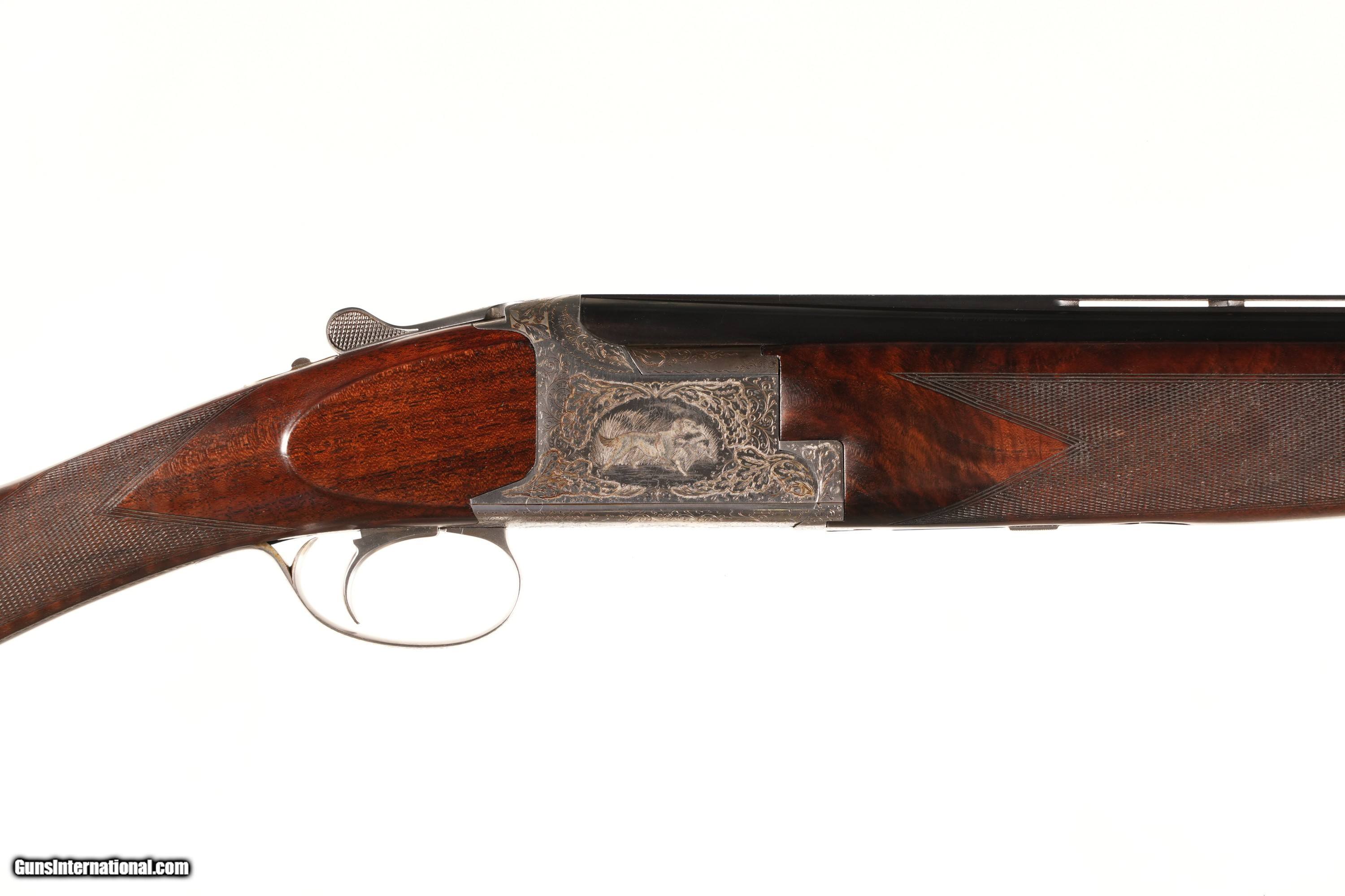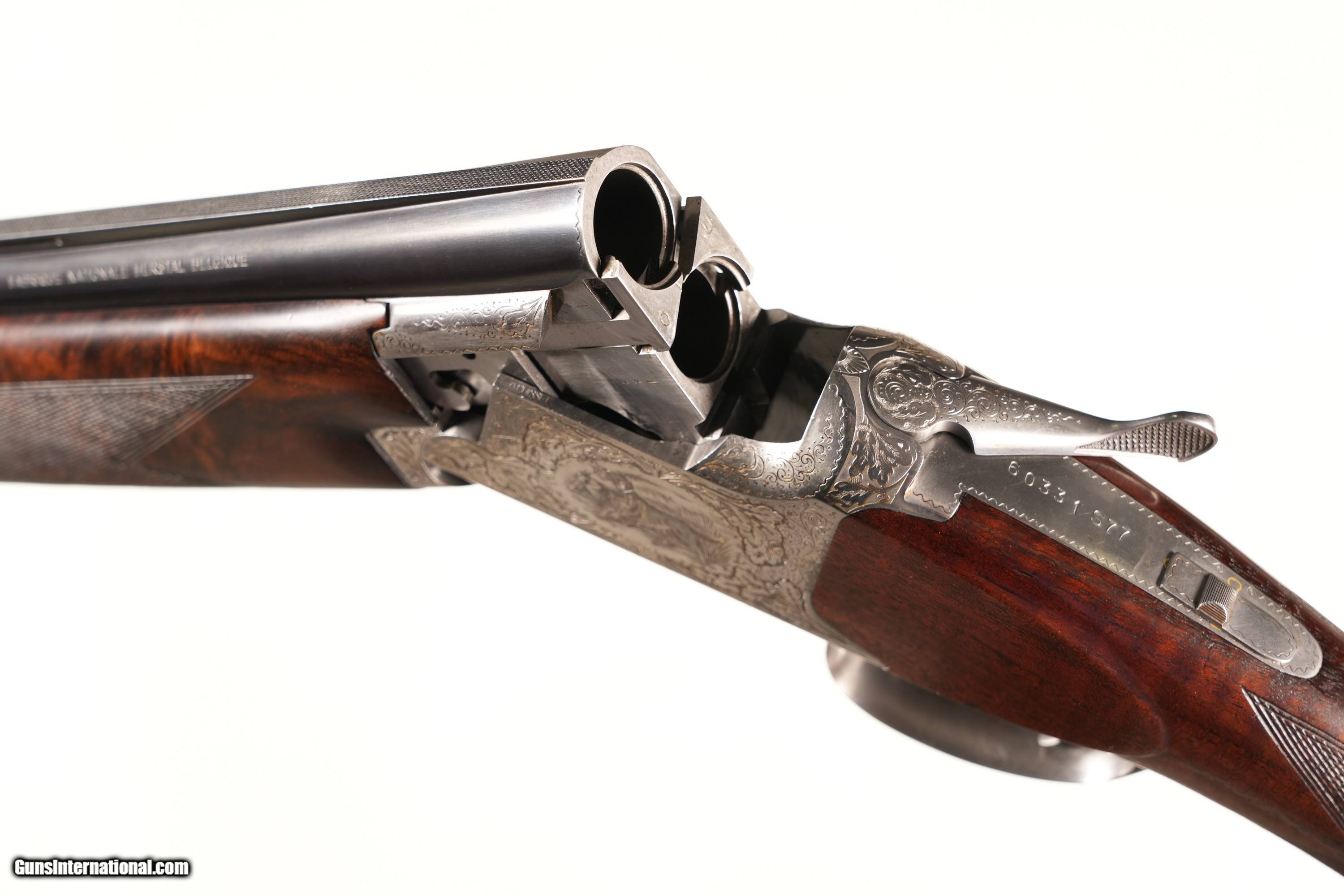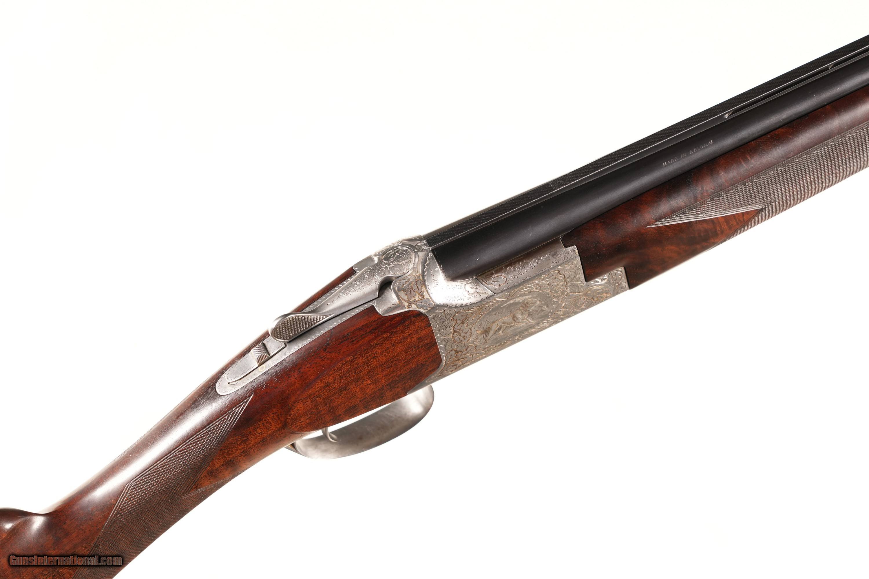 Description: Fabrique Nationale B5-4 Superposed Over/Under Shotgun – 12 Gauge – 28" Barrels, Oak Leaf & Game Scene Engraving Serial #60331 S77 | Mfd 1977 | 2 ¾" Chambers | Factory Engraved | Roachbelly Stock (Swan Neck) A finely finished Fabrique Nationale B5-4 Superposed 12 Gauge, manufactured in 1977 and engraved with distinctive oak leaf & acorn motifs combined with wildfowl retriever game scenes. Features 28" vent rib barrels, choked Improved Modified & Improved Cylinder, and fitted with a single selective trigger and automatic ejectors. The coin-finished receiver is engraved with Germanic oak leaves, bordered scroll, and two detailed vignettes of a retriever with waterfowl—an uncommon and elegant theme. Mounted with a roachbelly-style checkered walnut stock and Browning butt plate.