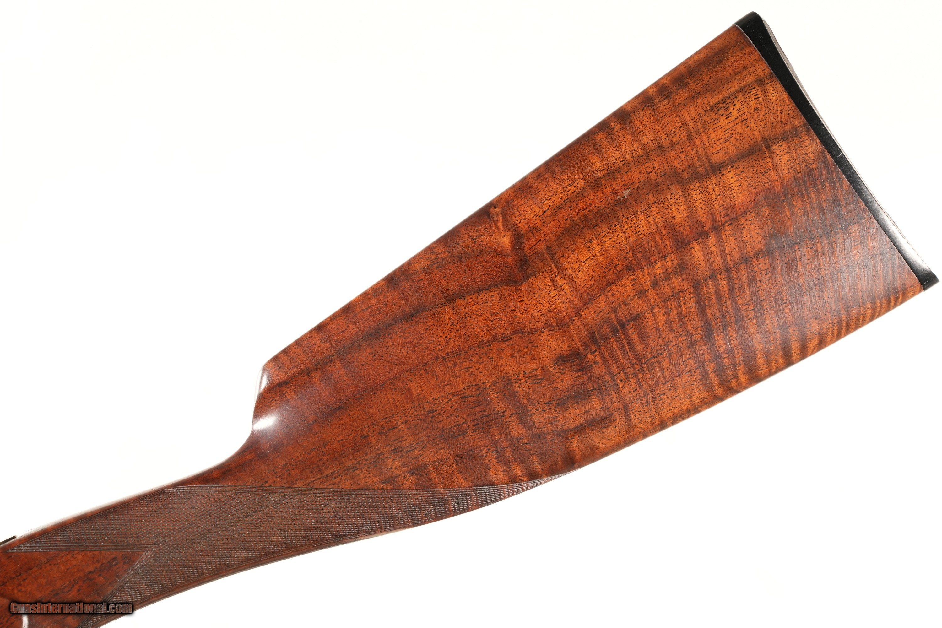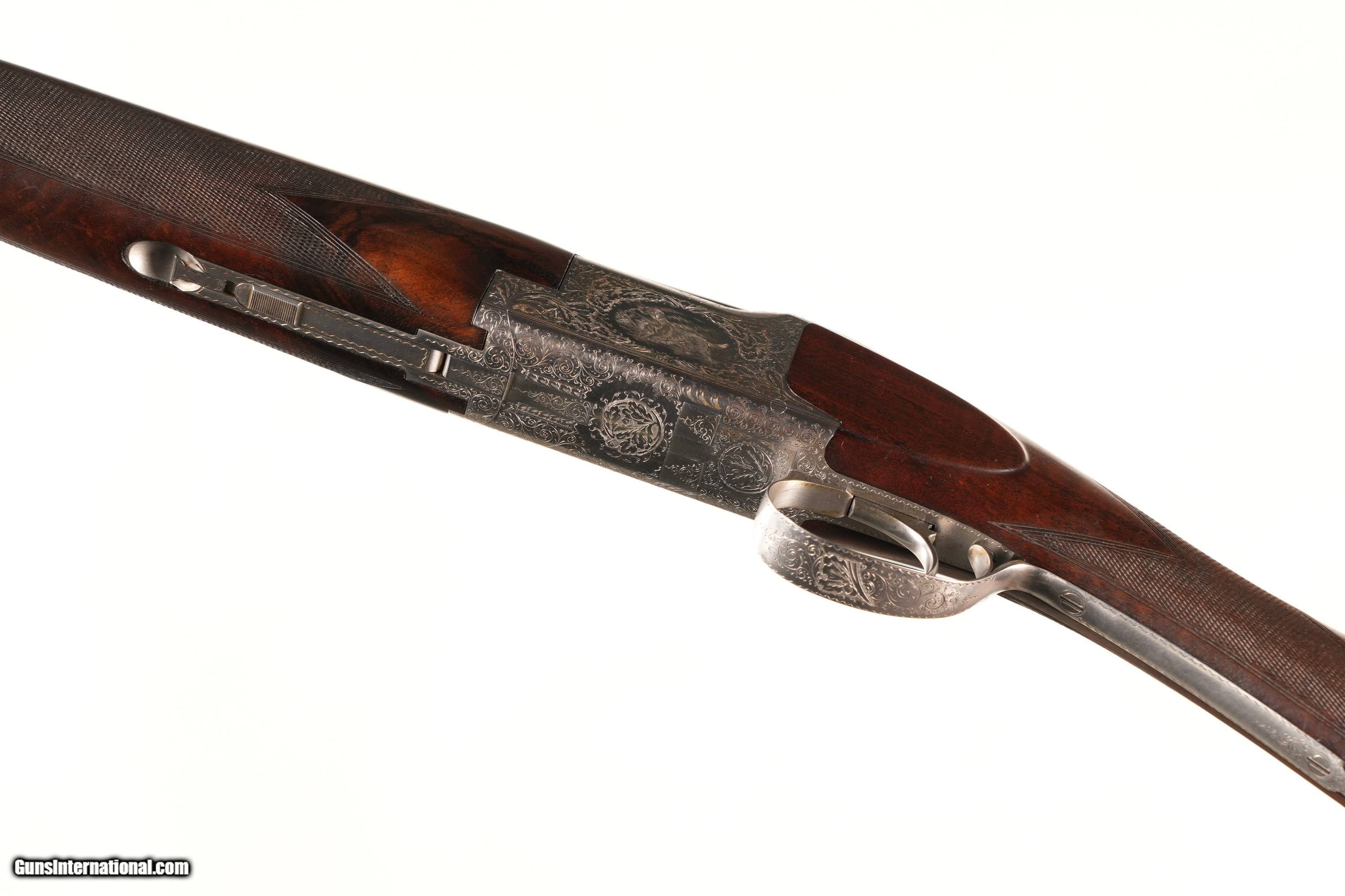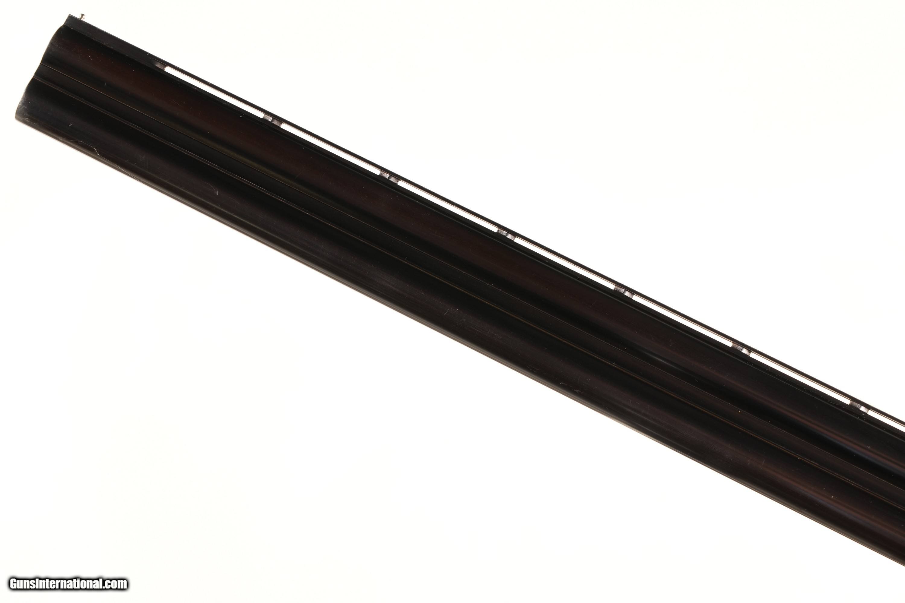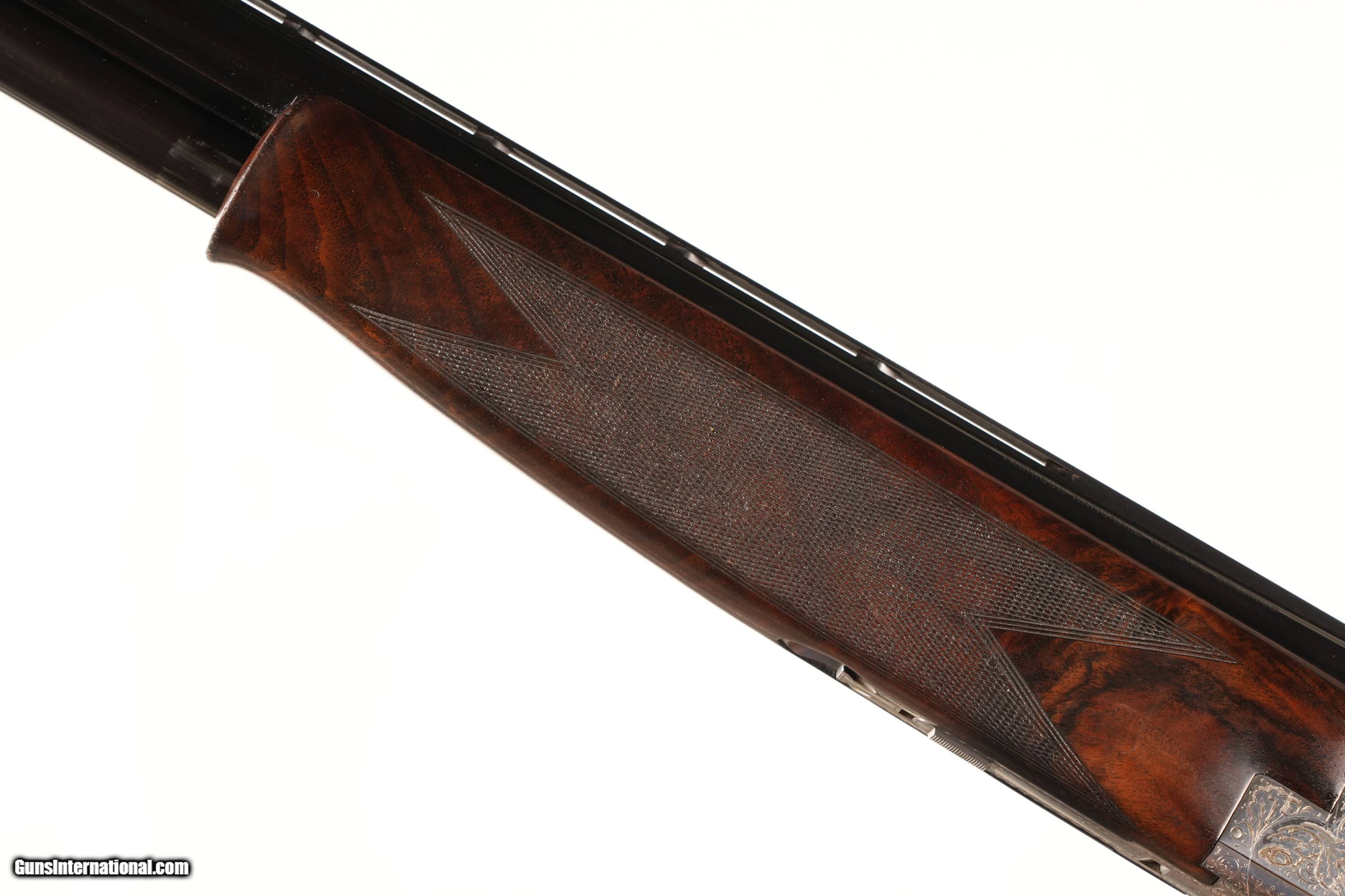 Description: Fabrique Nationale B5-4 Superposed Over/Under Shotgun – 12 Gauge – 28" Barrels, Oak Leaf & Game Scene Engraving Serial #60331 S77 | Mfd 1977 | 2 ¾" Chambers | Factory Engraved | Roachbelly Stock (Swan Neck) A finely finished Fabrique Nationale B5-4 Superposed 12 Gauge, manufactured in 1977 and engraved with distinctive oak leaf & acorn motifs combined with wildfowl retriever game scenes. Features 28" vent rib barrels, choked Improved Modified & Improved Cylinder, and fitted with a single selective trigger and automatic ejectors. The coin-finished receiver is engraved with Germanic oak leaves, bordered scroll, and two detailed vignettes of a retriever with waterfowl—an uncommon and elegant theme. Mounted with a roachbelly-style checkered walnut stock and Browning butt plate.
