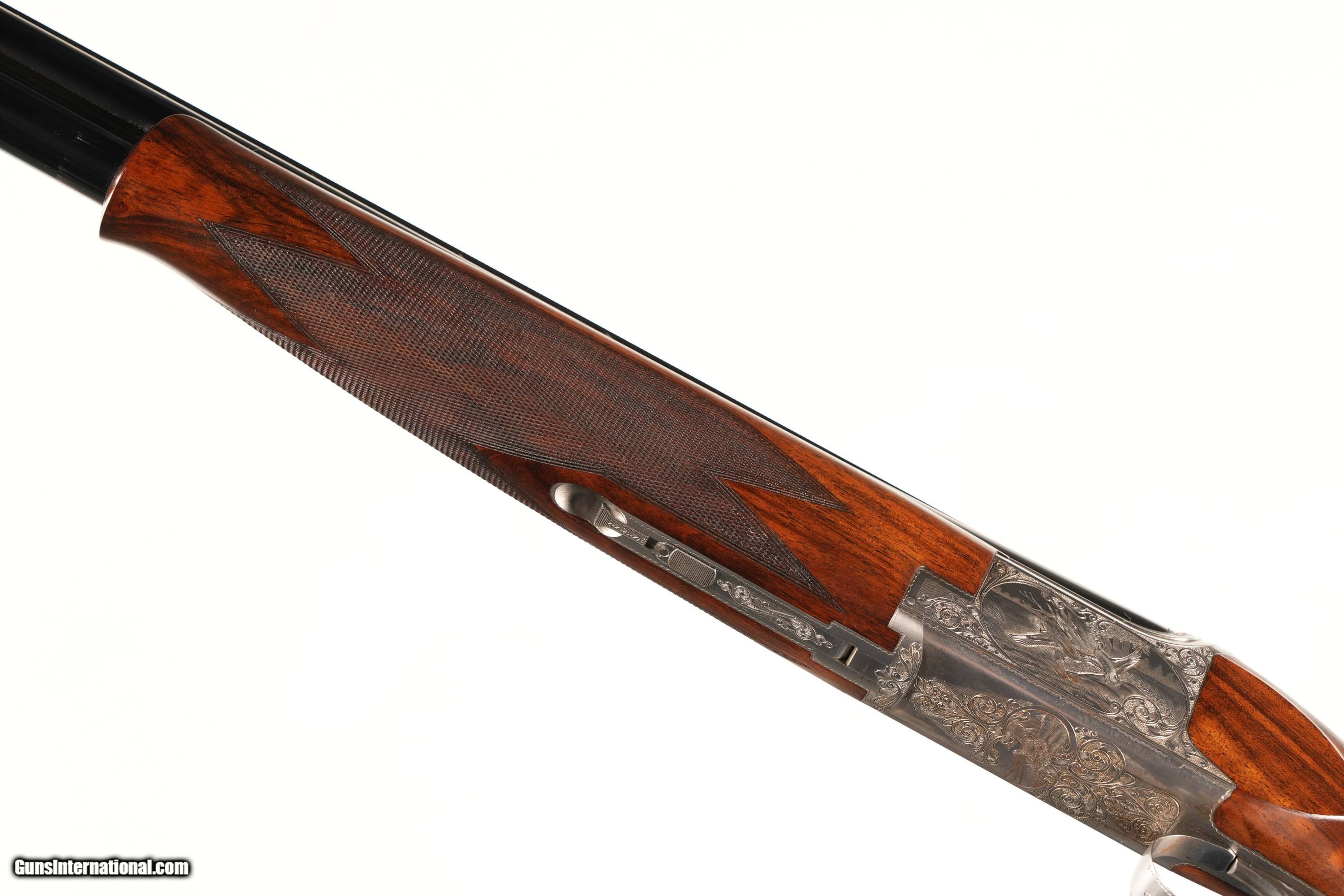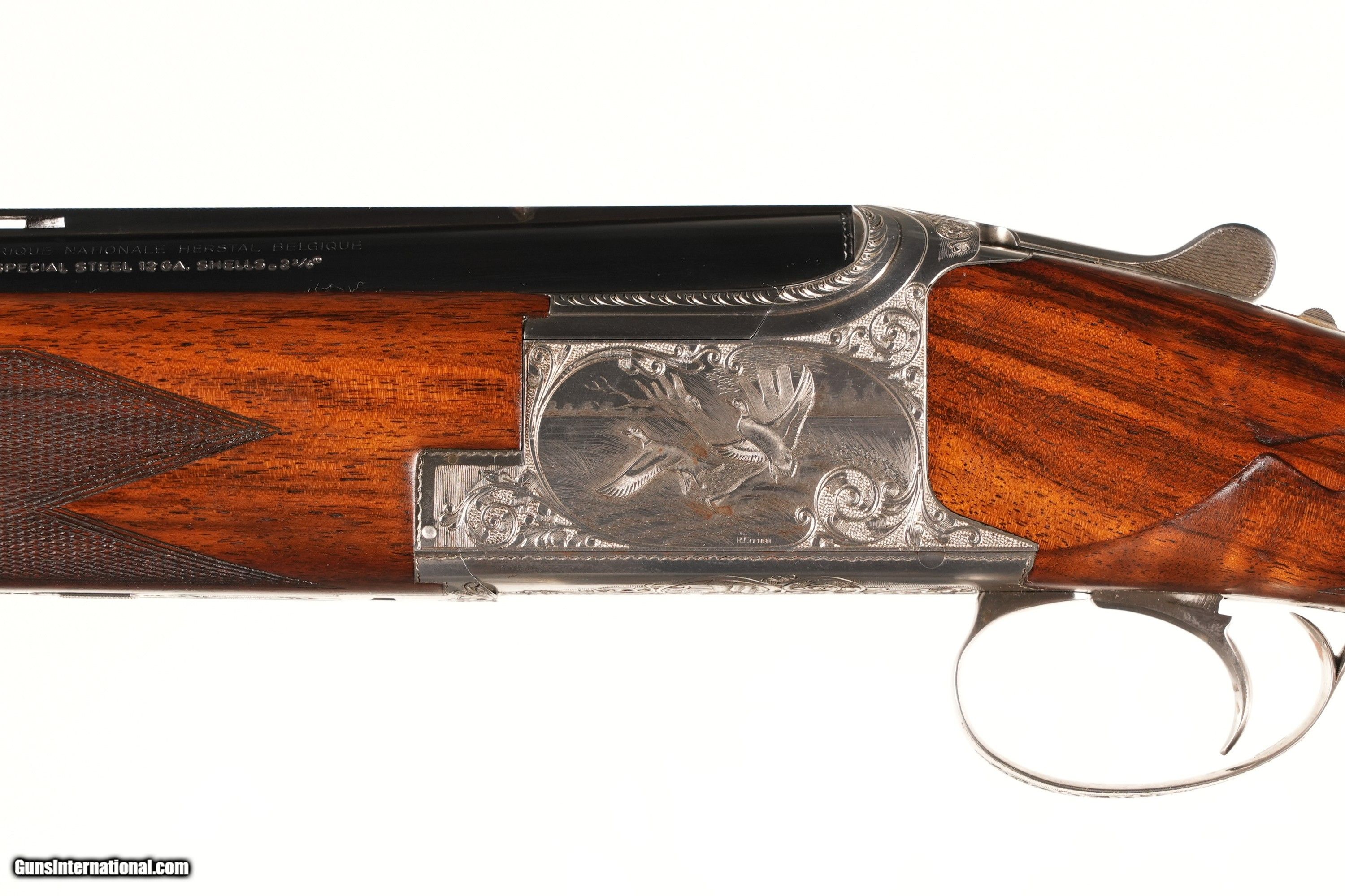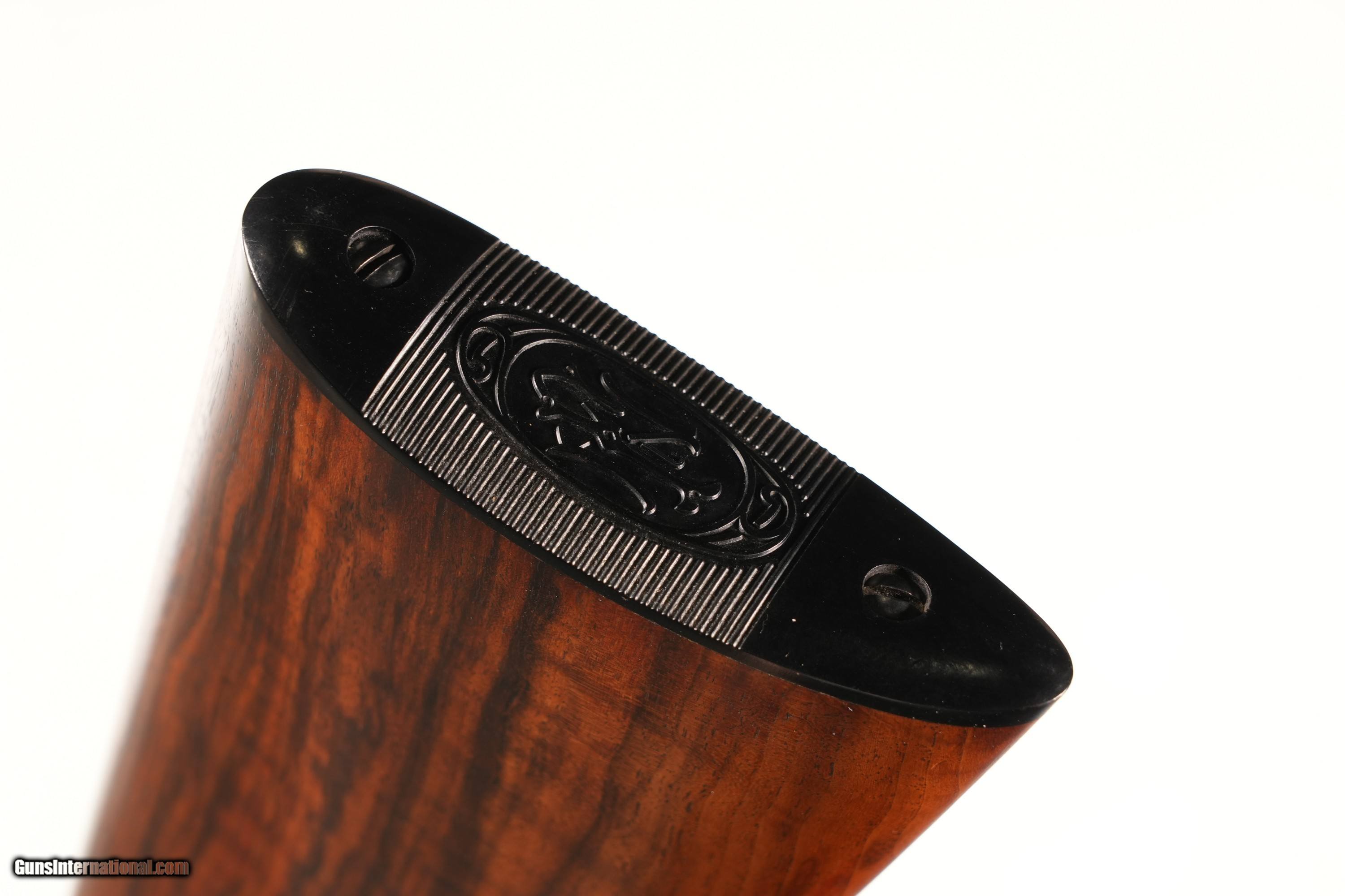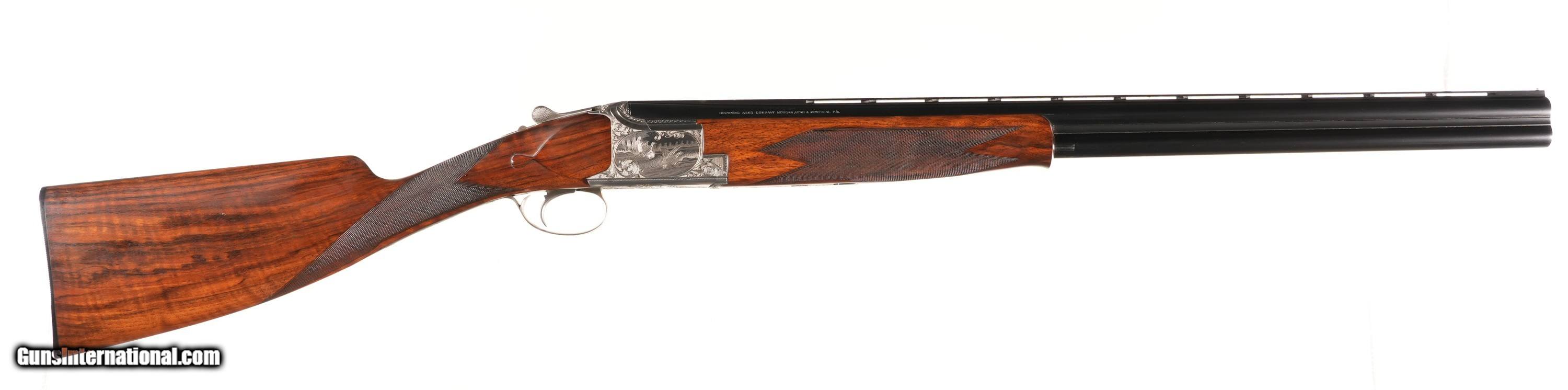 Description: R. Coenen Engraved Fabrique Nationale C2G Superposed 12 ga with 28"vent rib Bbl choked IM & IC with single selective trigger and ejectors. French grey finished receiver masterfully engraved with game scene vignettes of waterfowl, pheasants,and quail. Scarce oil finished finely checkered straight grip stock with factory butt plate. Mfd 1975.14 1/4" LOP 1 1/2" DAC 2 1/4" DAH Cast off 5mm 6 lbs 12 oz Condition, Extremely fine with excellent finishes and light use. Mechanically fine • Free Shipping, No Credit Card Fees. • Lay-a-way available for this firearm. • 1/3 Down, a 1/3 in 30 Days 1/3 in 60 Days. SOLD Shotgun Gauge: 12 Gauge Manufacturer: FN Browning Model: C2G Serial Number: 54760S75 Barrel Length: 28 |