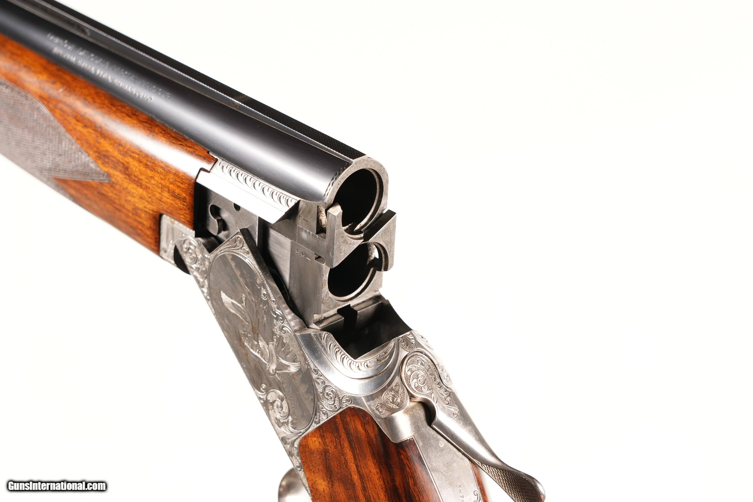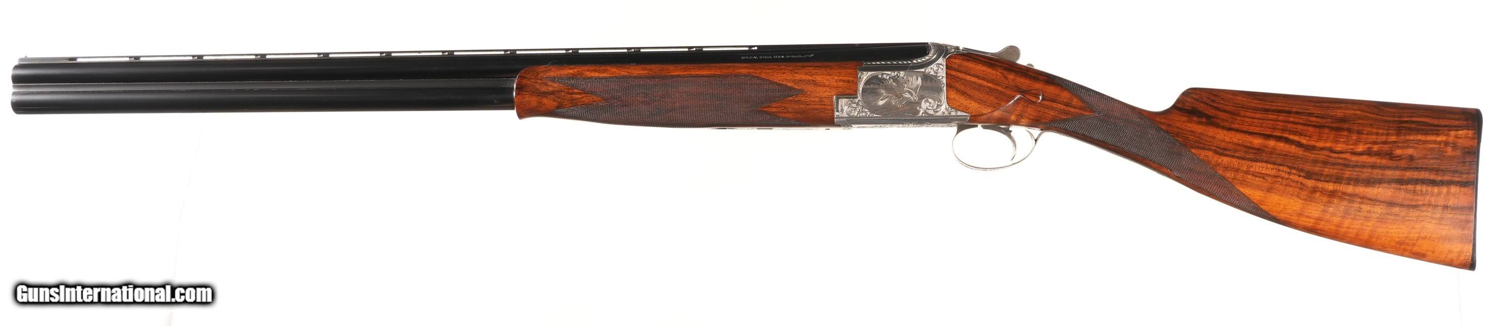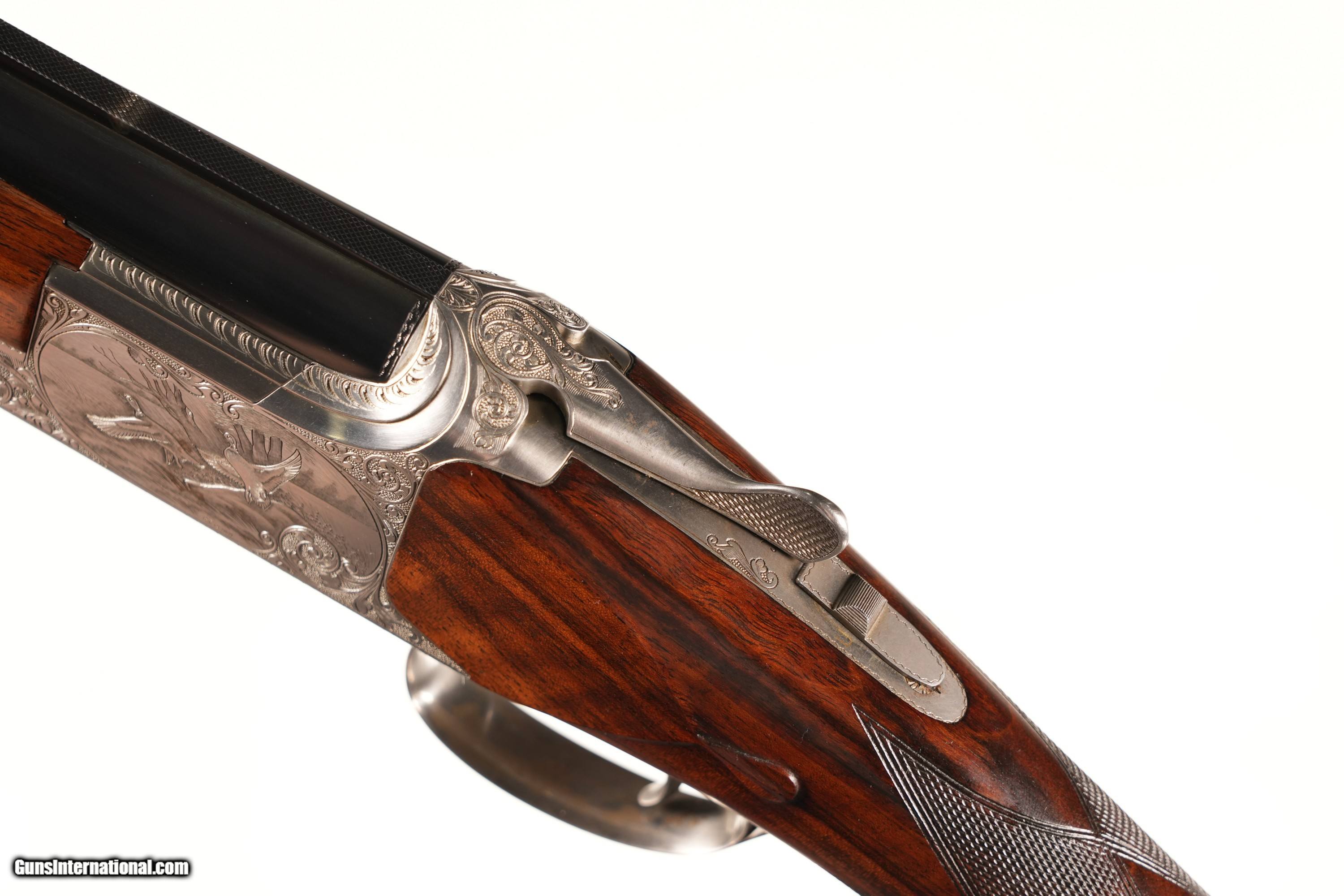Description: R. Coenen Engraved Fabrique Nationale C2G Superposed 12 ga with 28"vent rib Bbl choked IM & IC with single selective trigger and ejectors. French grey finished receiver masterfully engraved with game scene vignettes of waterfowl, pheasants,and quail. Scarce oil finished finely checkered straight grip stock with factory butt plate. Mfd 1975.14 1/4" LOP 1 1/2" DAC 2 1/4" DAH Cast off 5mm 6 lbs 12 oz Condition, Extremely fine with excellent finishes and light use. Mechanically fine • Free Shipping, No Credit Card Fees. • Lay-a-way available for this firearm. • 1/3 Down, a 1/3 in 30 Days 1/3 in 60 Days. SOLD Shotgun Gauge: 12 Gauge Manufacturer: FN Browning Model: C2G Serial Number: 54760S75 Barrel Length: 28 |